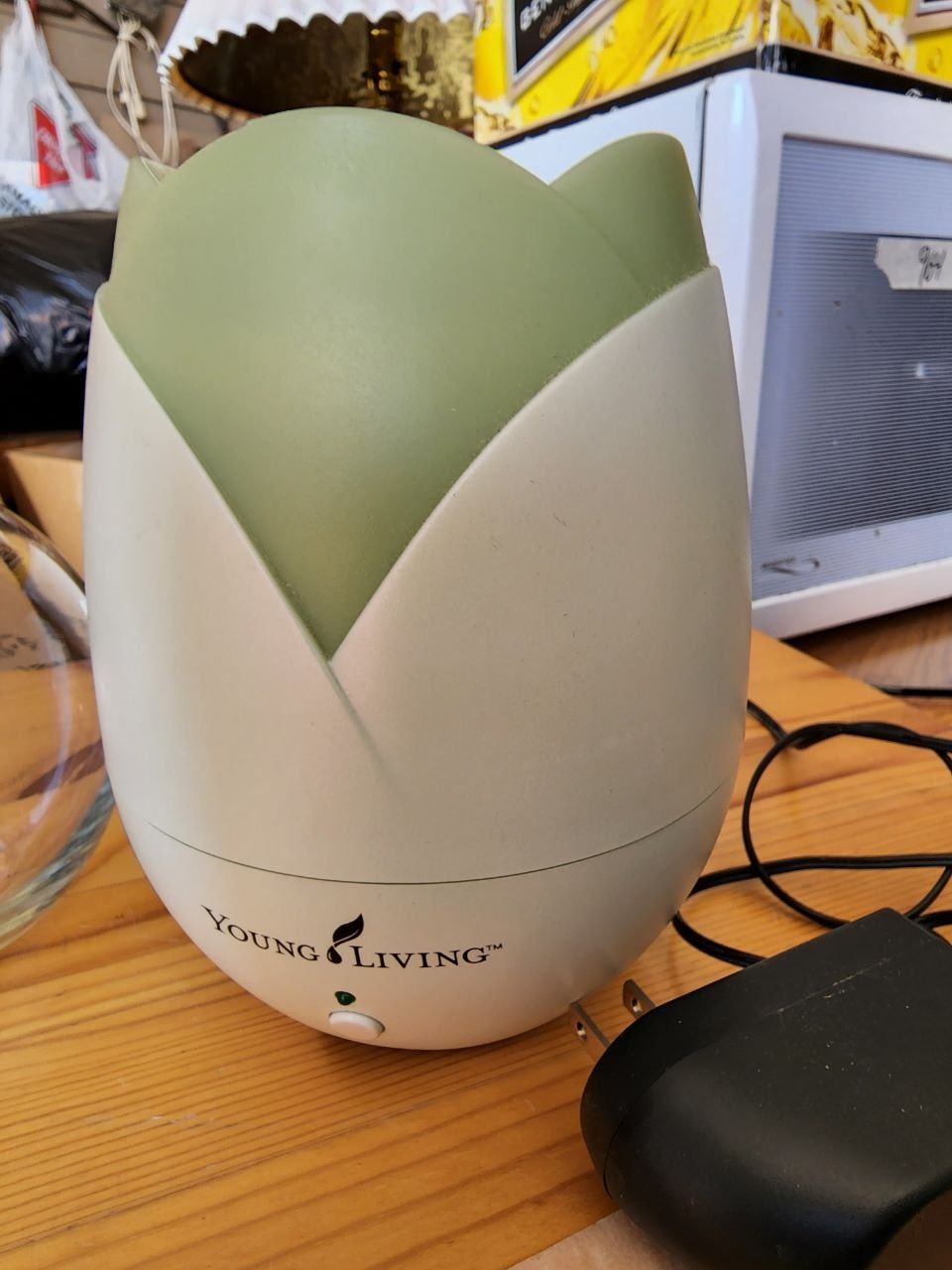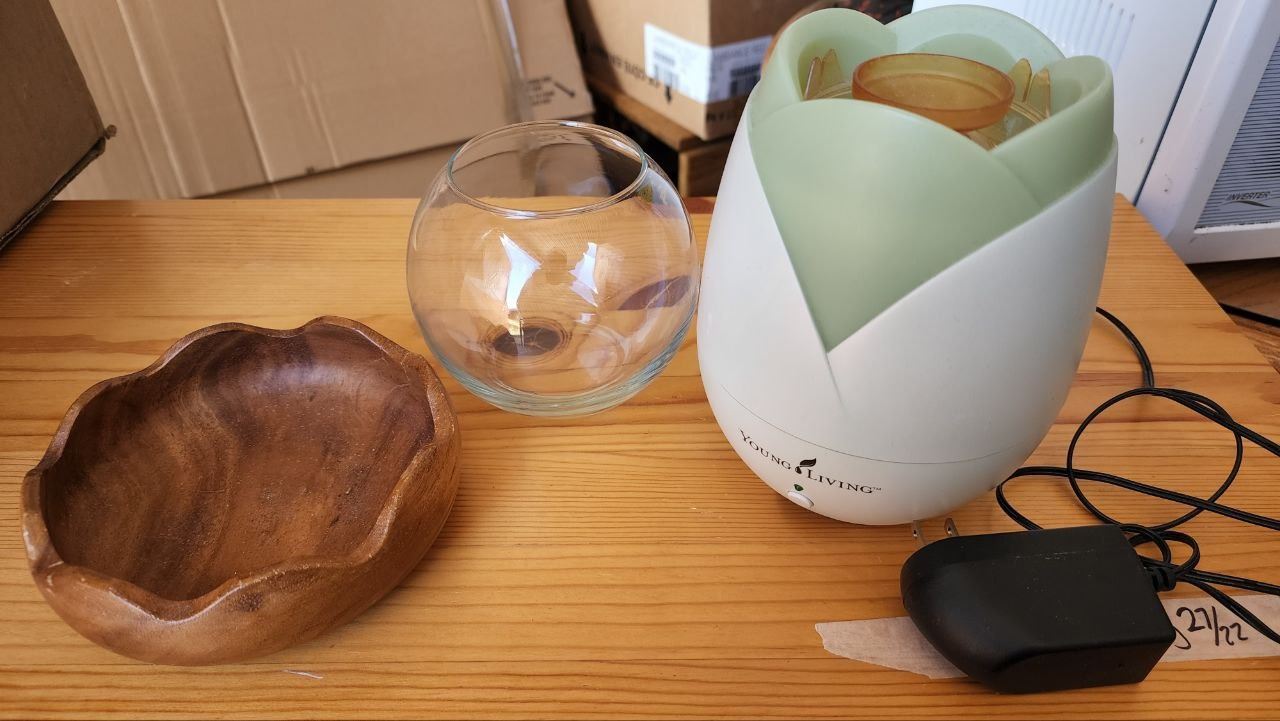 Assorted Household Items, "Young Living" Essential Oil Diffuser, Ash Tray and Glass Bowl
