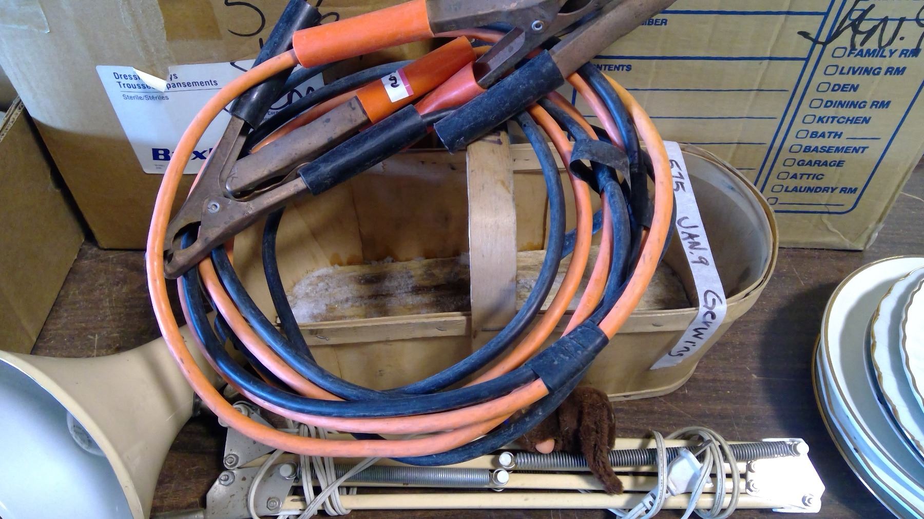Assorted Lot - Jumper Cables, Basket, Lamp