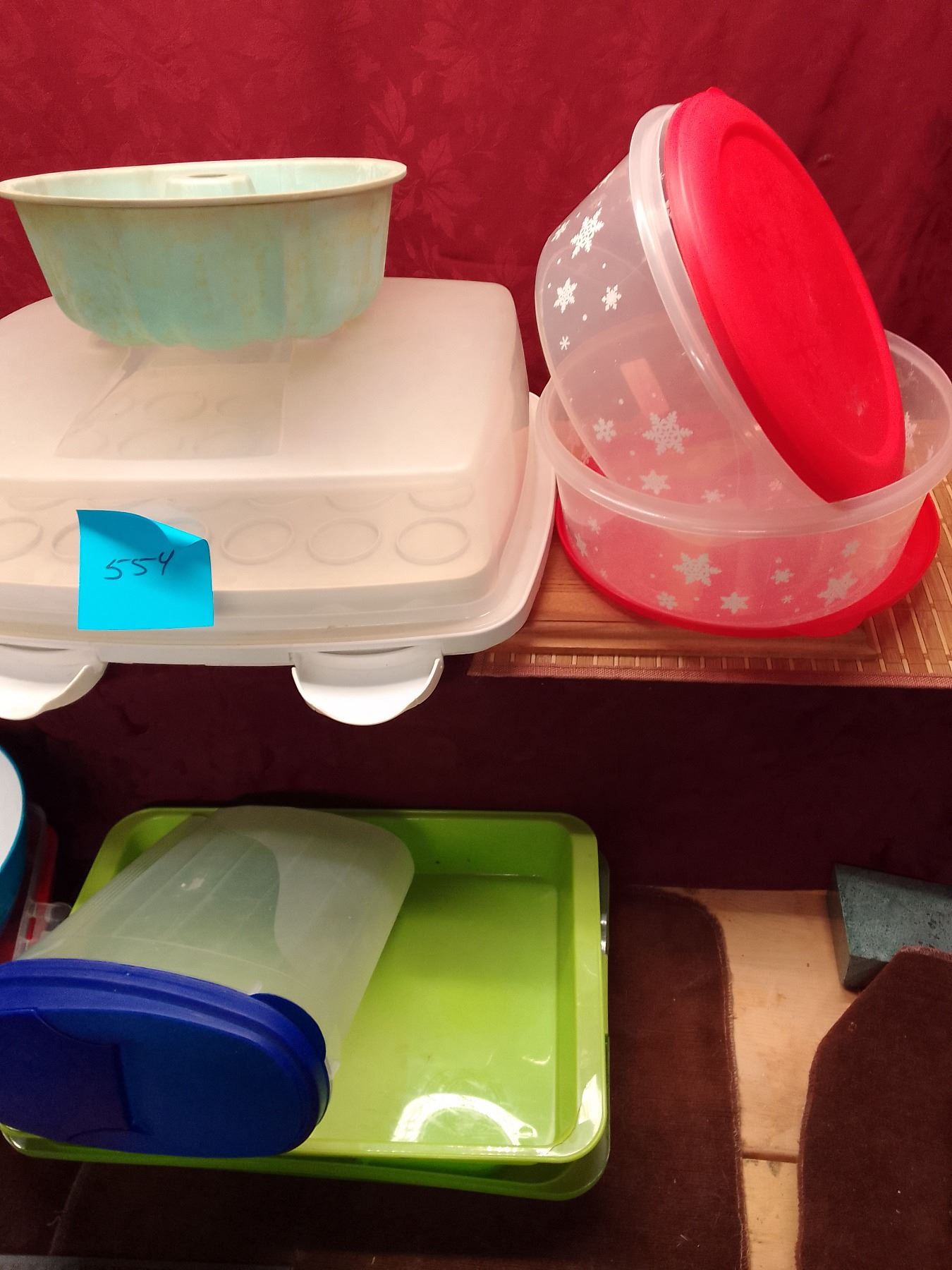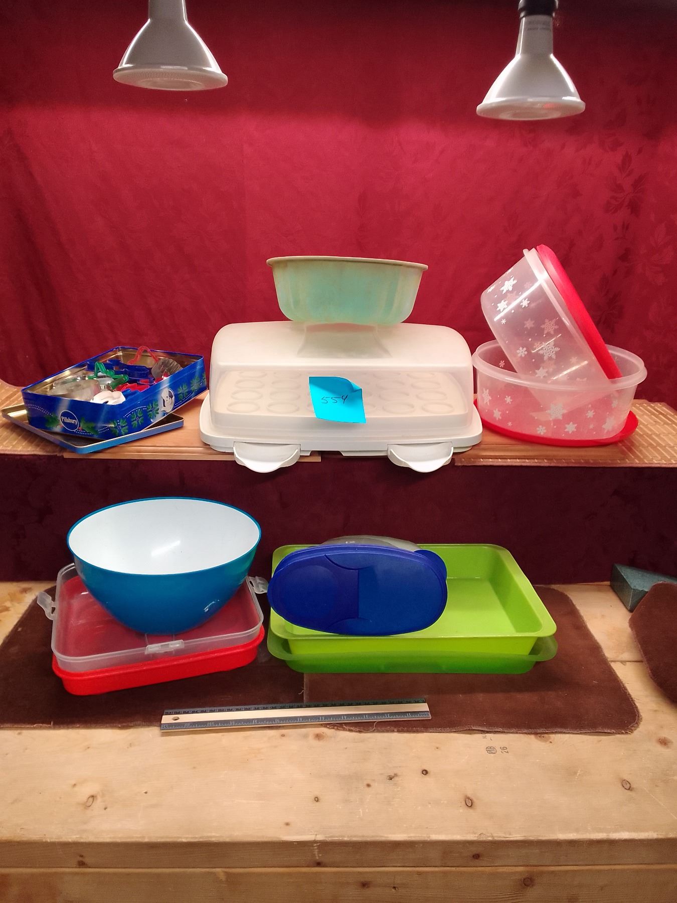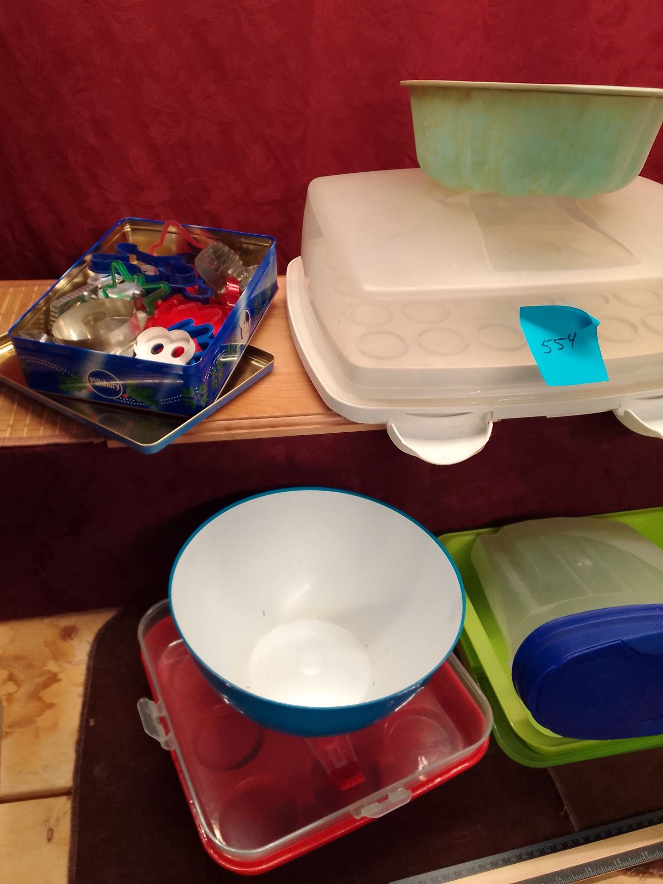 Assorted Plastic Kitchen Storage, tin of cookie cutters…