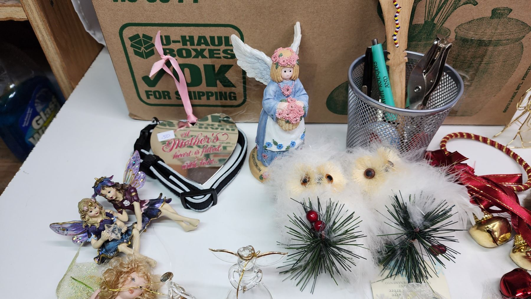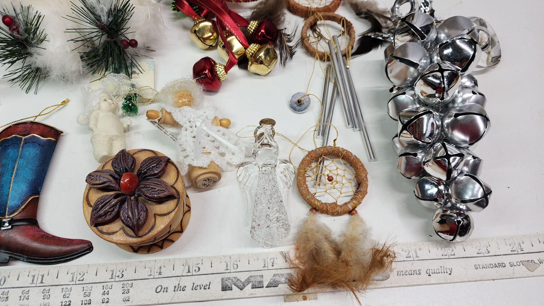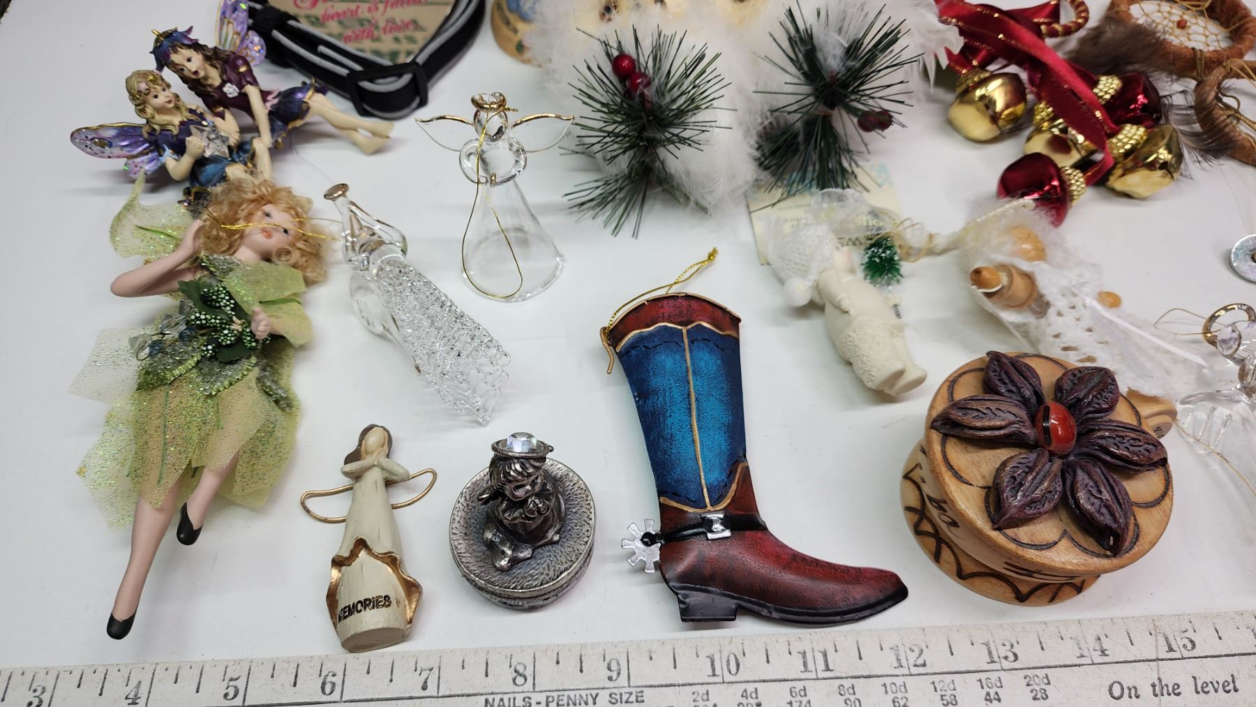 Assorted decorative items - Christmas bells, fairy figurines, dream catcher, Christmas ornaments, et