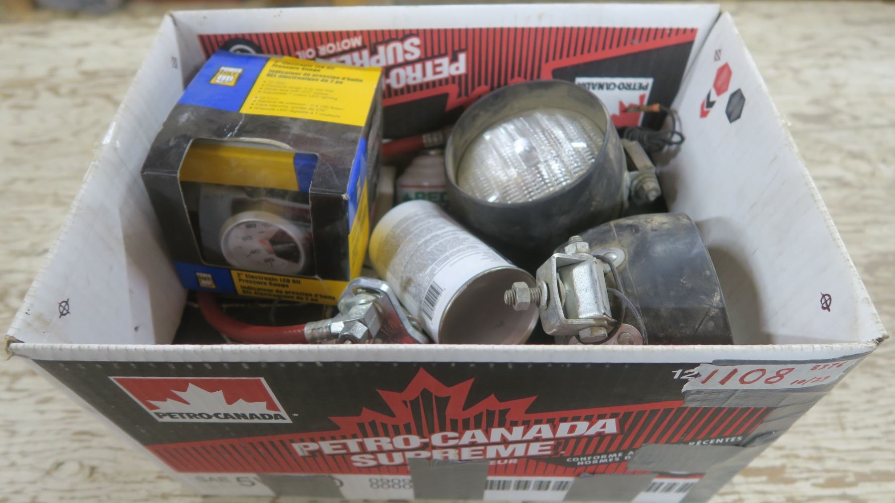 Assorted electrical: 4 circular lights, Ammeter, 4 Cans of 12a Refrigerant, Kohler Muffler, Hose, 2" Electronic LED Oil Pressure Gauge