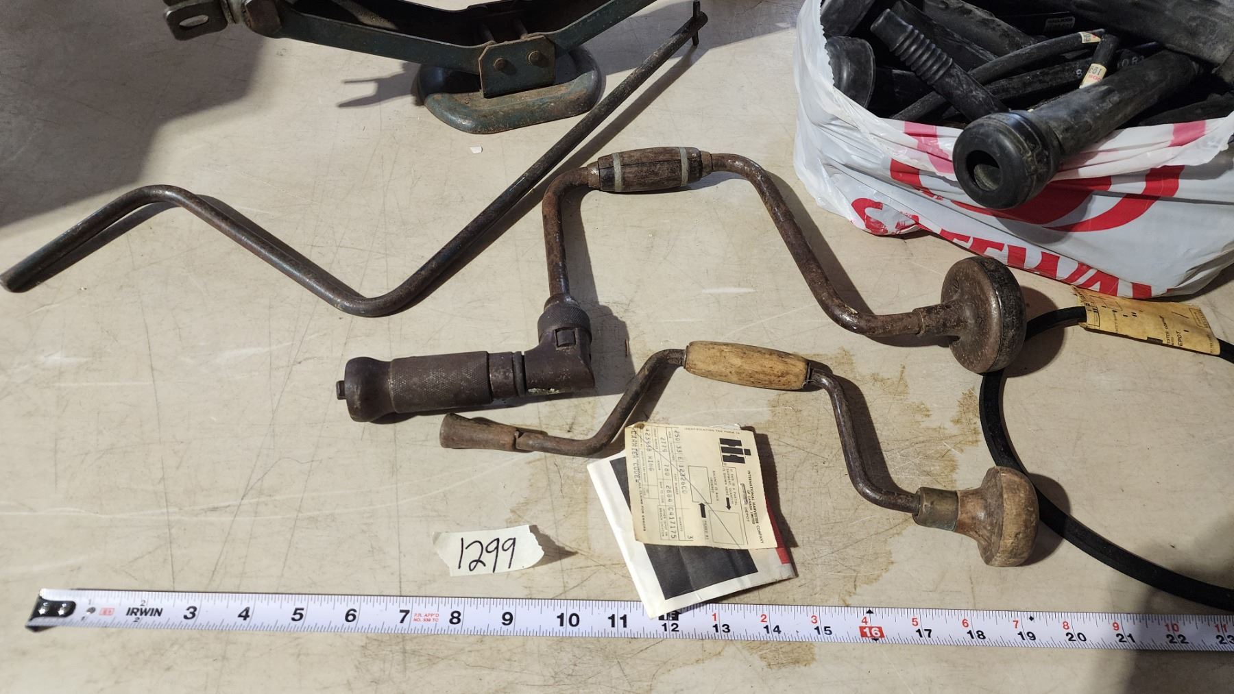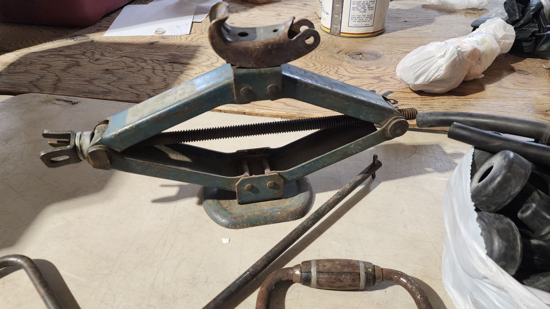 Assorted hardwares - Bundle of rubber cow milking tubes, car jack & vintage screw drivers