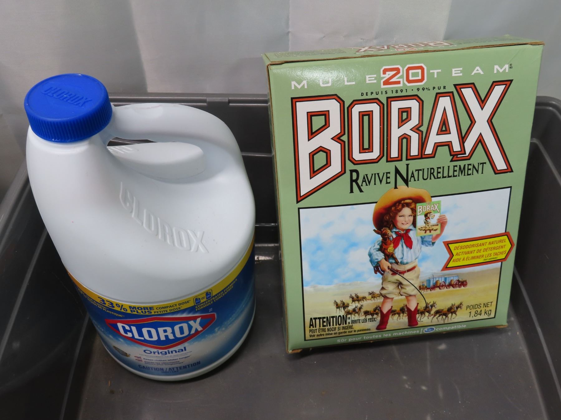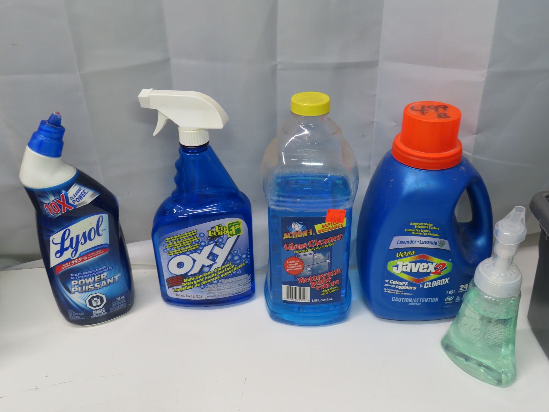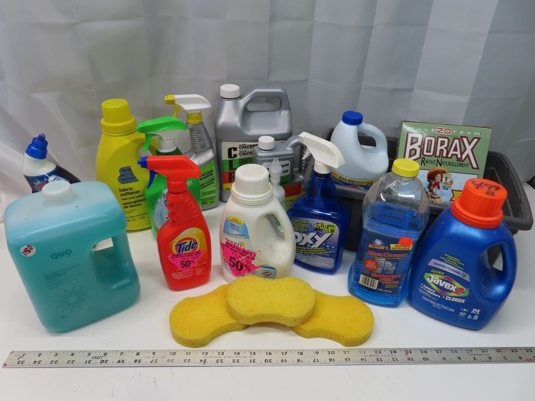 Assorted household cleaning supplies/sprays, etc. + Plastic storage container
