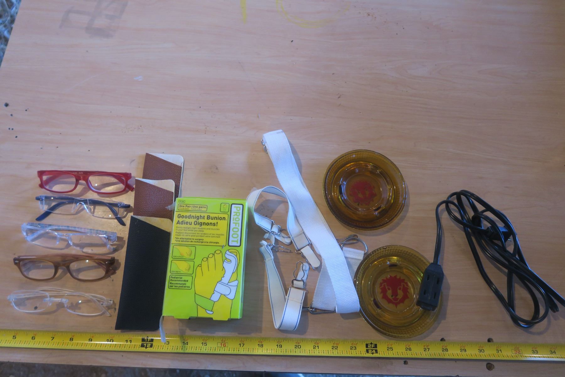 Assorted lot of glasses, ash trays, extension cord, bunionprofoot and suspenders