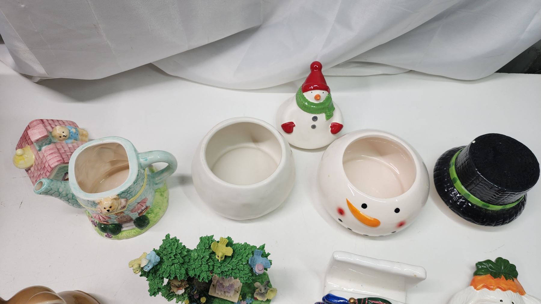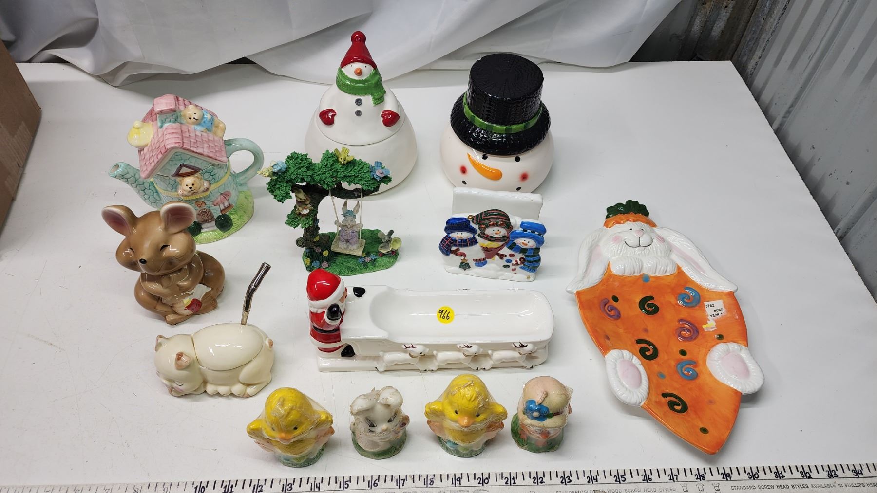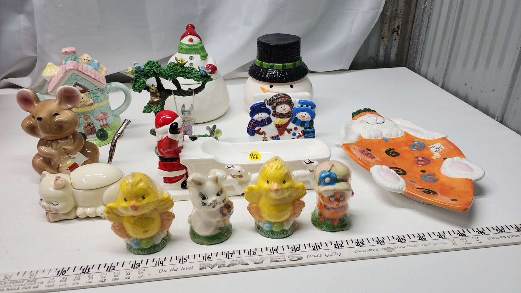 Assorted seasonal ornaments, cookie jars, animal sugar dishes, etc. - Christmas, Easter, etc.