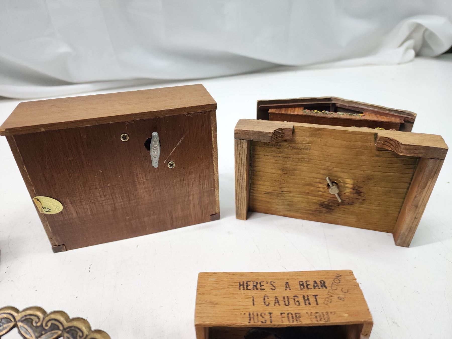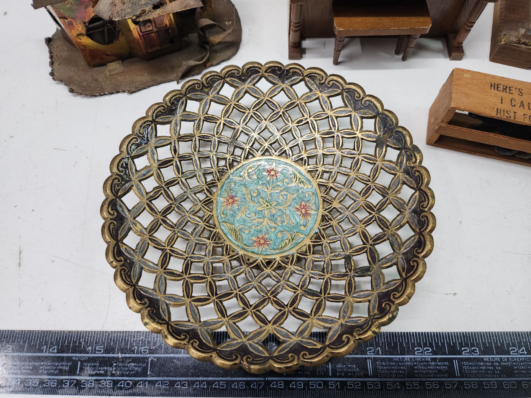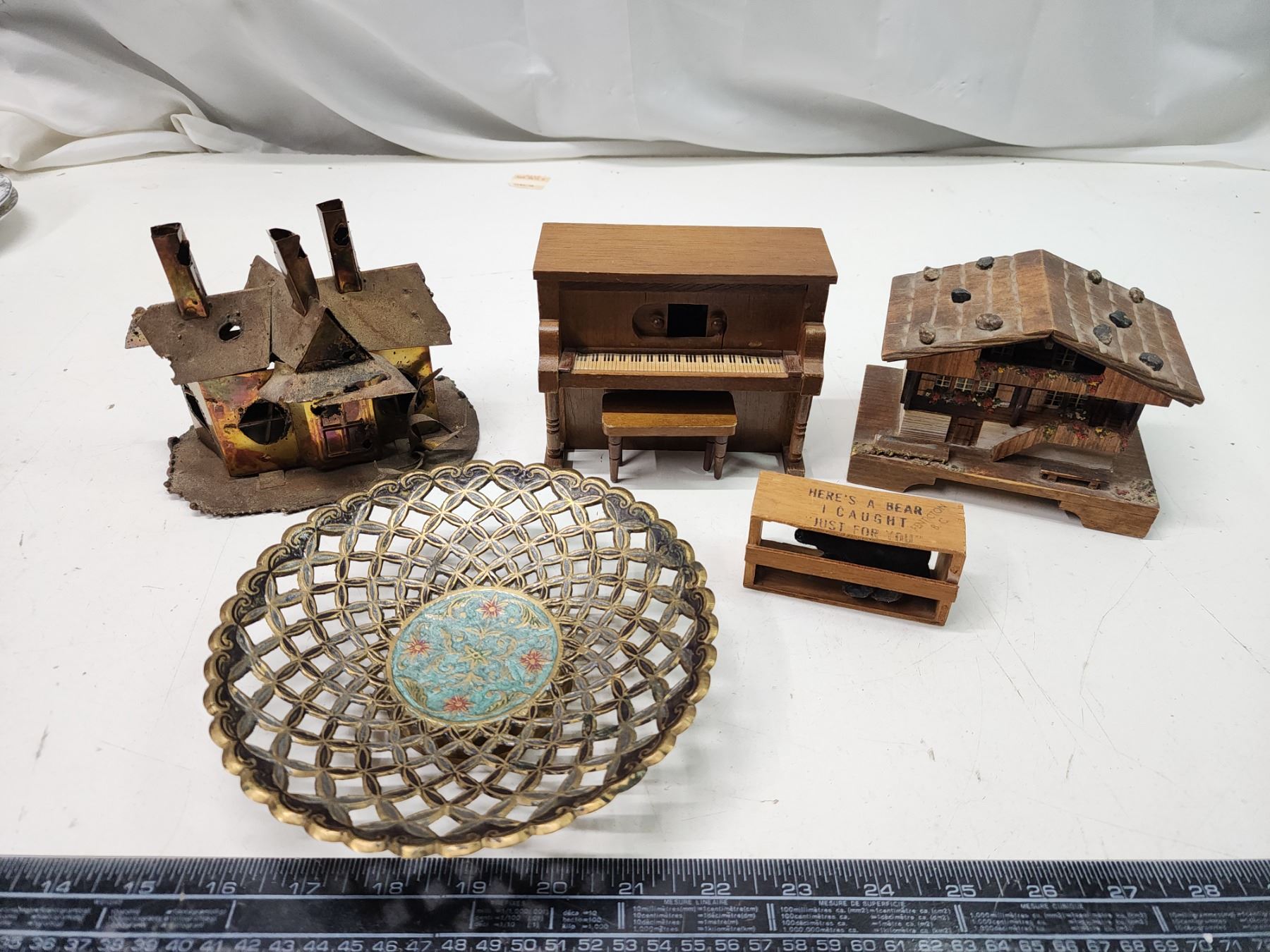 Assorted vintage items - 2 wooden music boxes, tin house, brass dish, etc