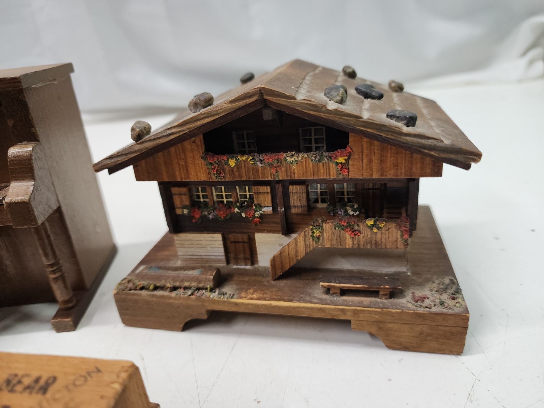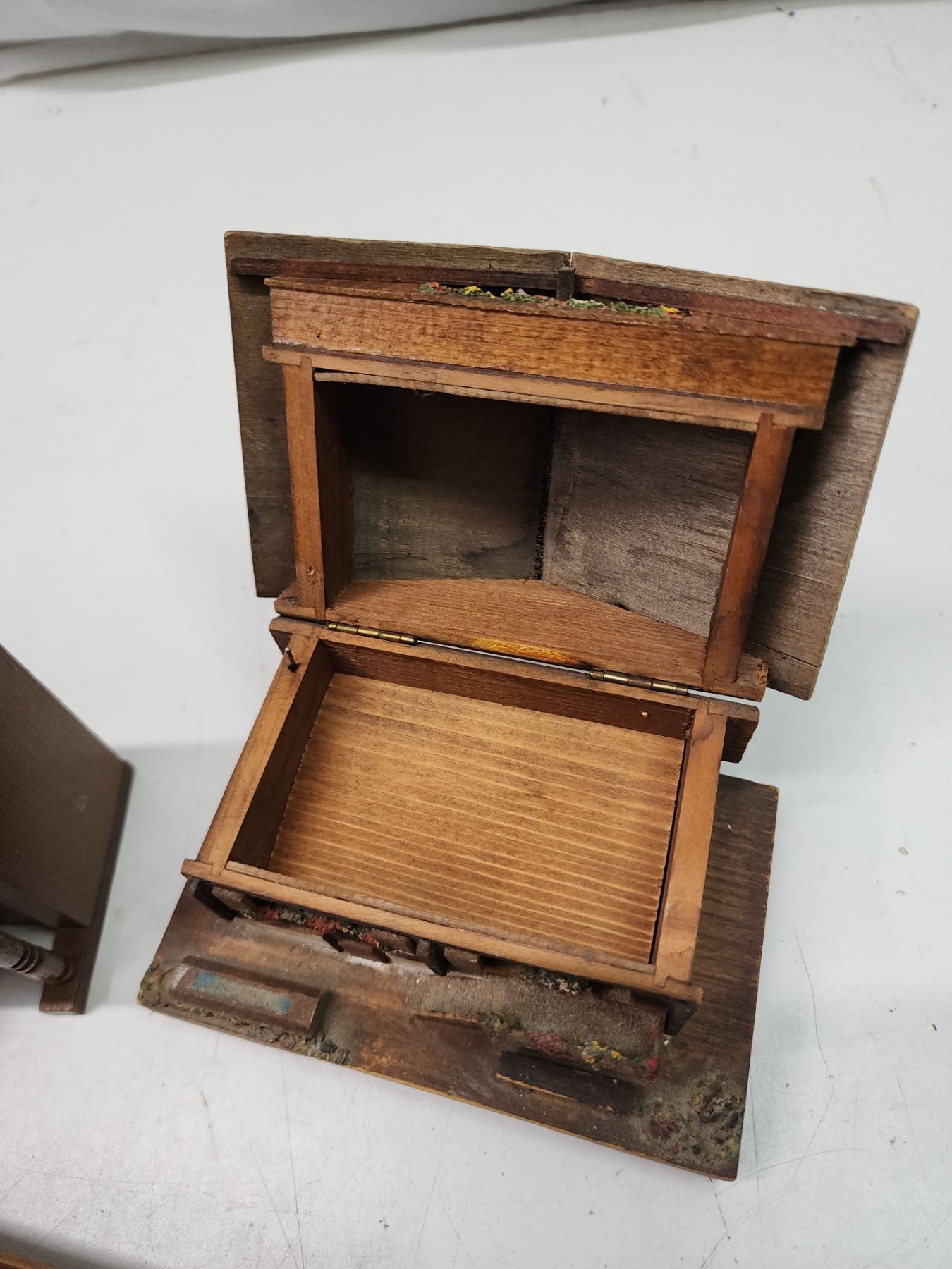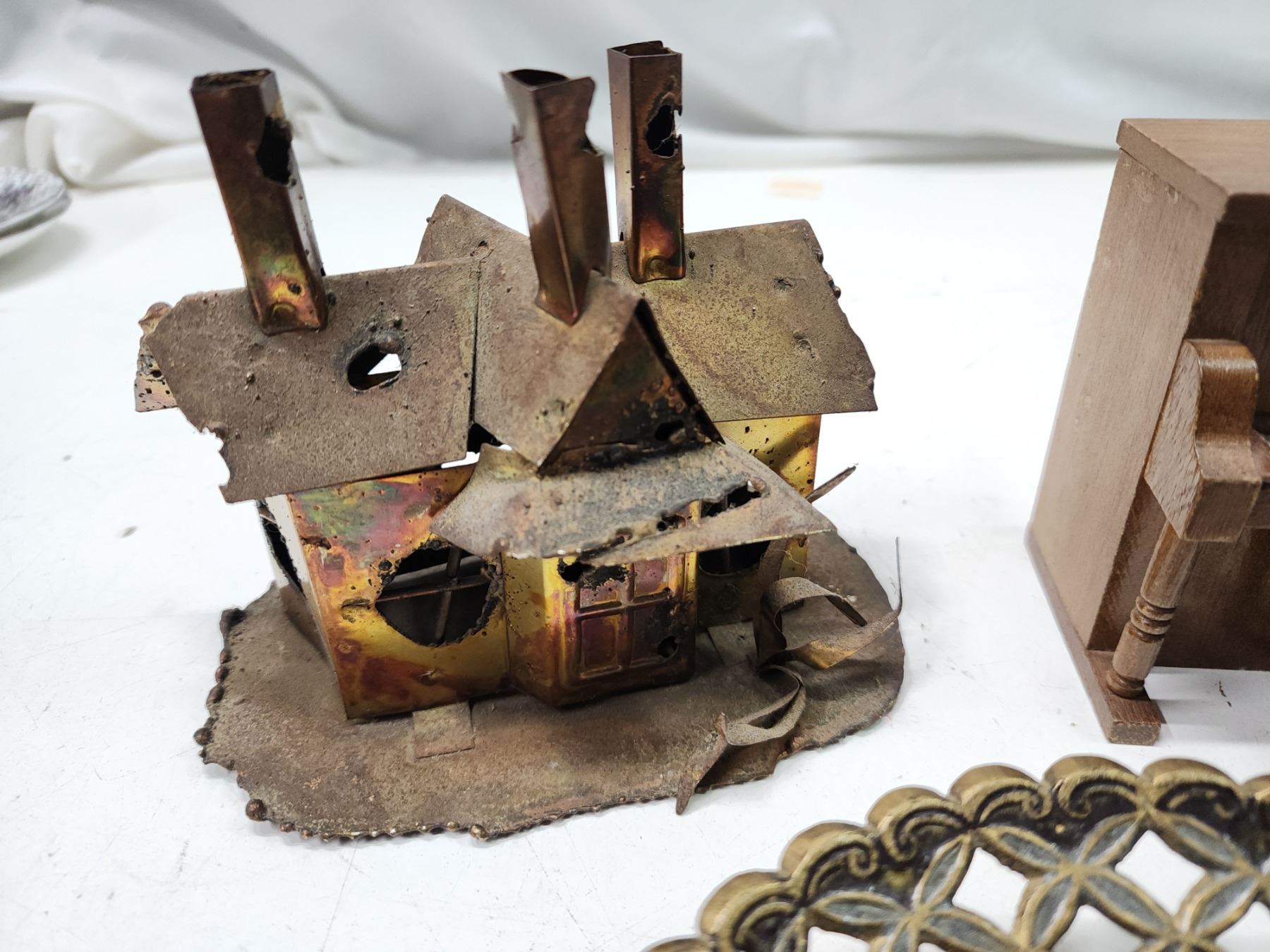 Assorted vintage items - 2 wooden music boxes, tin house, brass dish, etc