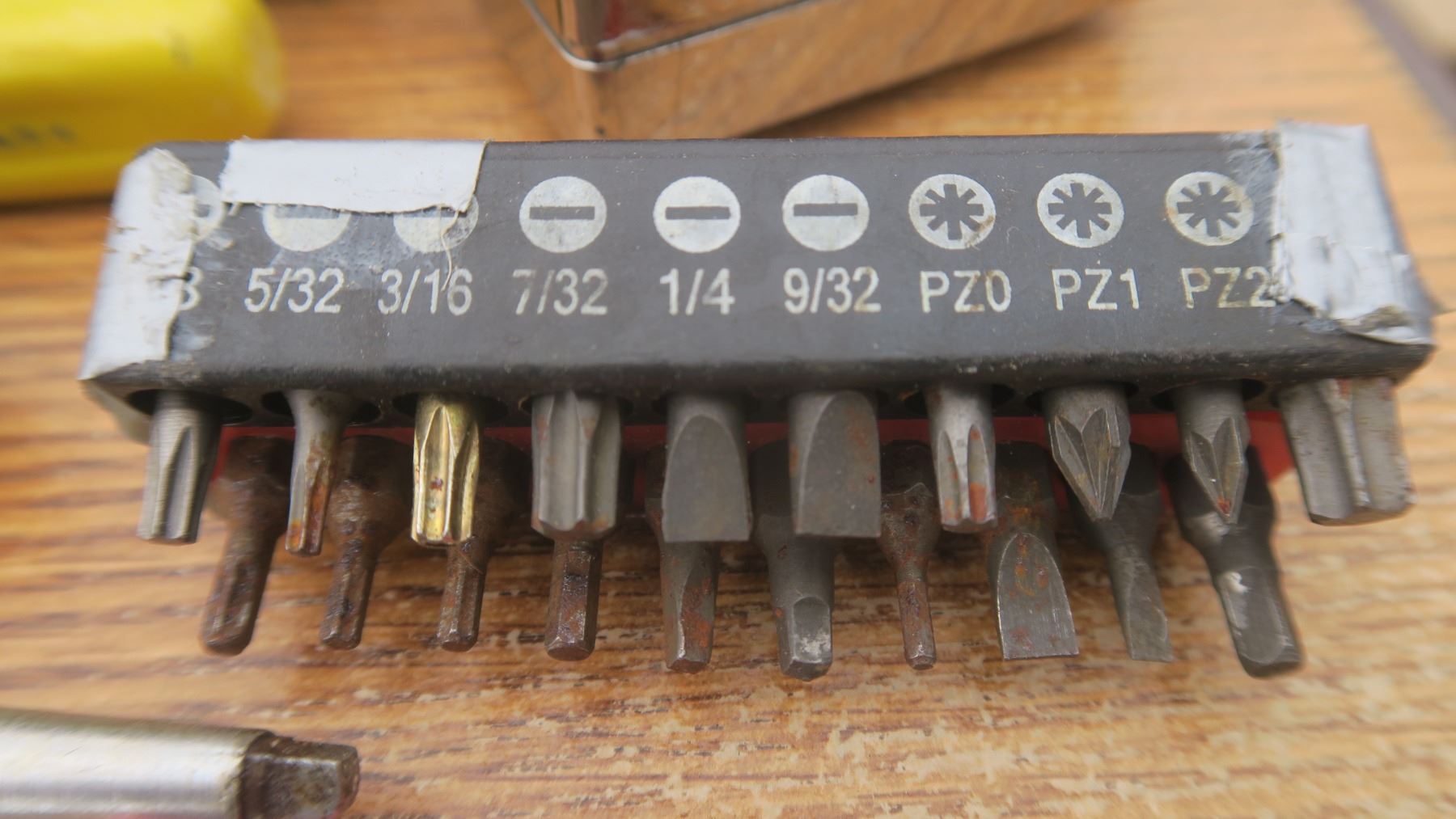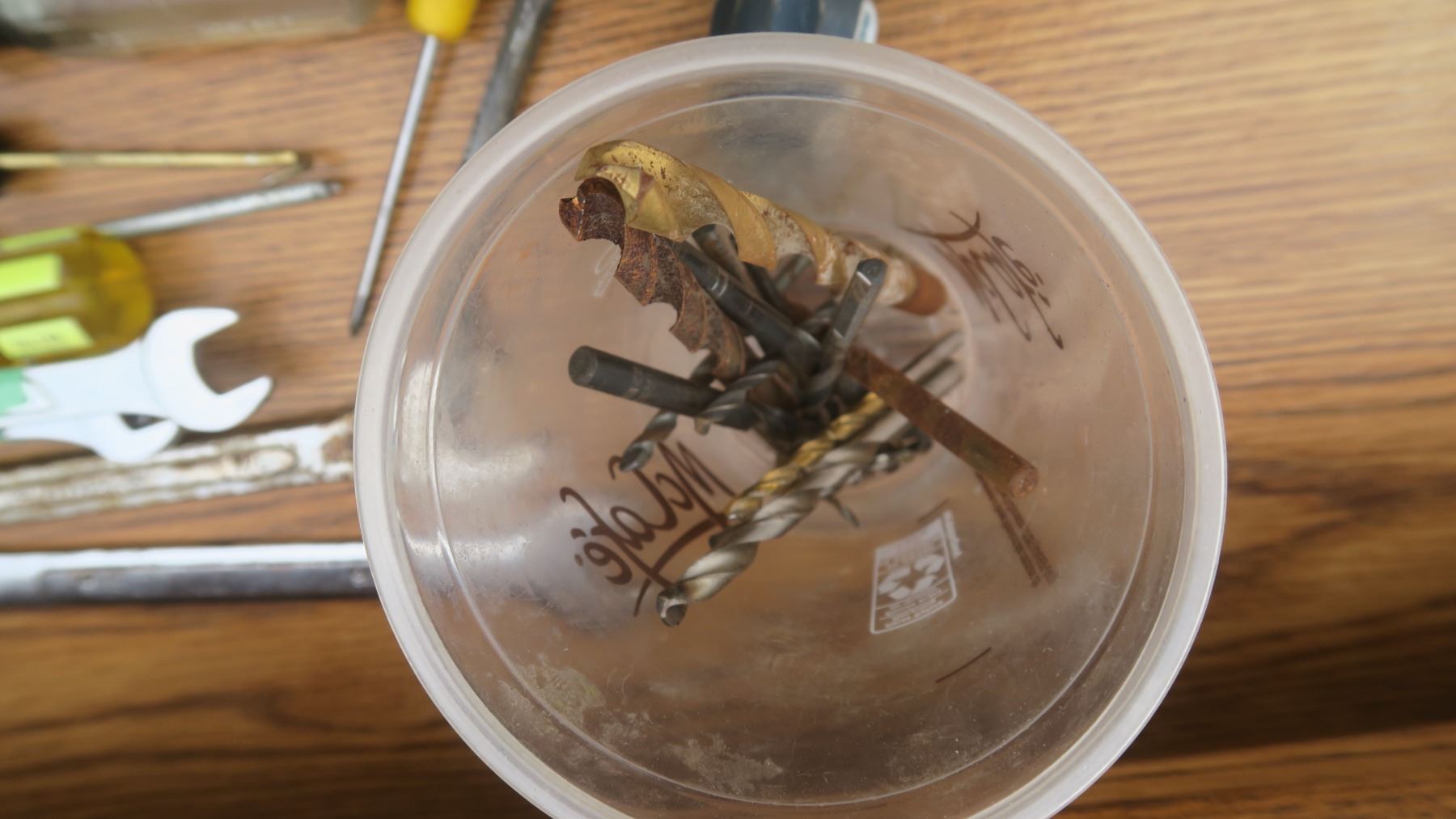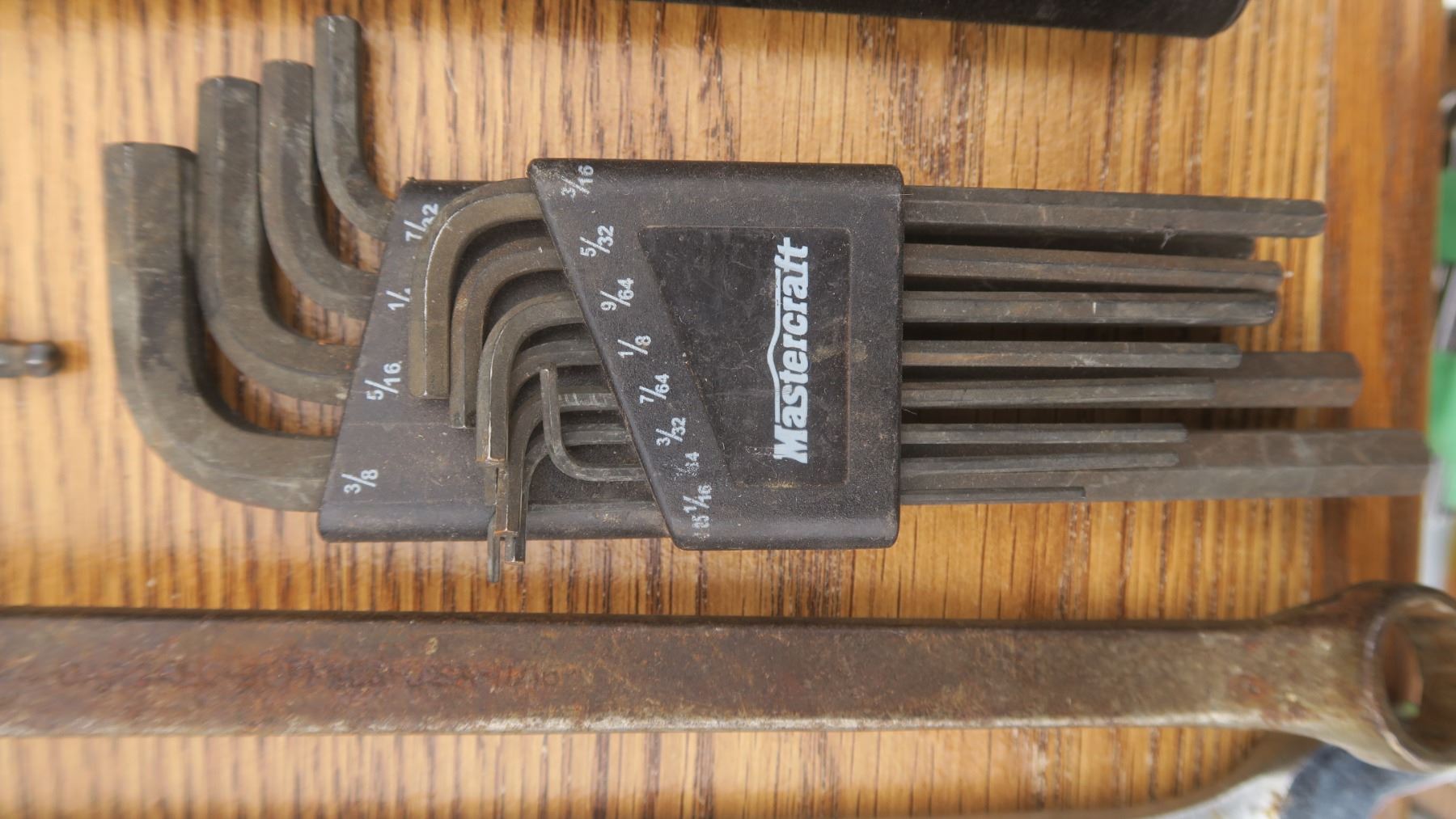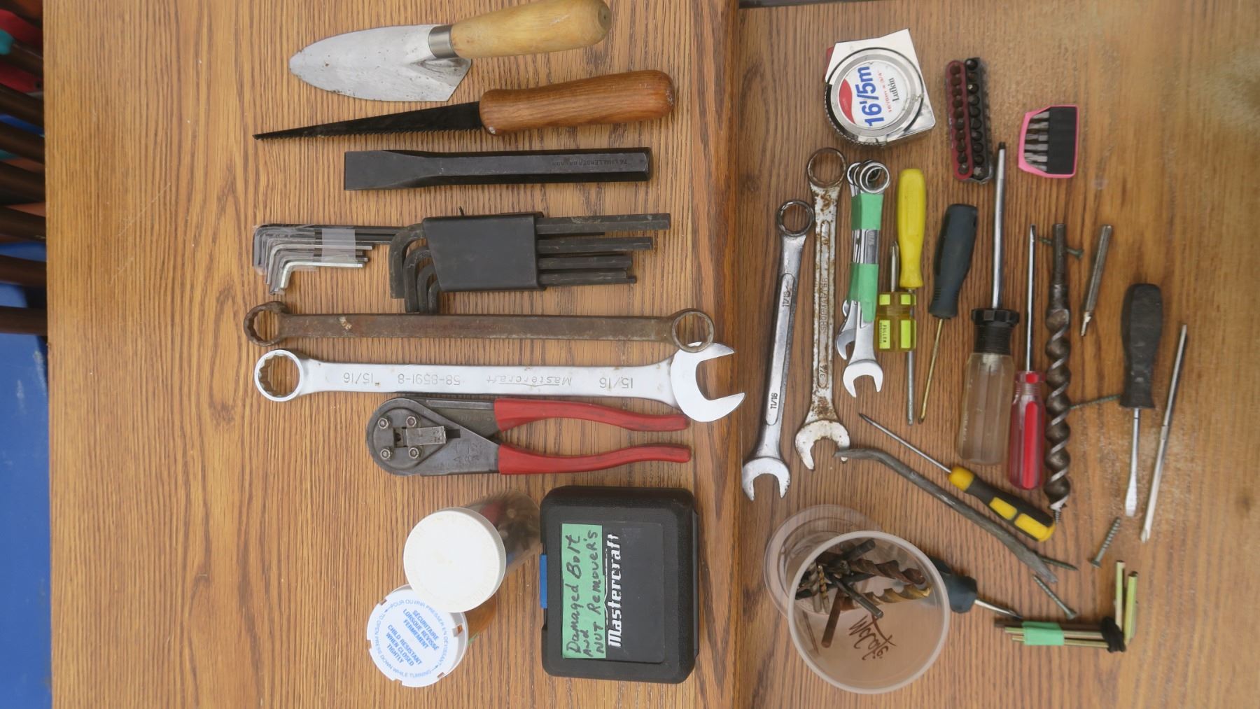 Assortment of Tools: wrenches, carpentry hand saw, drill bits, alen wrenches
