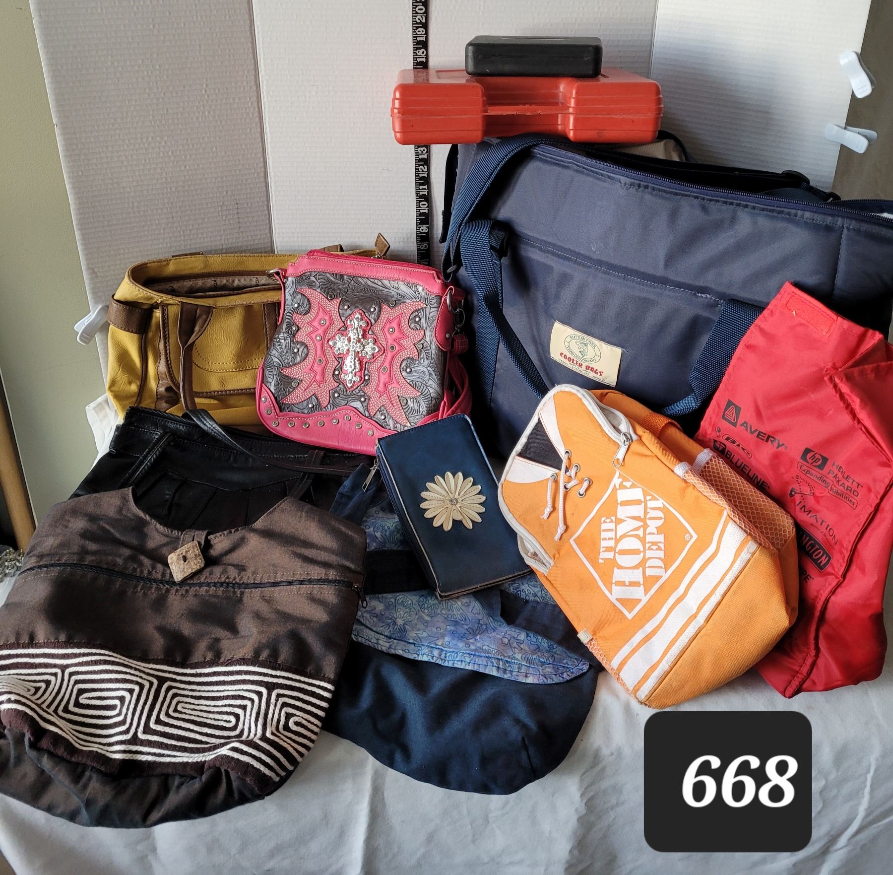 Assortment of purses, tote, lunch bags etc. & Sutton River Trading Co. insulated Cooler Bag.