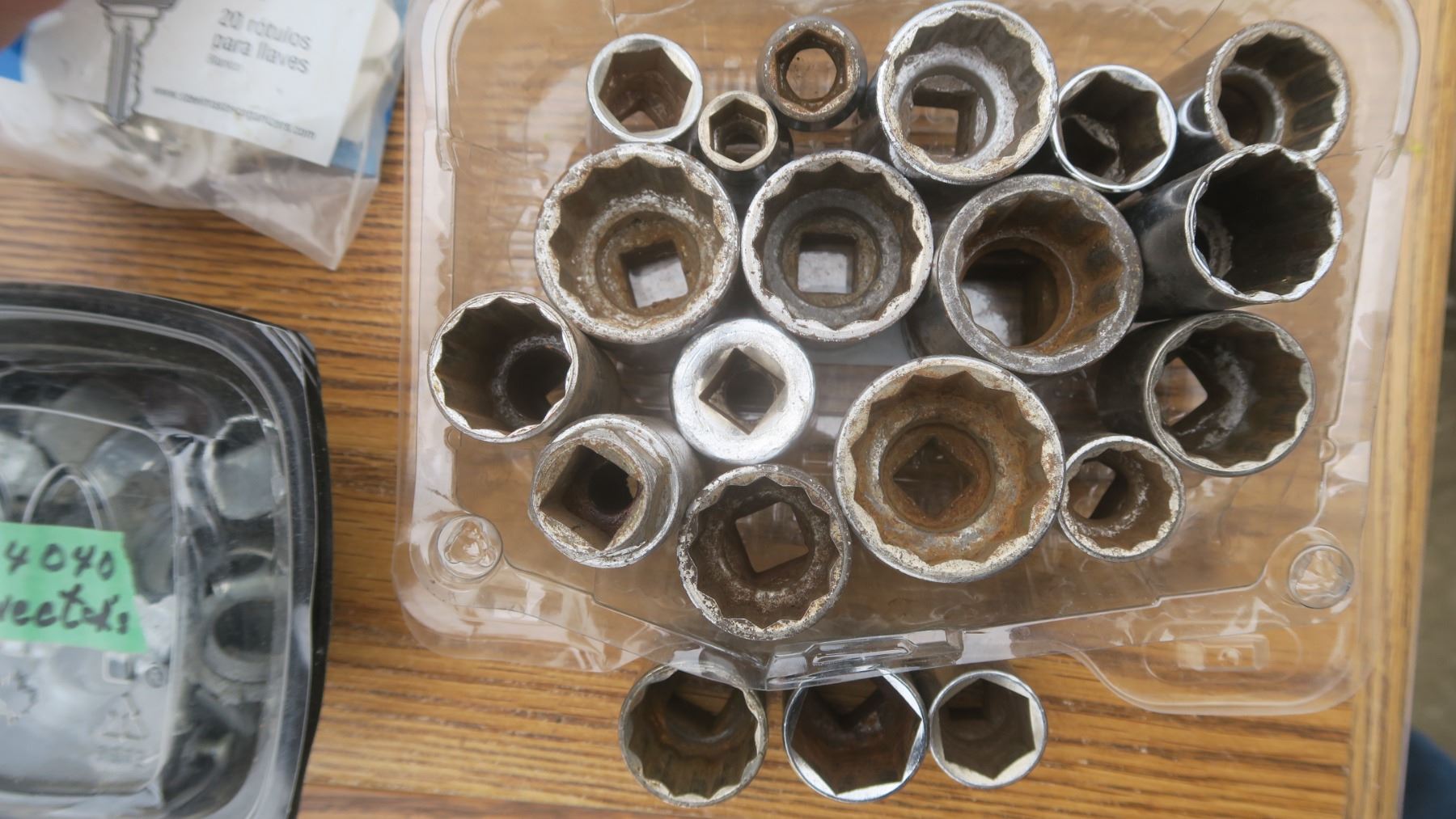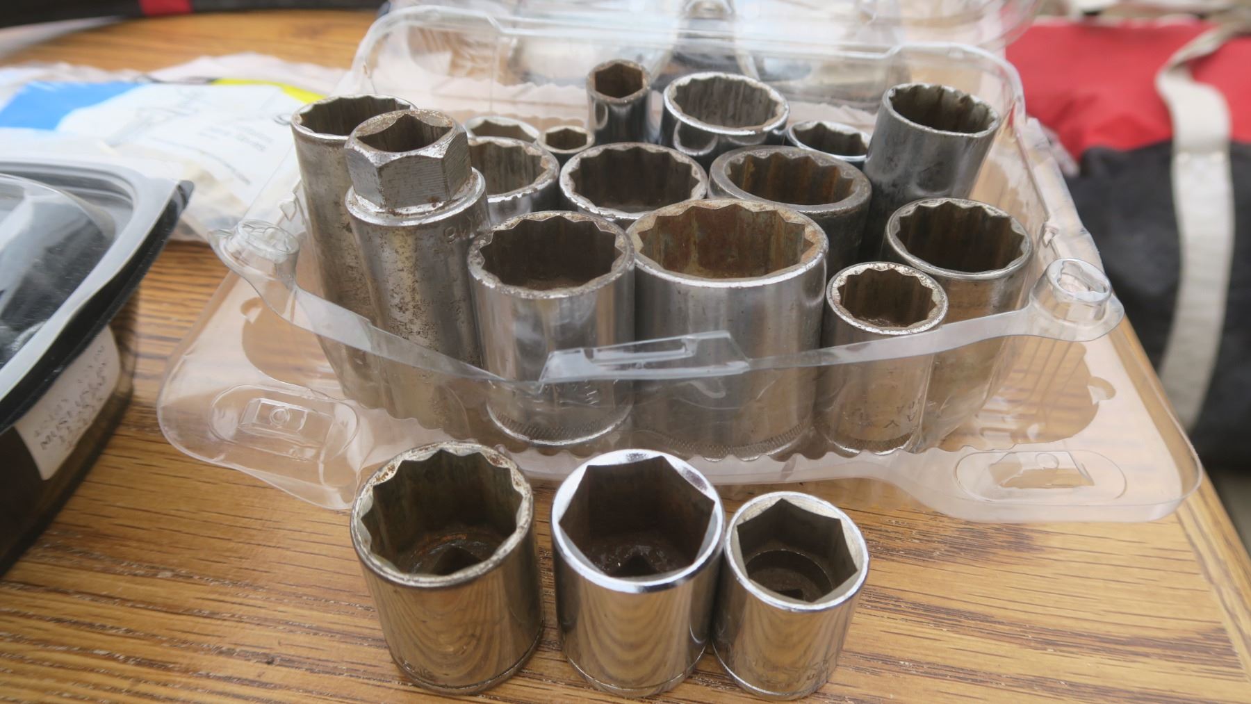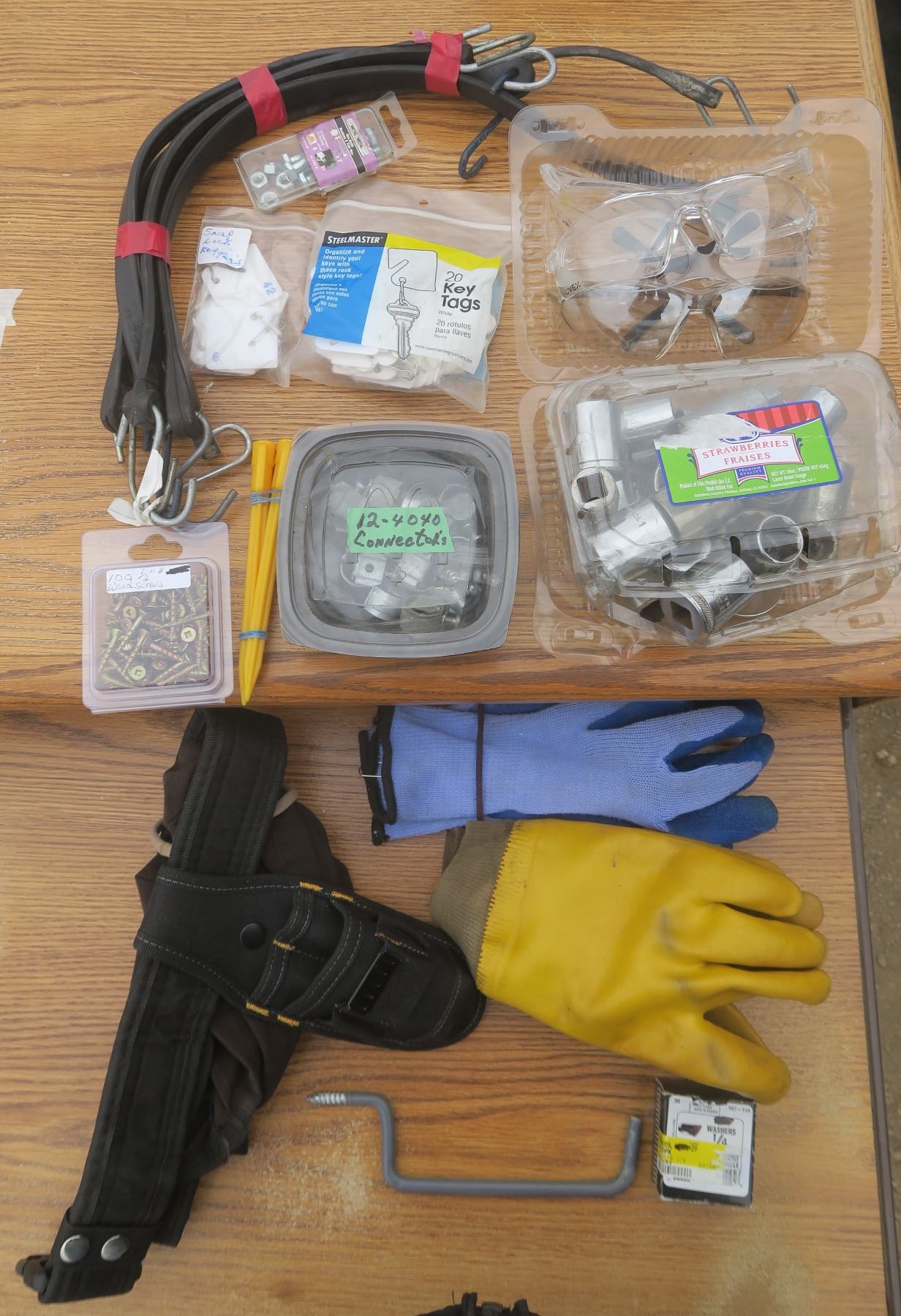 Assortment of tools: wrench sockets, gloves, connectors, safety glasses, ect