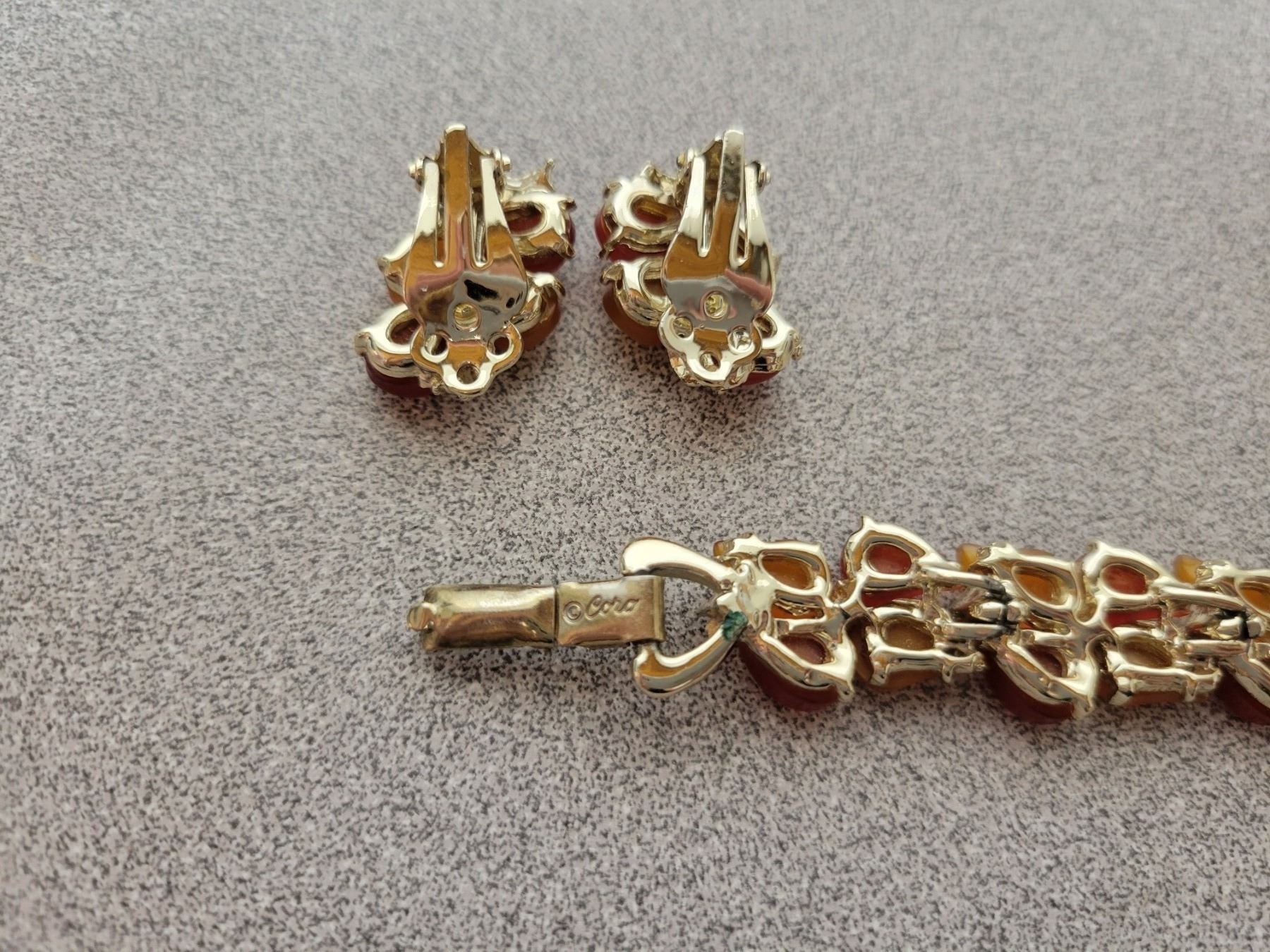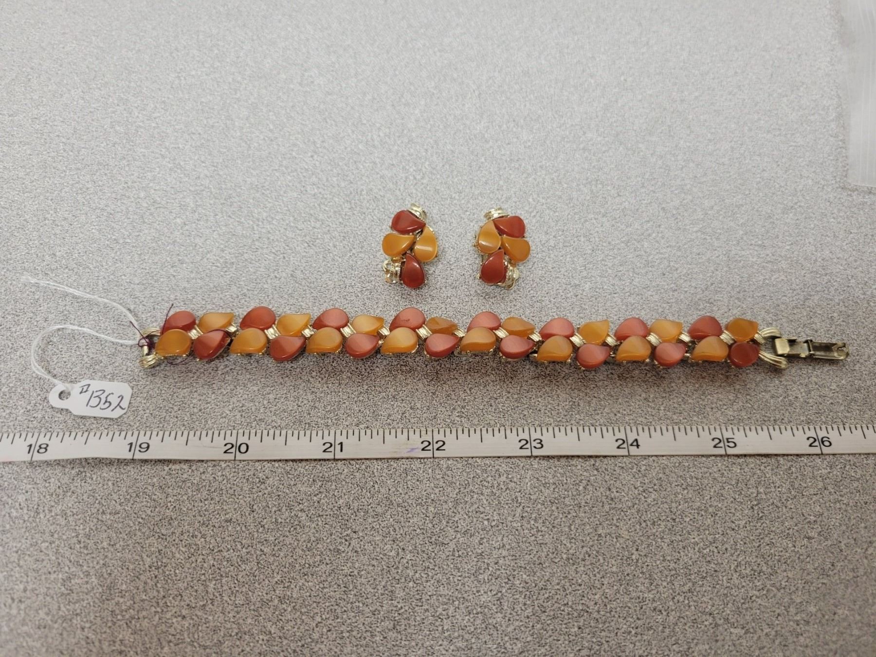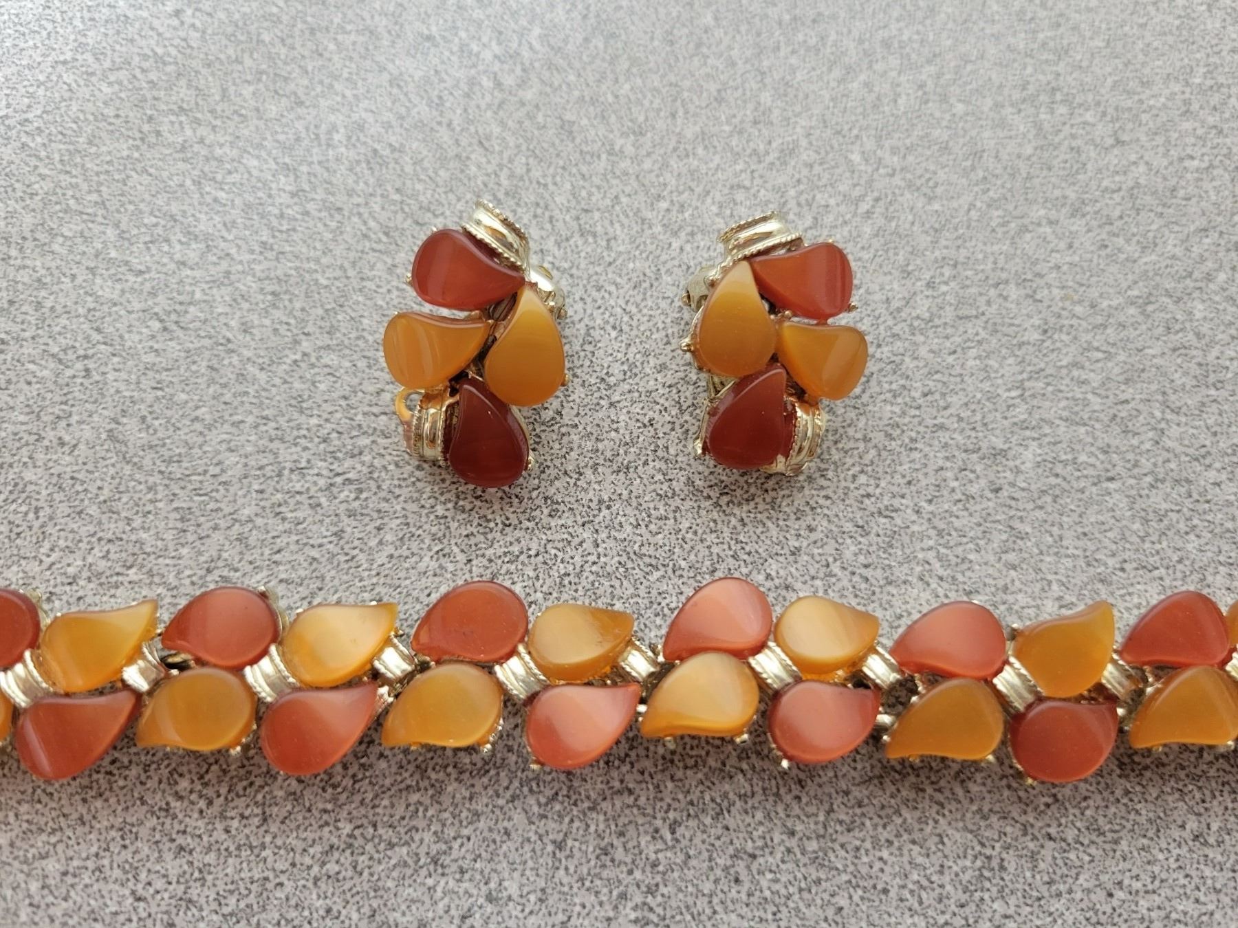 Autumn coloured thermoset bracelet and clip earrings marked “Coro”