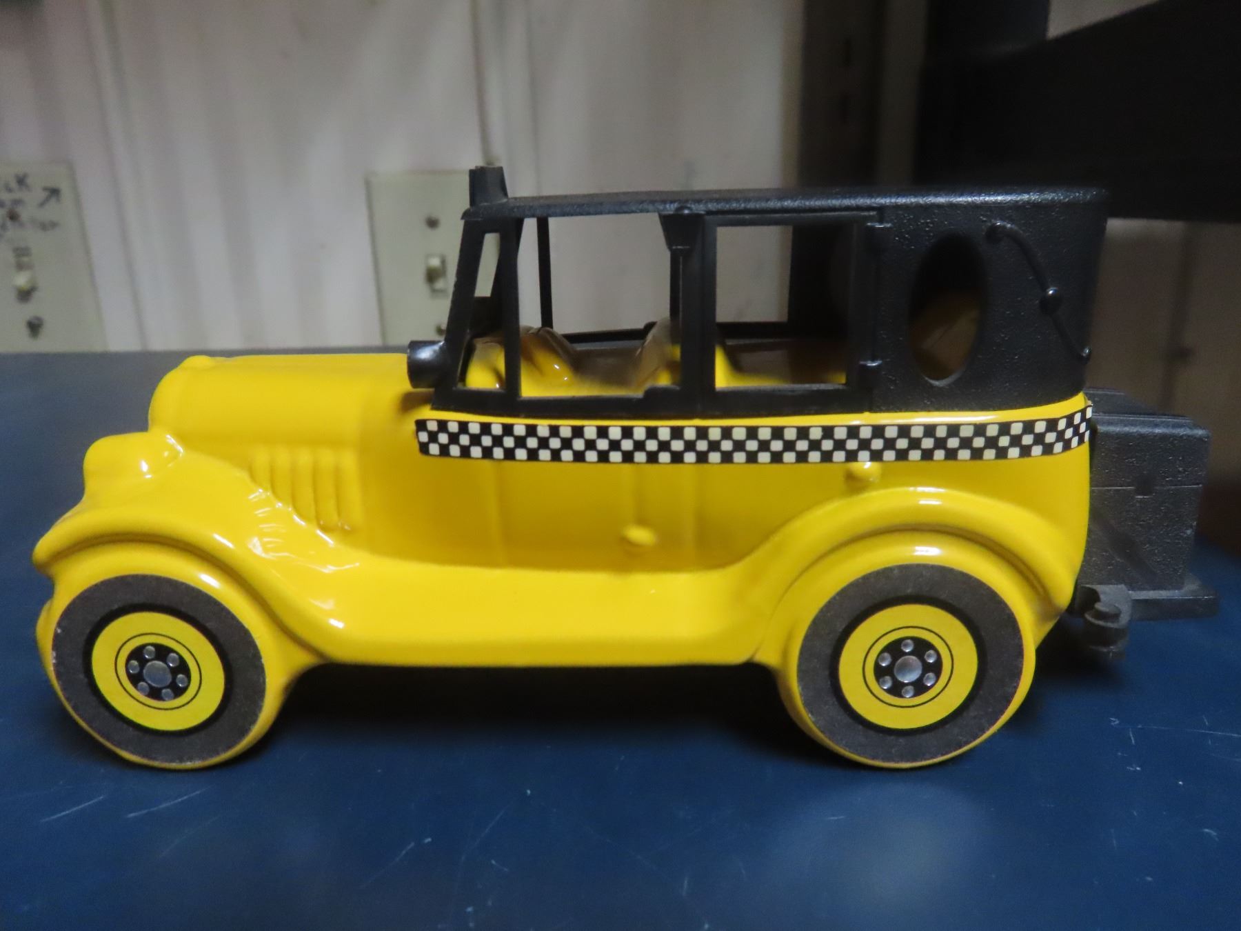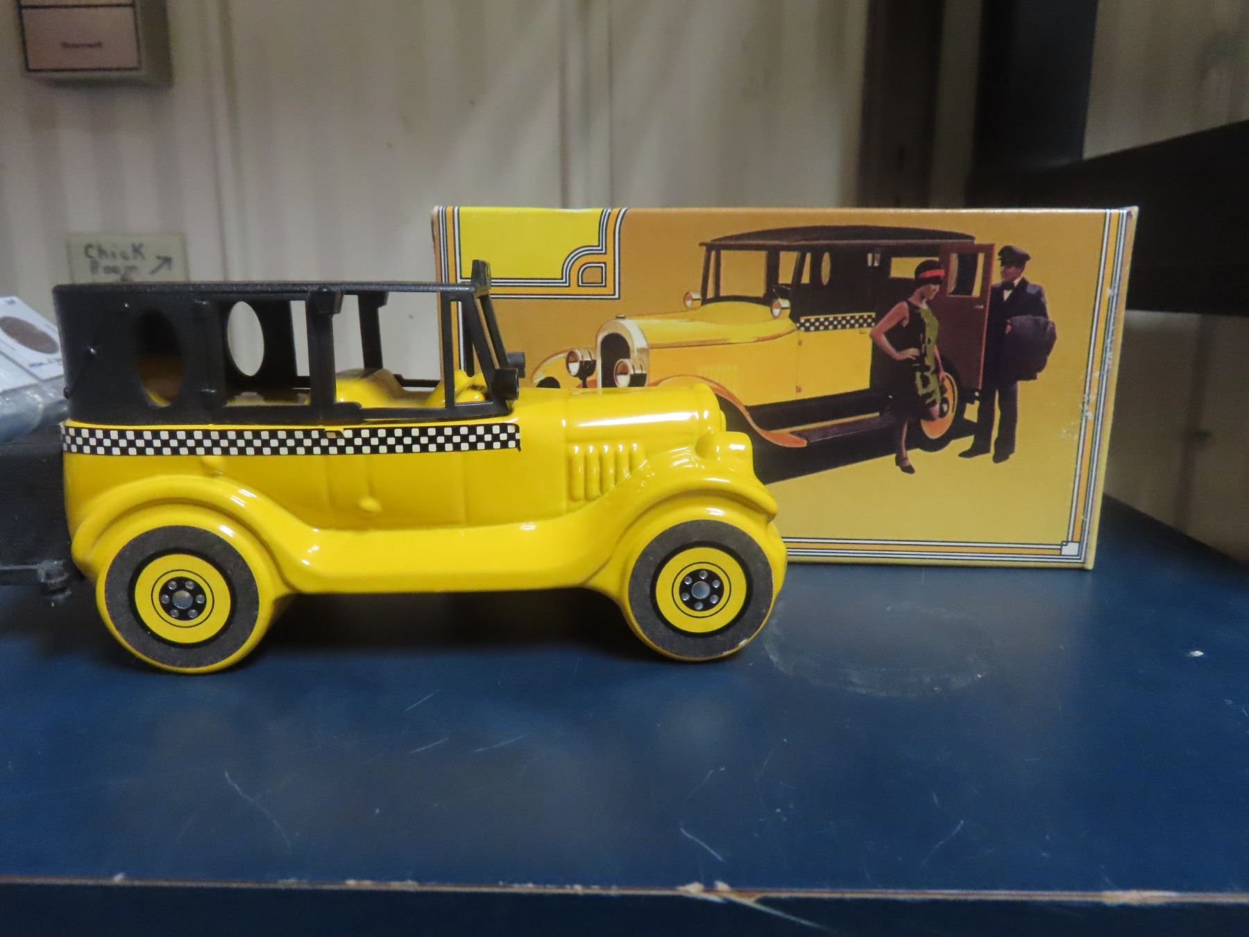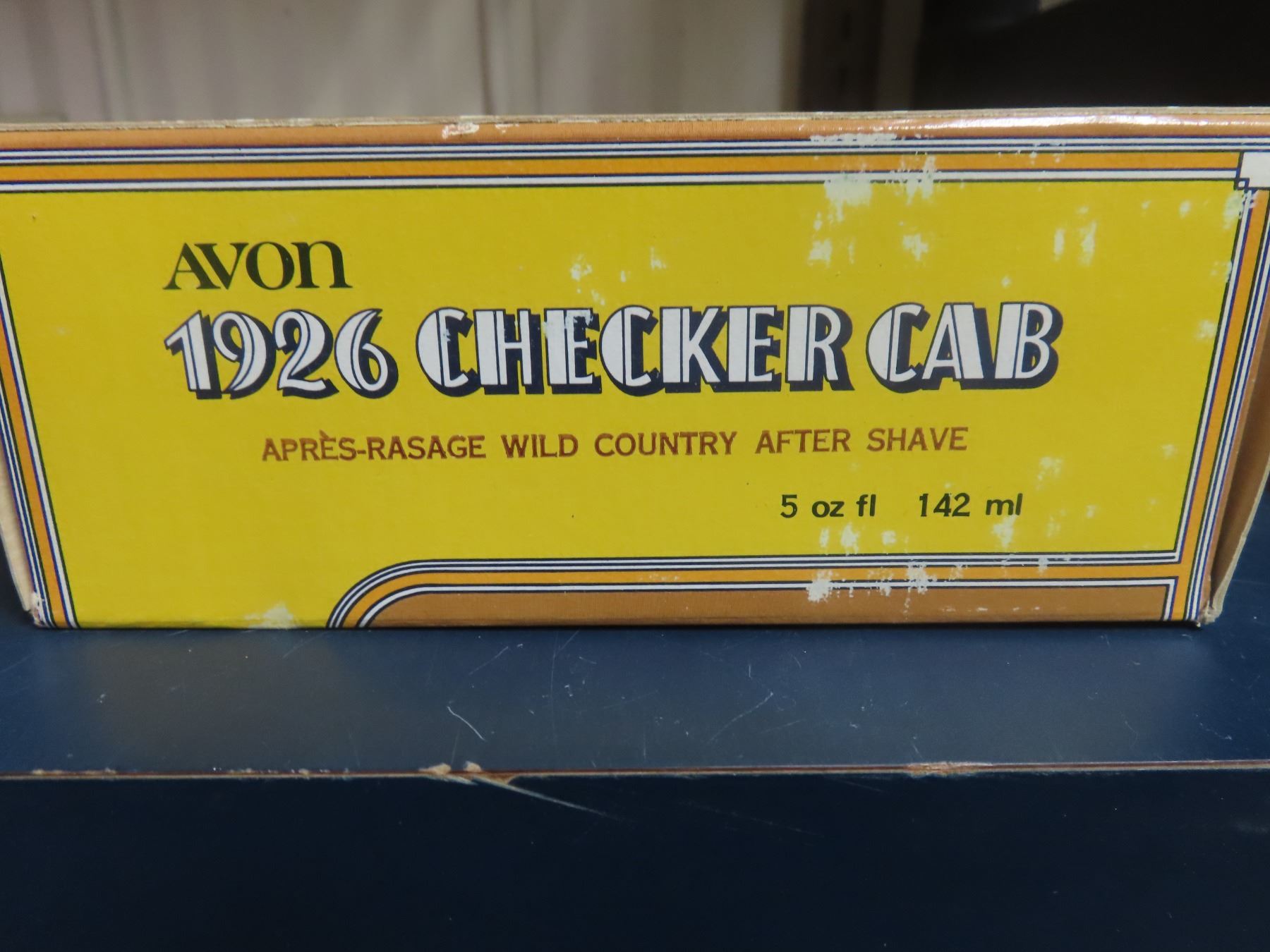 Avon 1926 Checker Cab. 5-ounce yellow painted over clear glass. Black plastic trunk cap & top. Housed in its original Avon box.