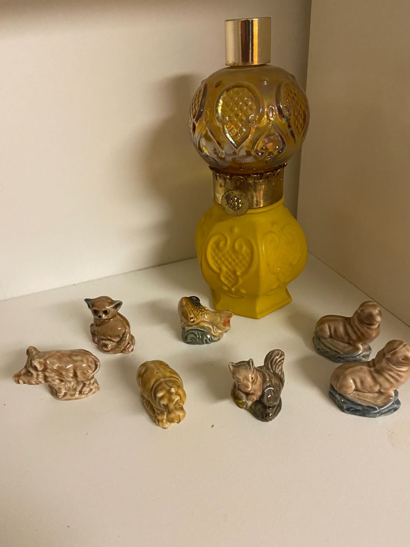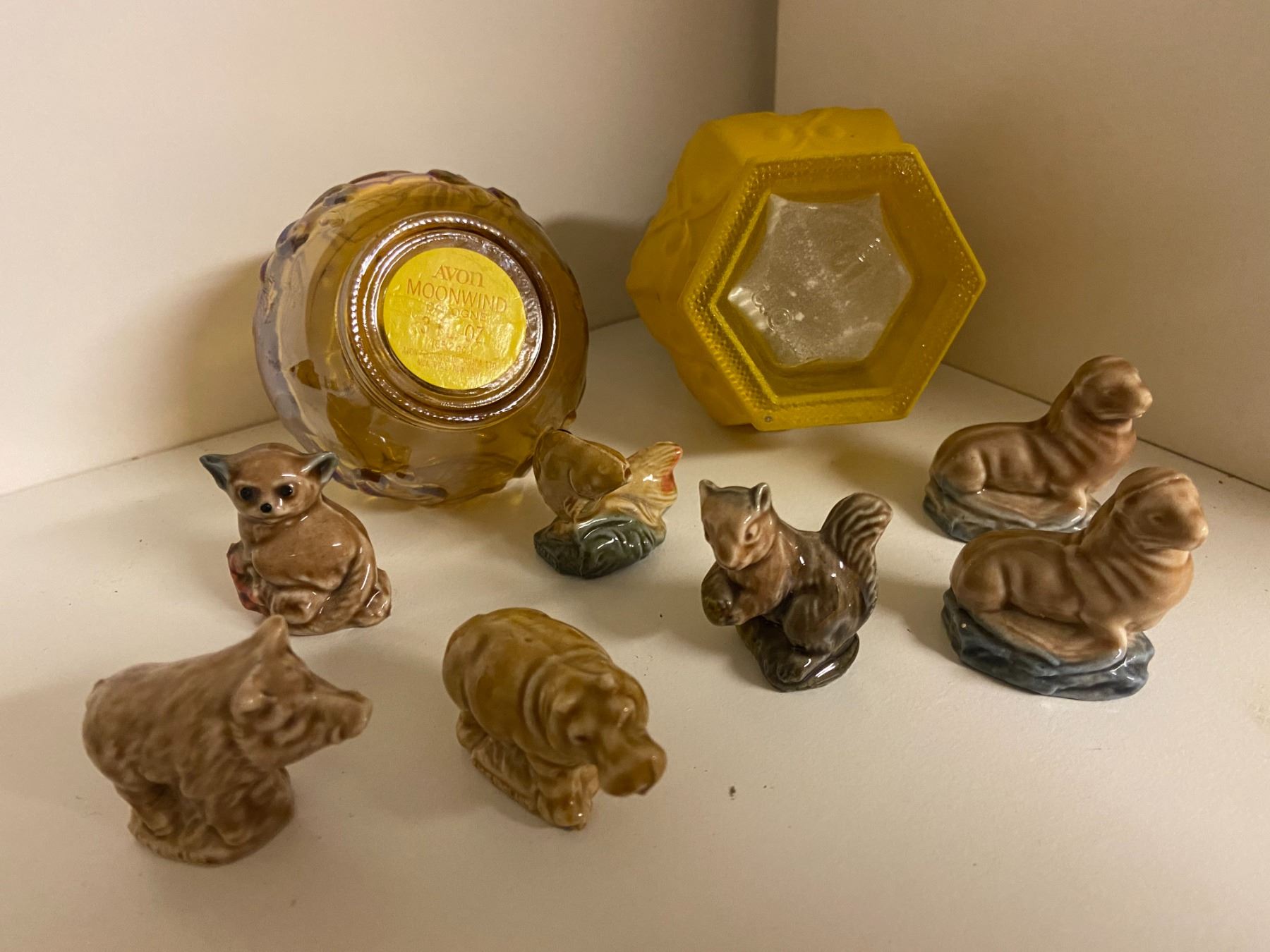 Avon Moonwind Cologne ornament and 7 Red Rose Tea ornaments (wild animals)