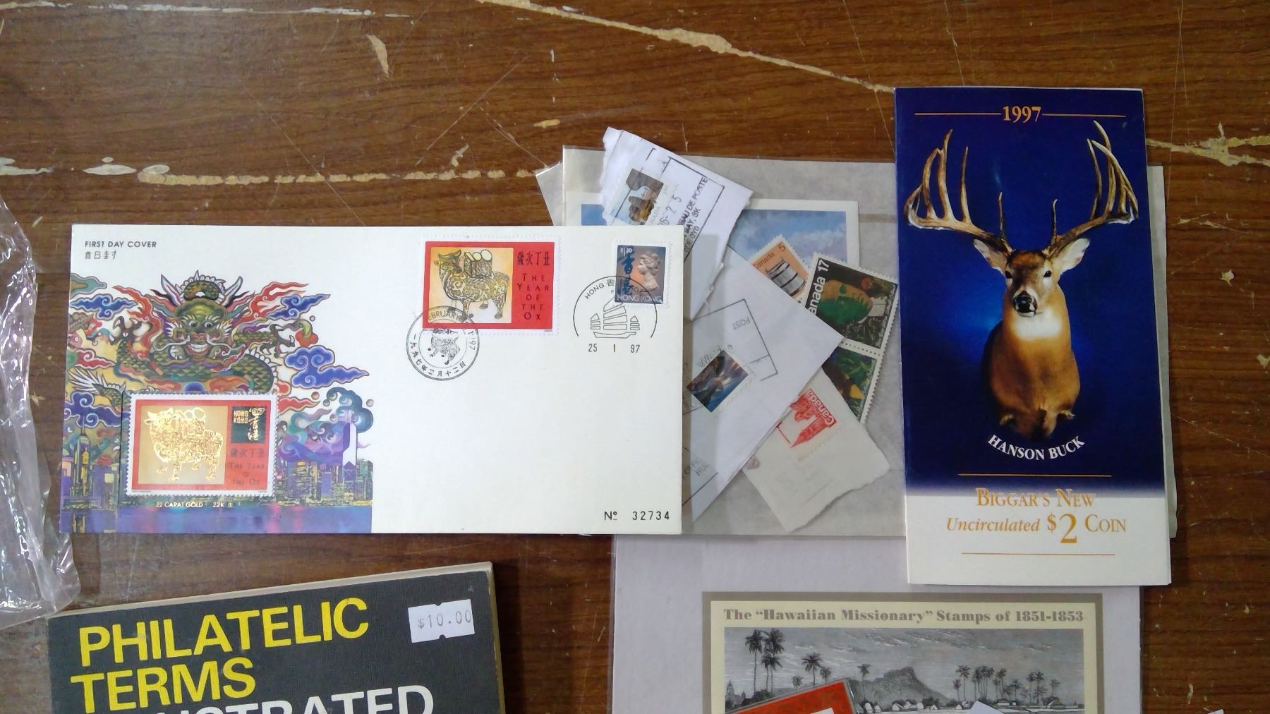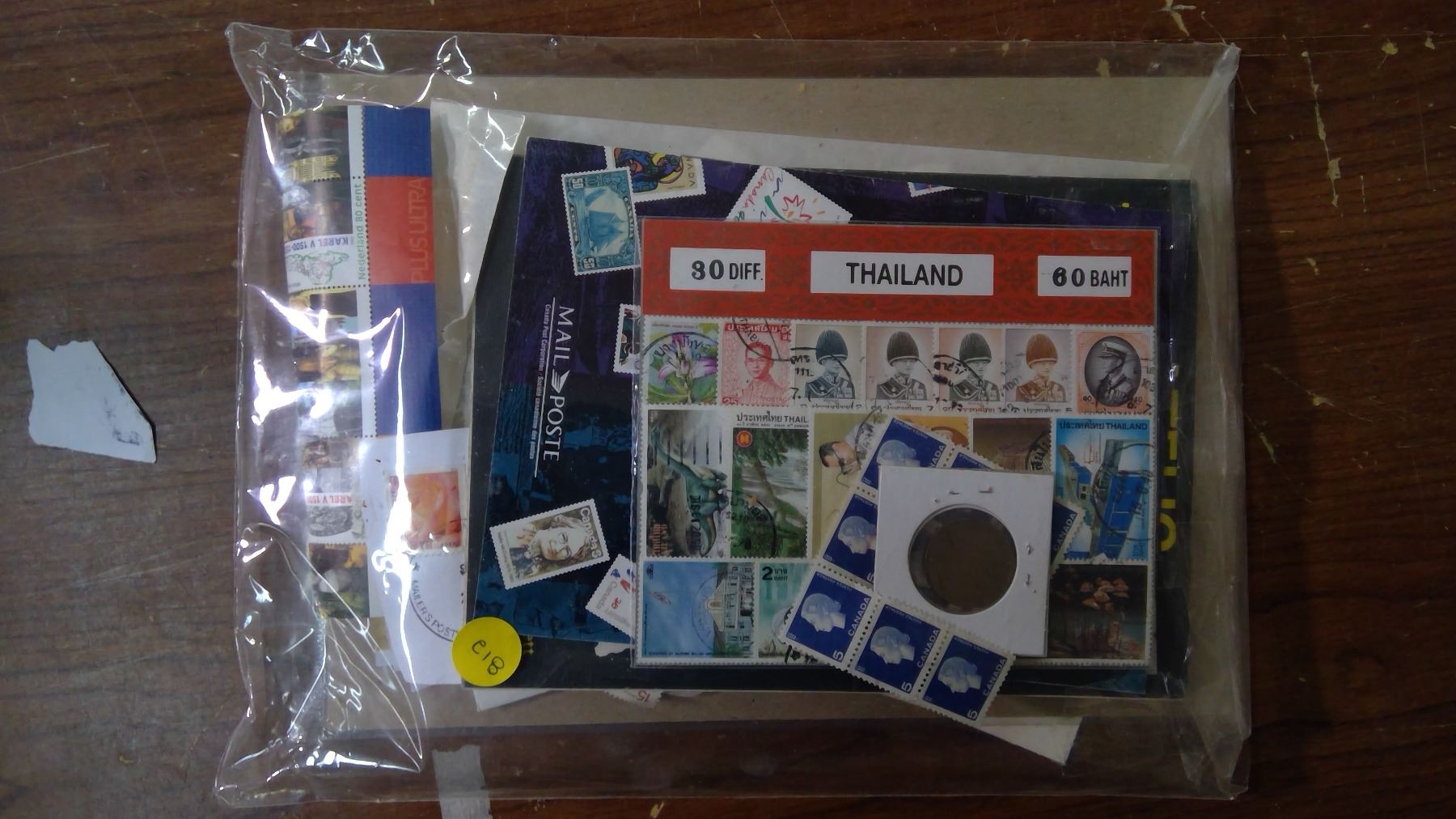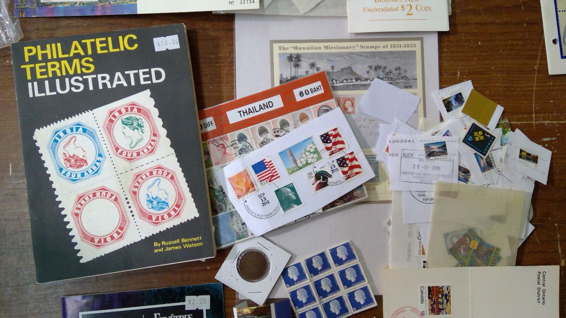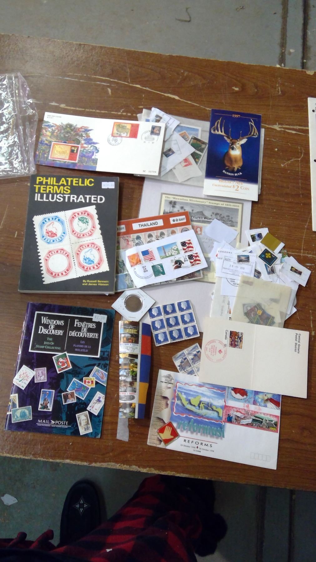 BAG OF CANADIAN STAMPS, INCLUDES WORLDWIDE STAMPS, COINS AND BOOKS