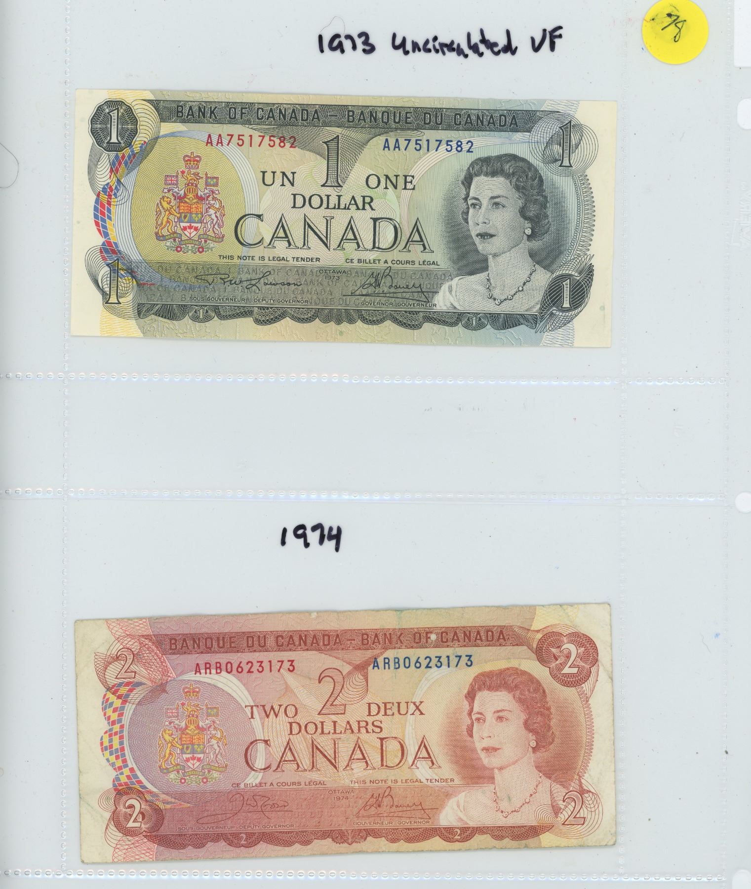 BANK OF CANADA 1973 ONE DOLLAR AND 1974 TWO DOLLAR BILLS
