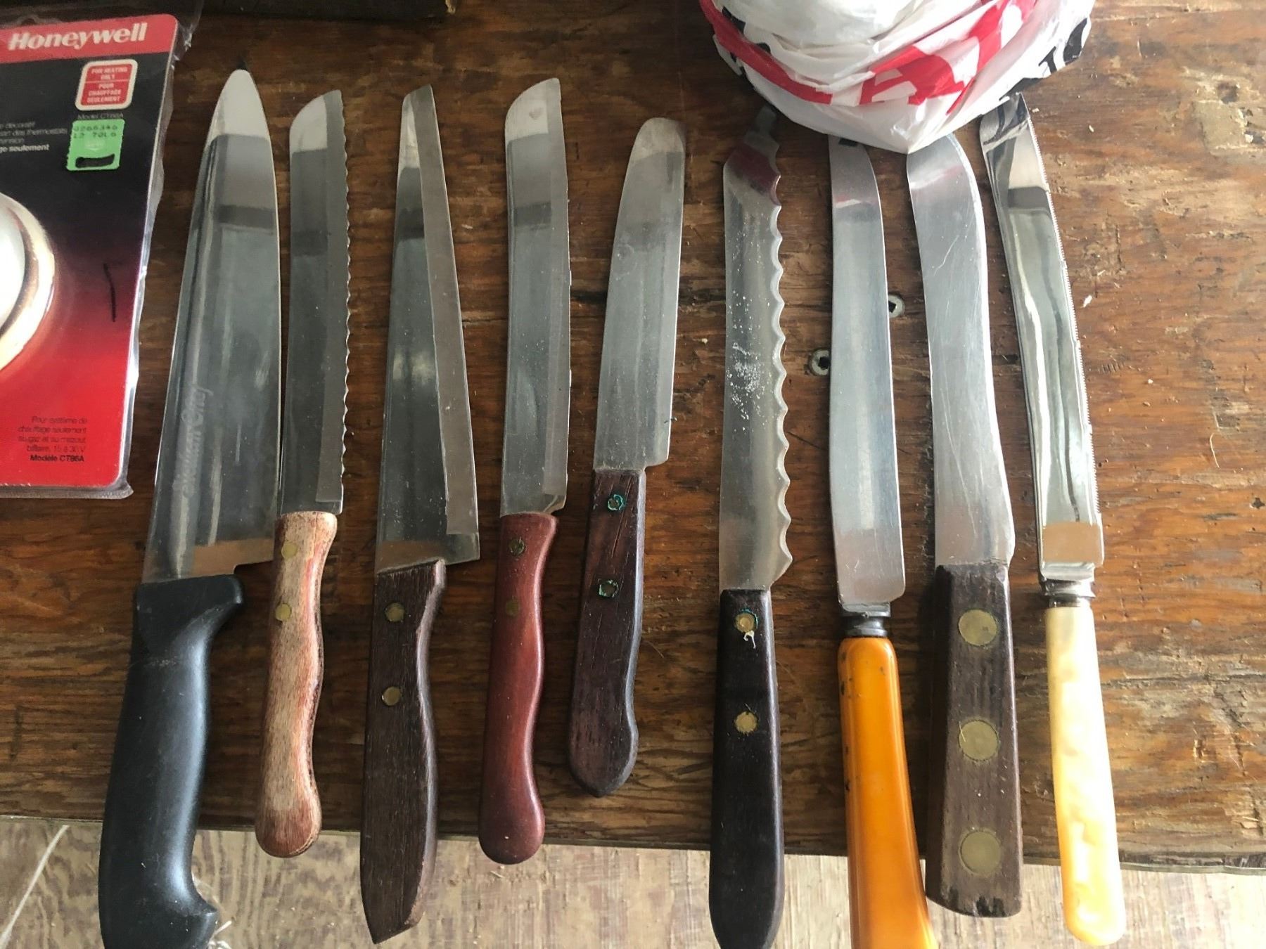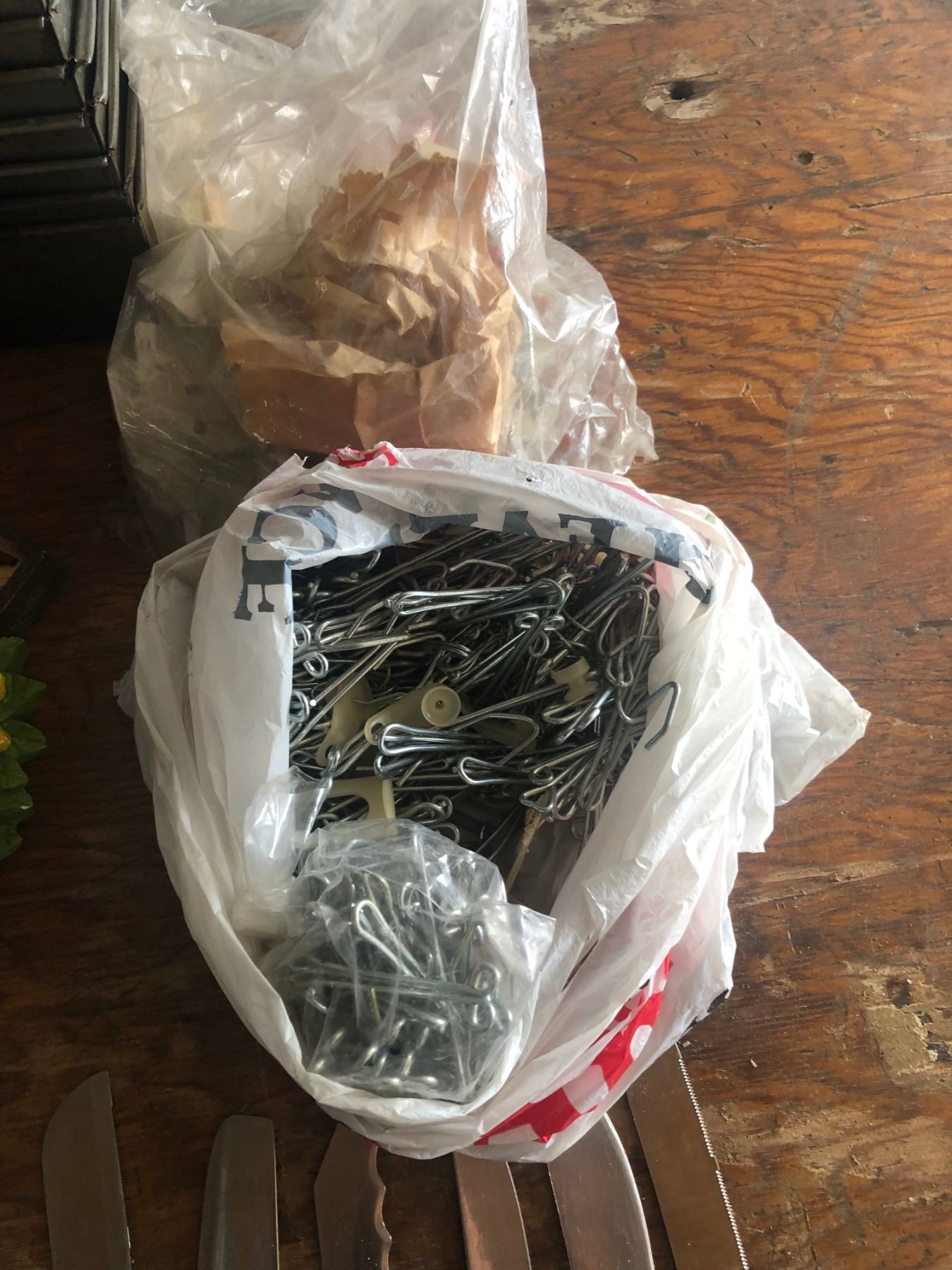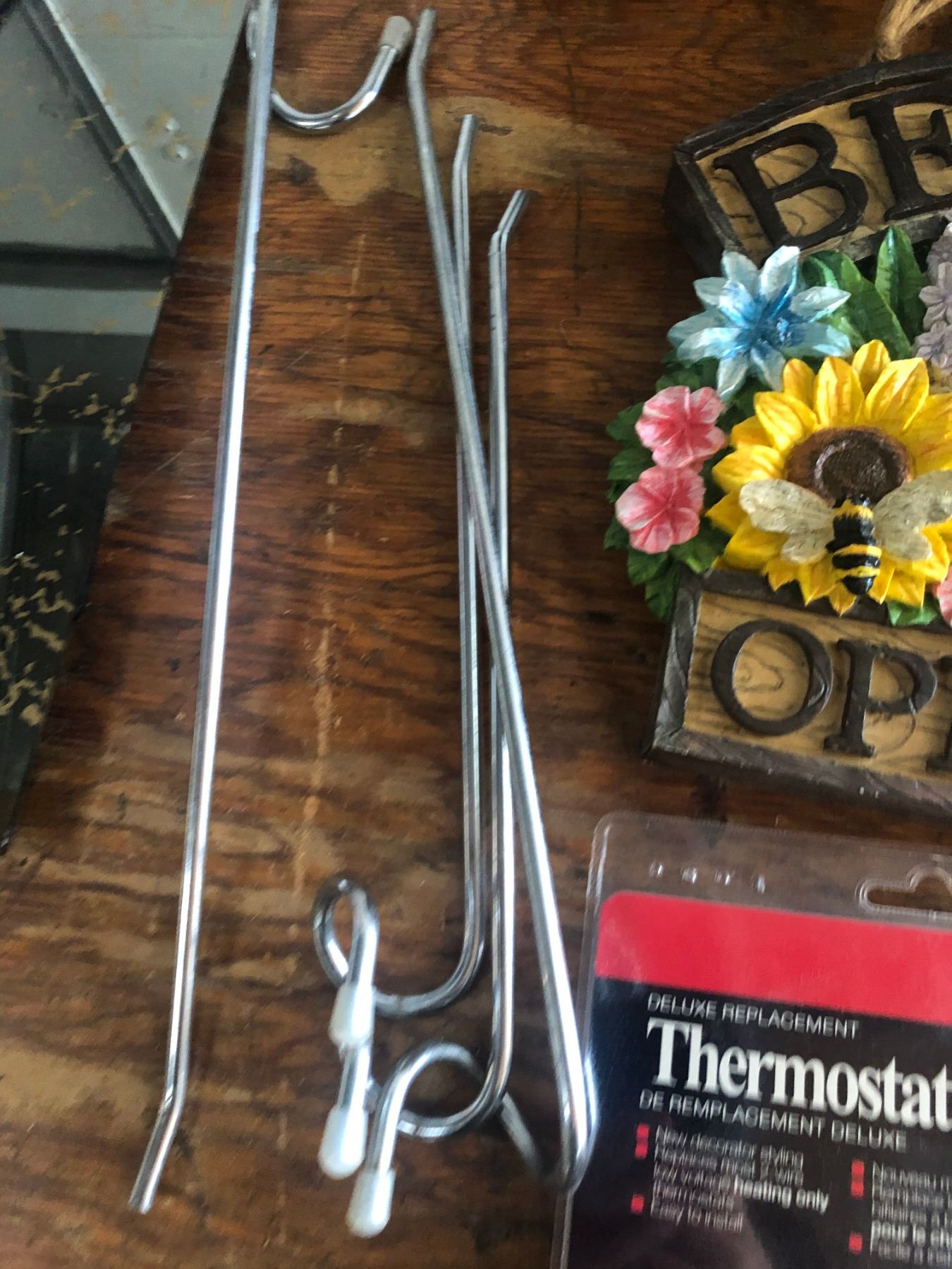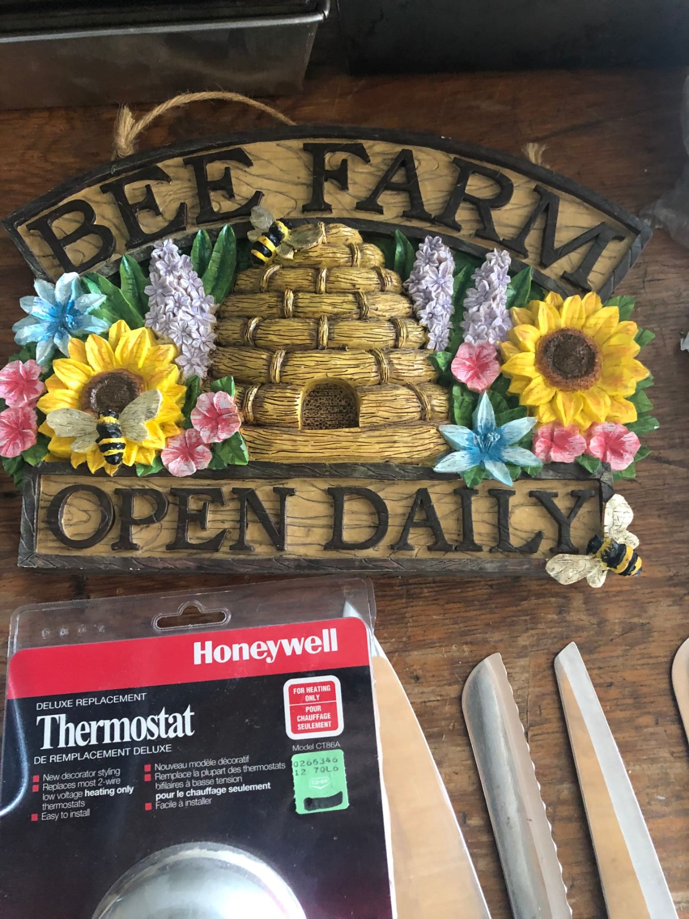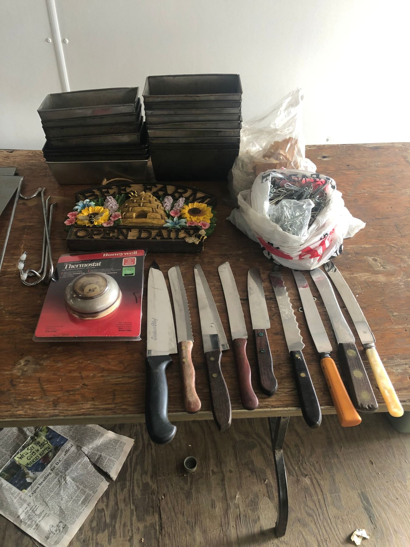 BEE FARMER SIGN, BAKING PANS , HOOKS , KNIVES , DOOR HINGES