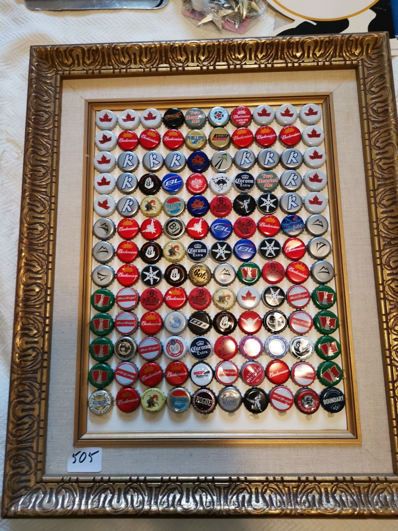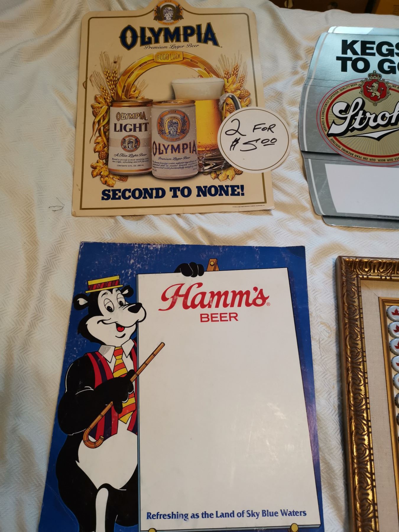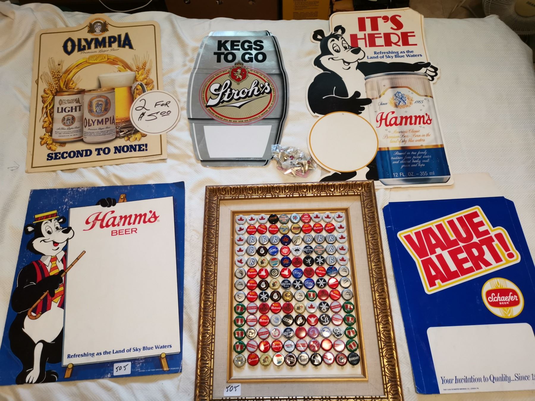 BEER LOT, 5 POSTERS & FRAMED CAPS 18" X 22"