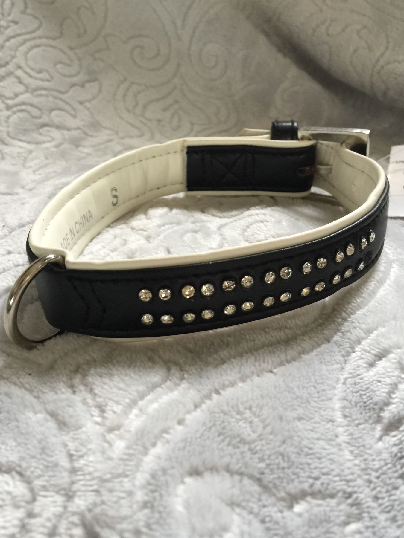 BLACK AND WHITE DOG COLLAR CLEAR CRYSTALS/LEATHER/16  LONG/SIZE SMALL