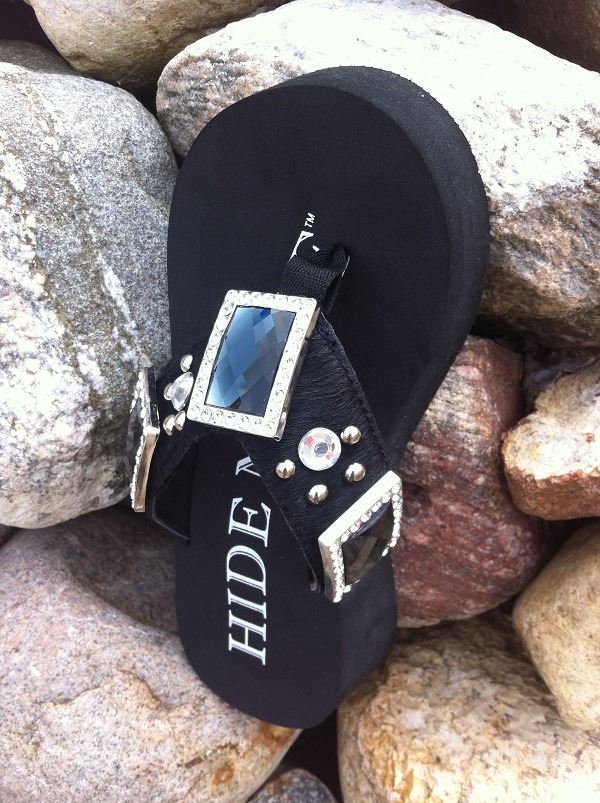 BLACK HAIR ON HIDE BLING FLIP FLOPS/Black Hide with smoke square conchos/Has round stones and silver