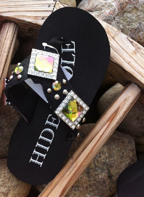 BLACK HAIR ON HIDE BLING FLIP FLOPS/Black Hide with square conchos/Has round stones and silver studs