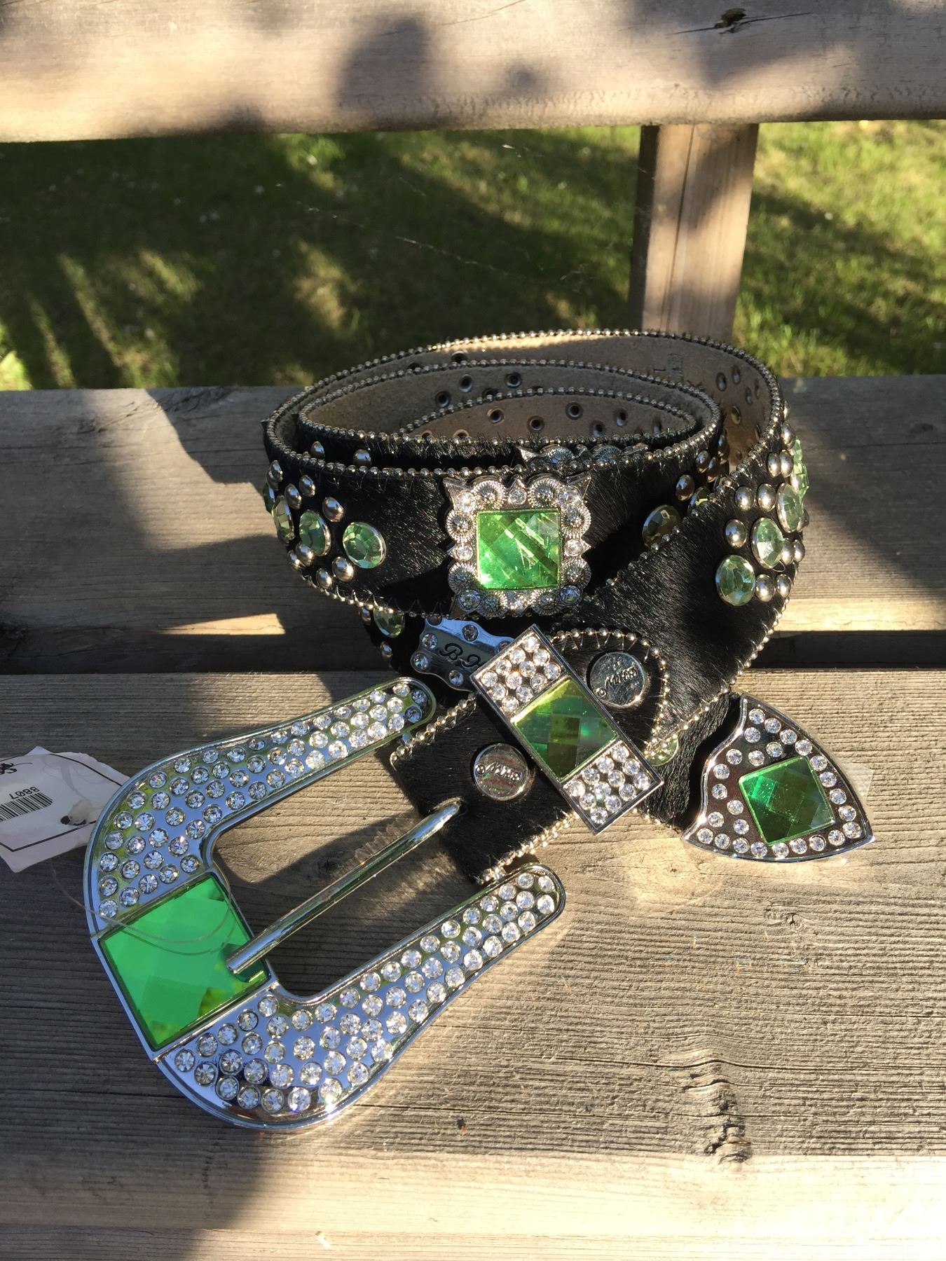 BLACK LEATHR BELT/ GREEN CRYSTAL SQUARE CONCHOS/SIZE MEDIUM