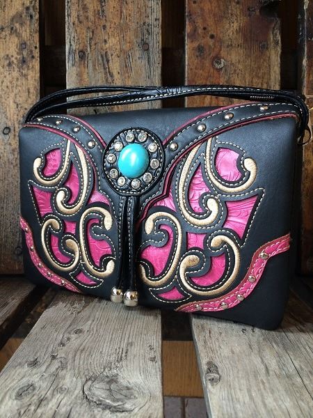 BLACK/PINK SCROLLING/TURQUOISE STONE MESSENGER WALLET-INSIDE AND OUTSIDE HAS ZIPPER COMPARTMENTS, CR