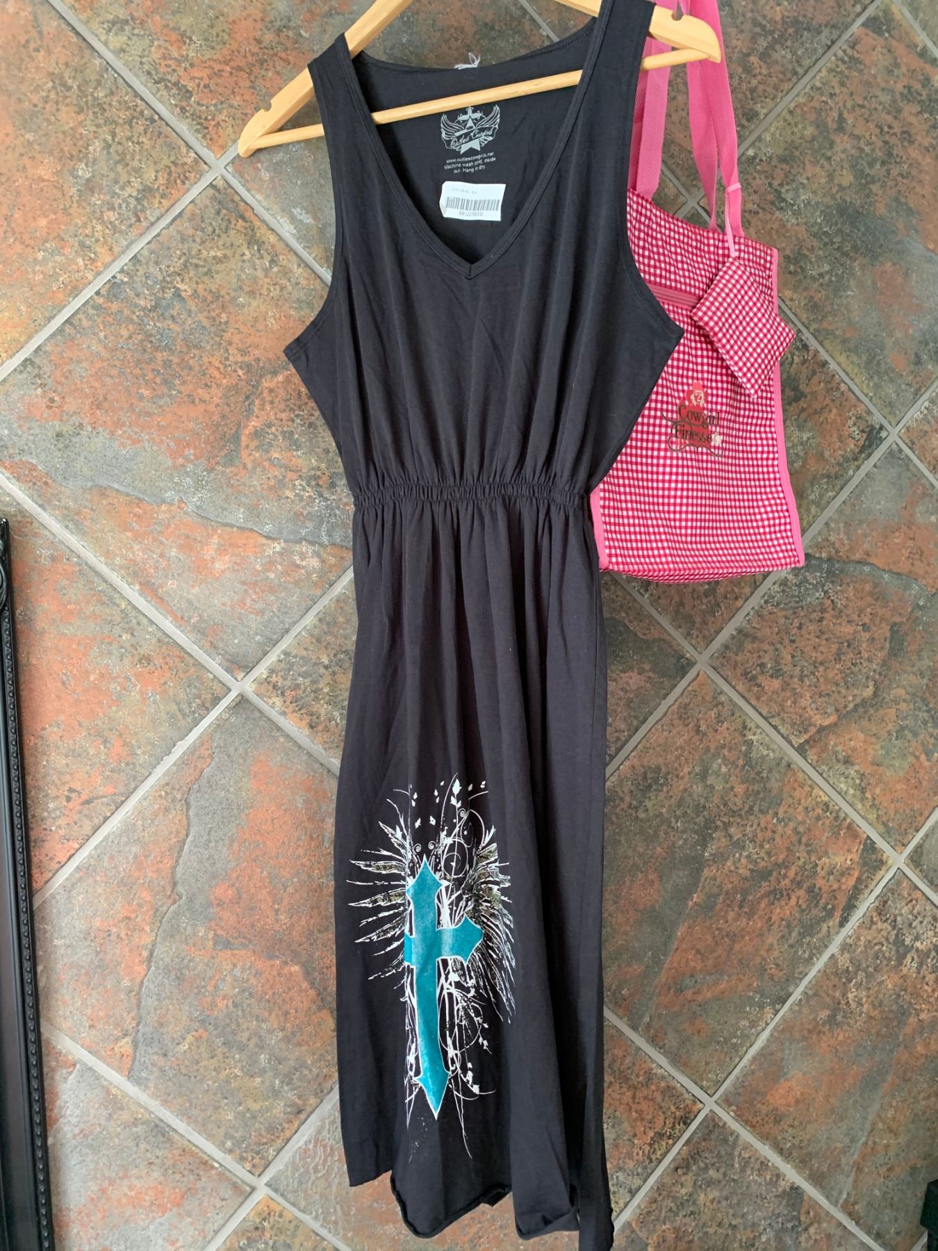BLACK TANK TOP DRESS/TURQUOISE CROSS DESIGN ON BOTTOM/SIZE LARGE/ COWGIRL FINESSE FINESSE TOTE BAG
