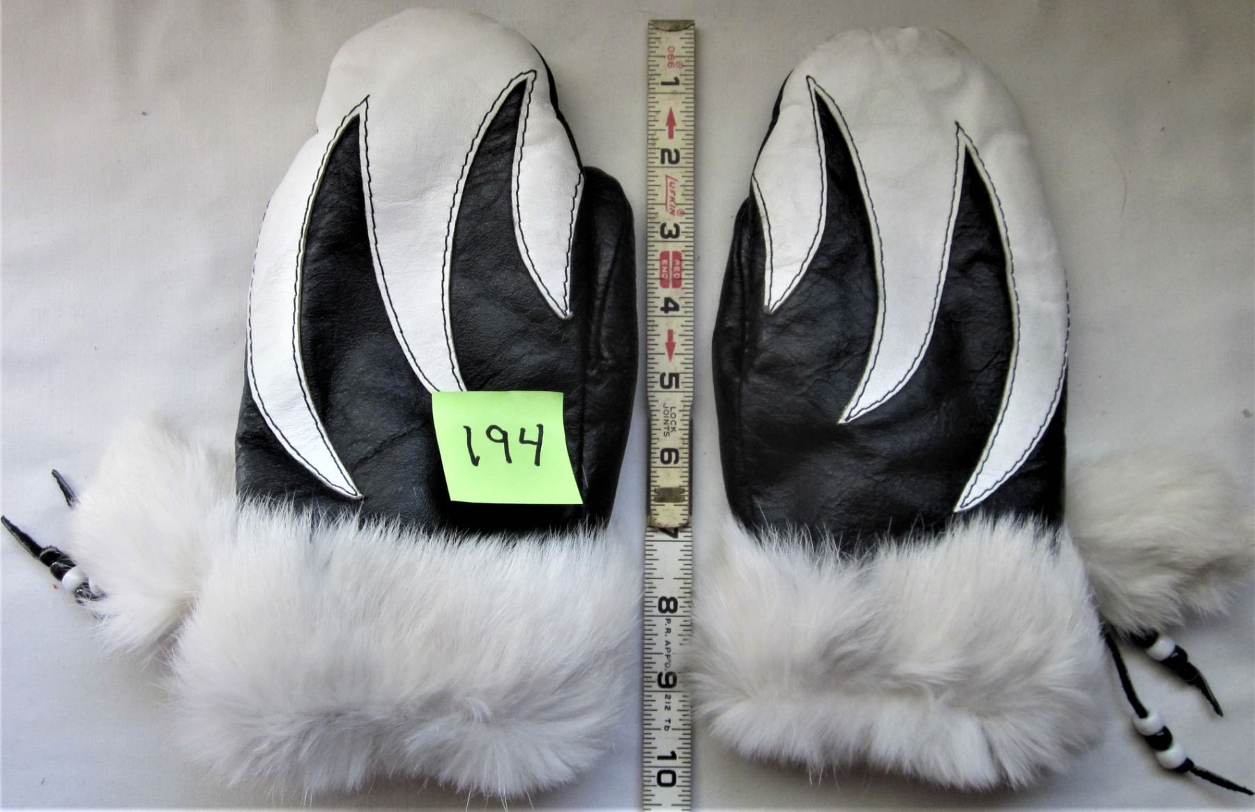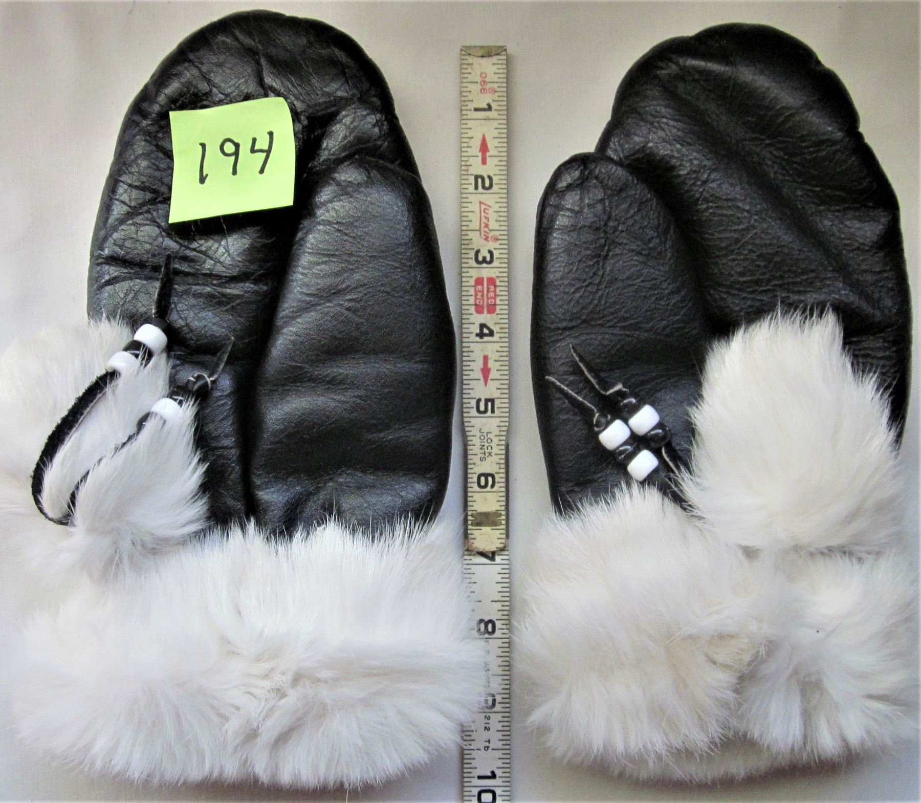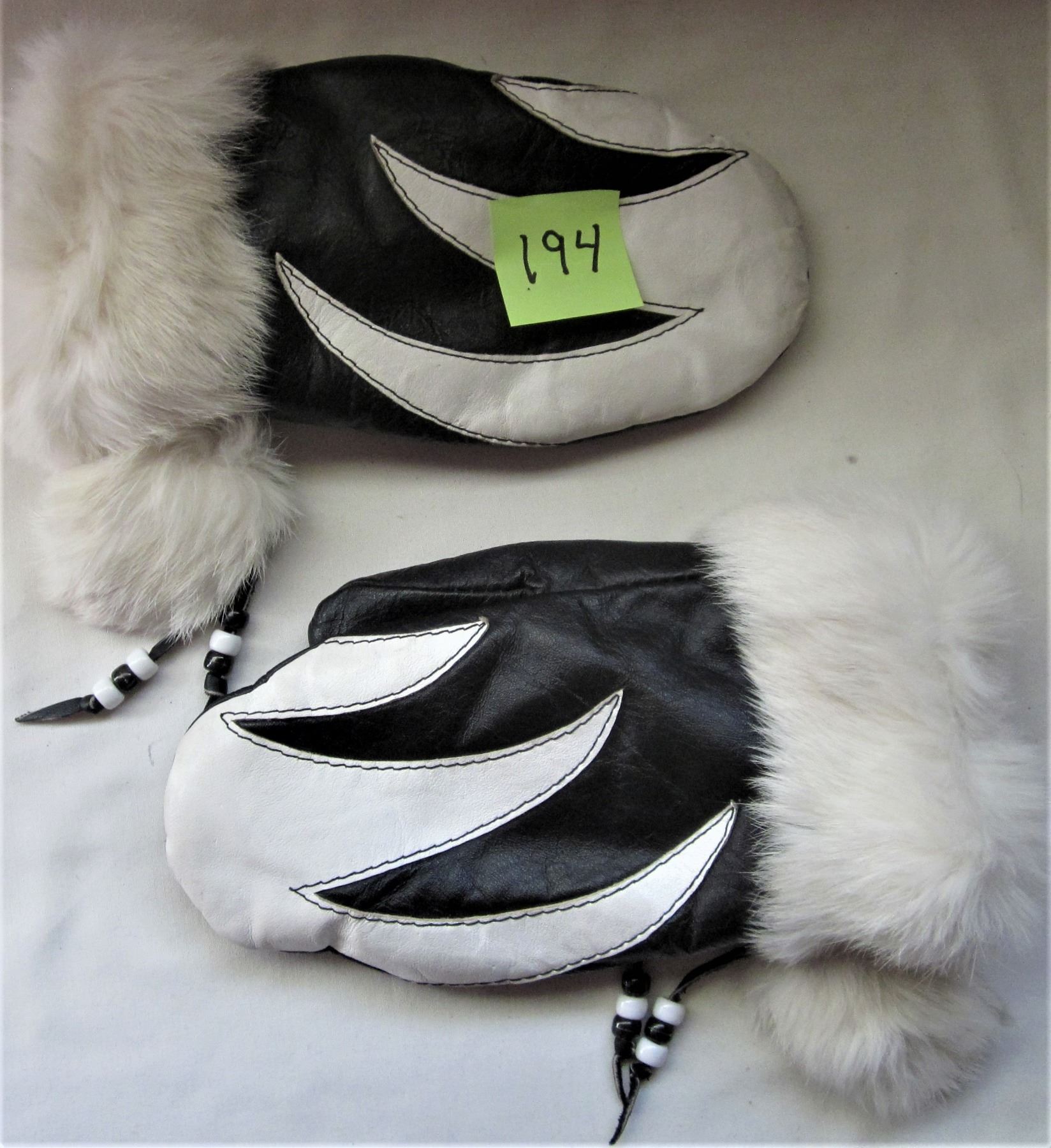 BLACK & WHITE LEATHER LINED MITTS, WHITE FUR TRIM
