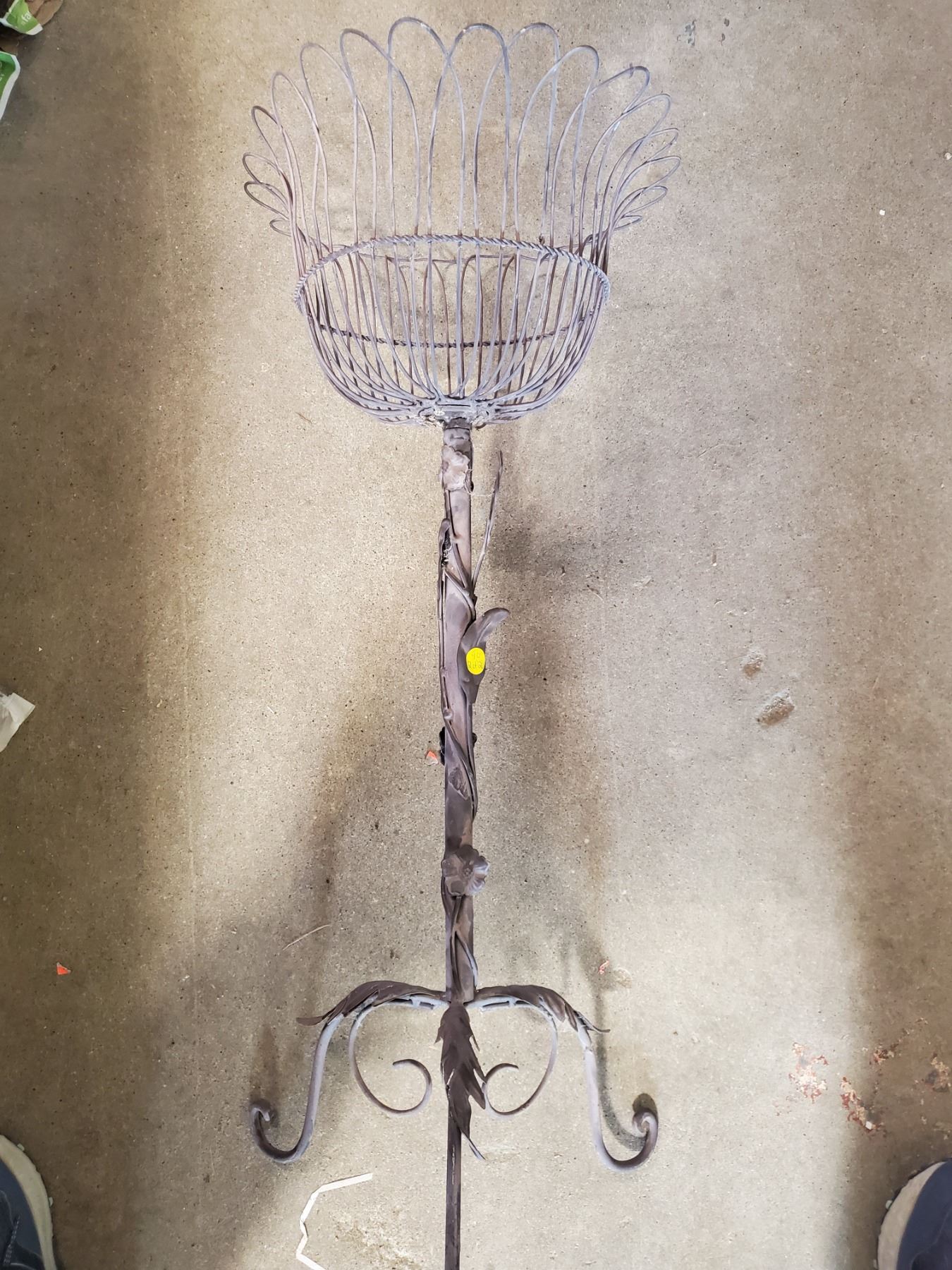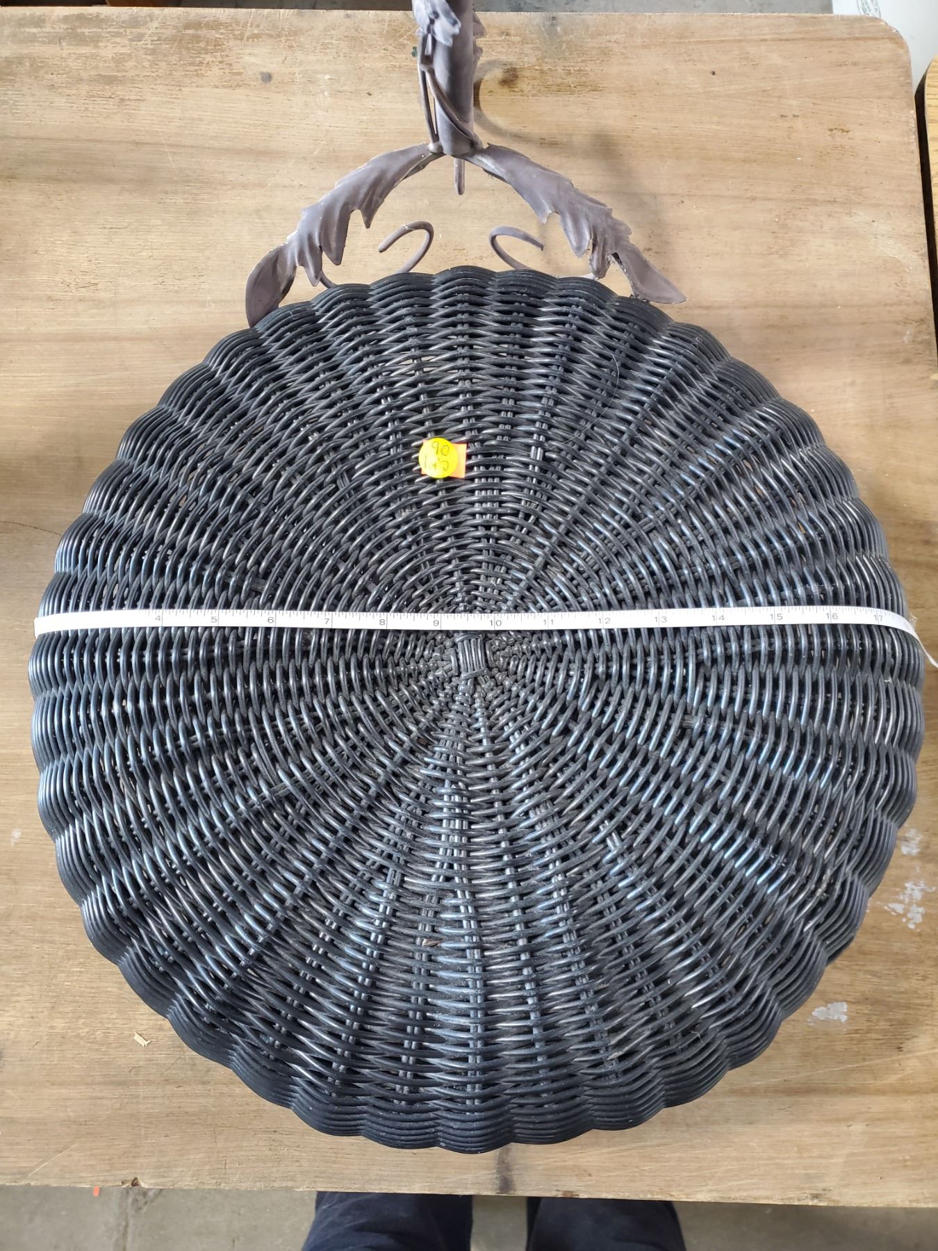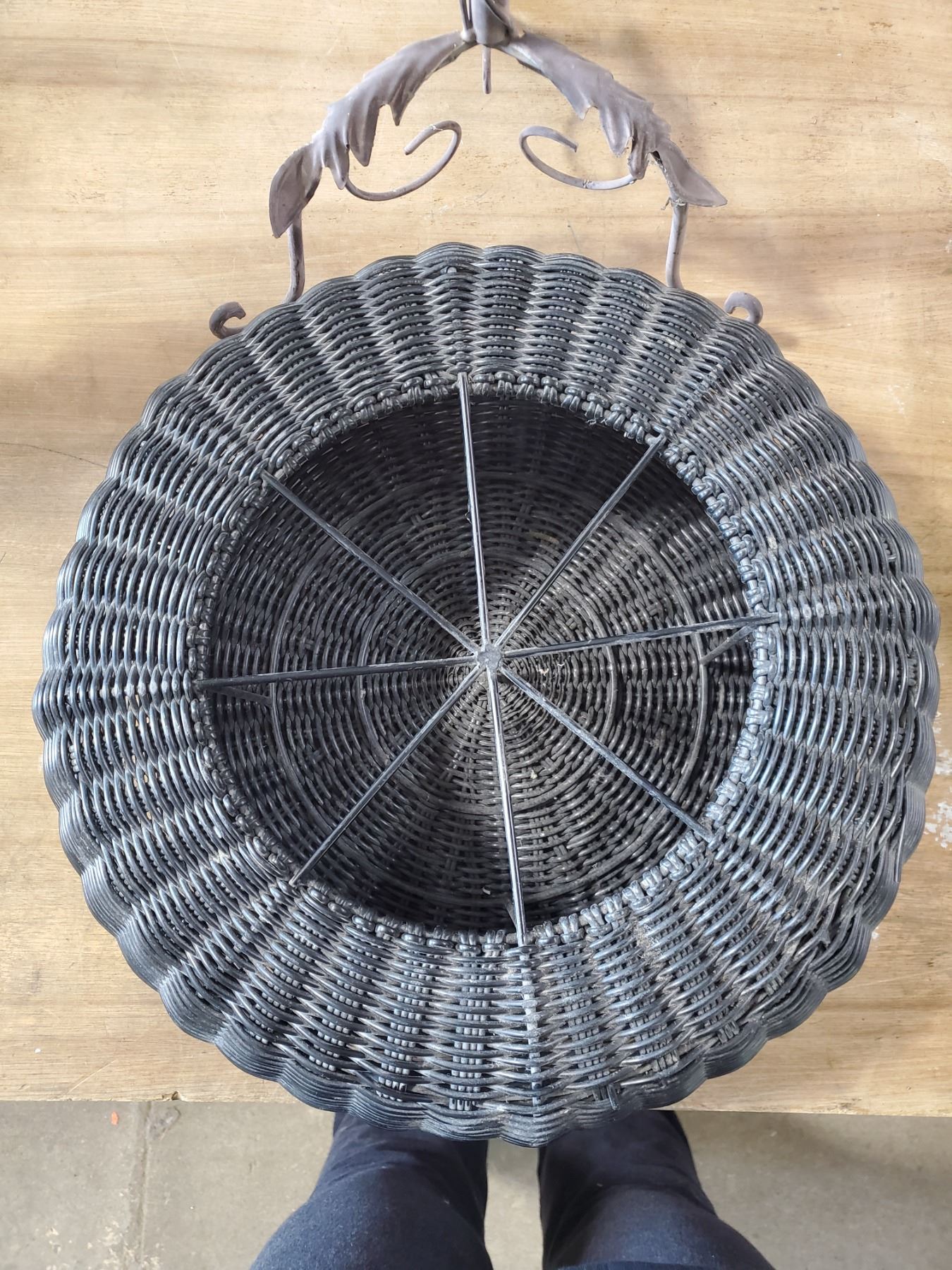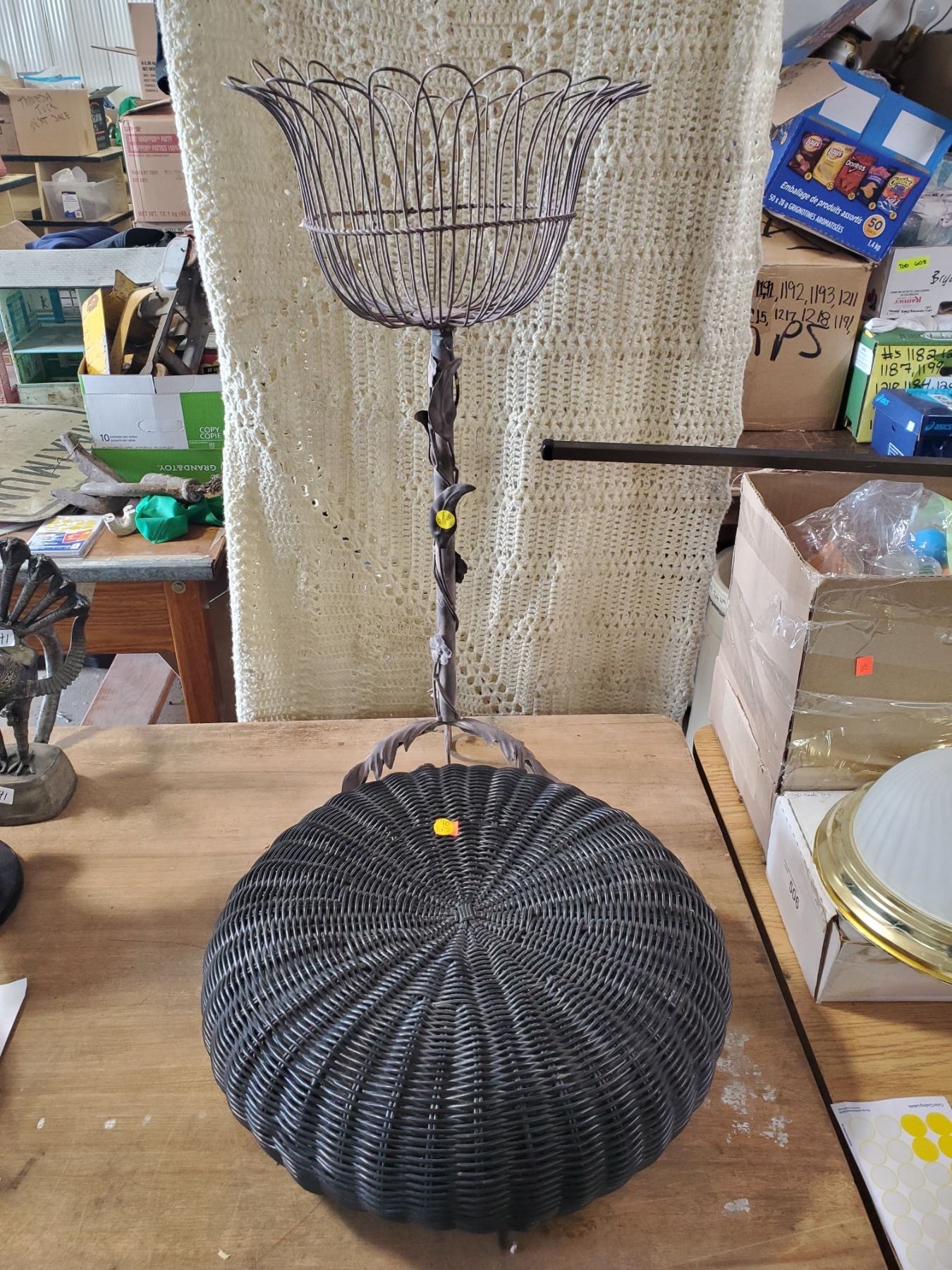 BLACK WICKER STOOL AND BROWN METAL 3 SHELF PLANT STAND