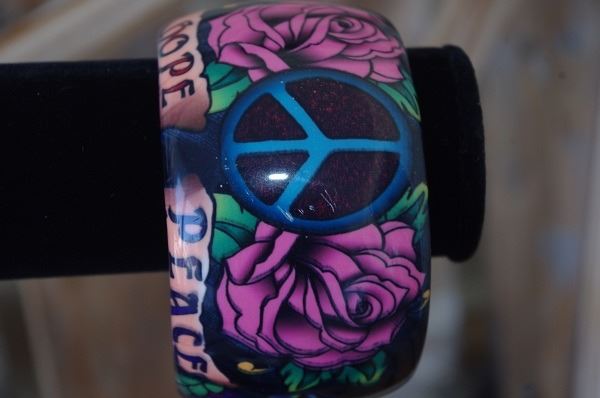 BLACK WIDE CUFF BRACELET PINK AND TURQUOISE HOPE AND PEACE DESIGN