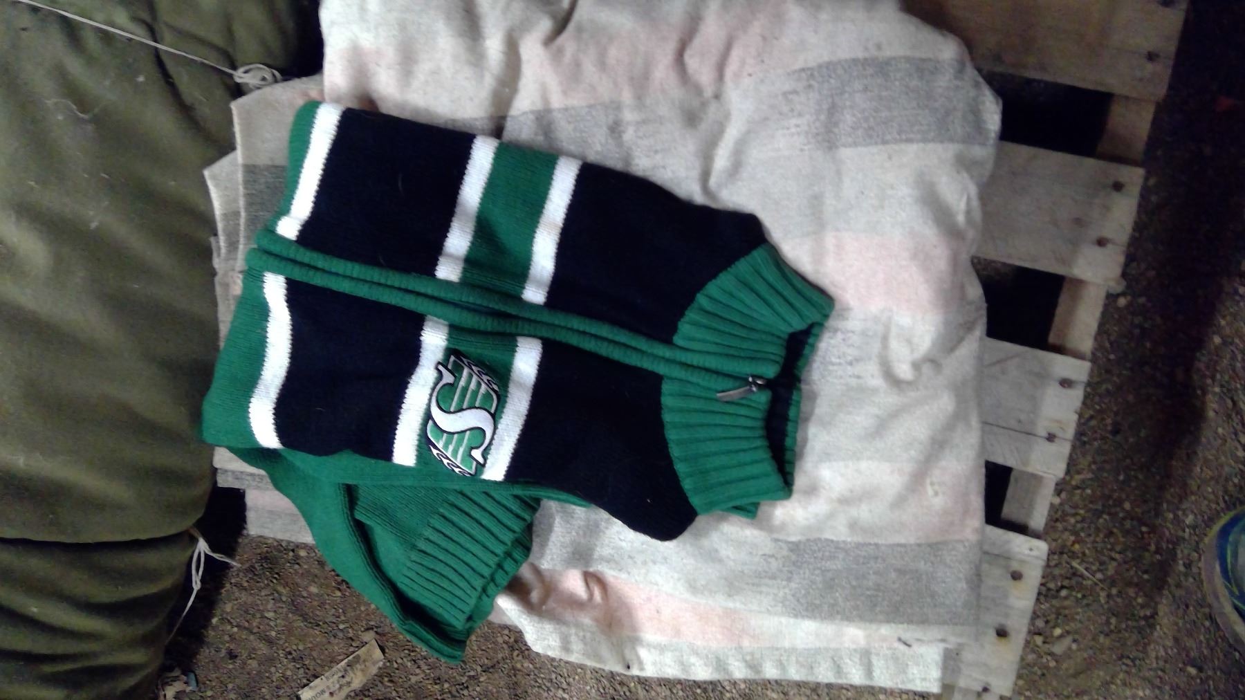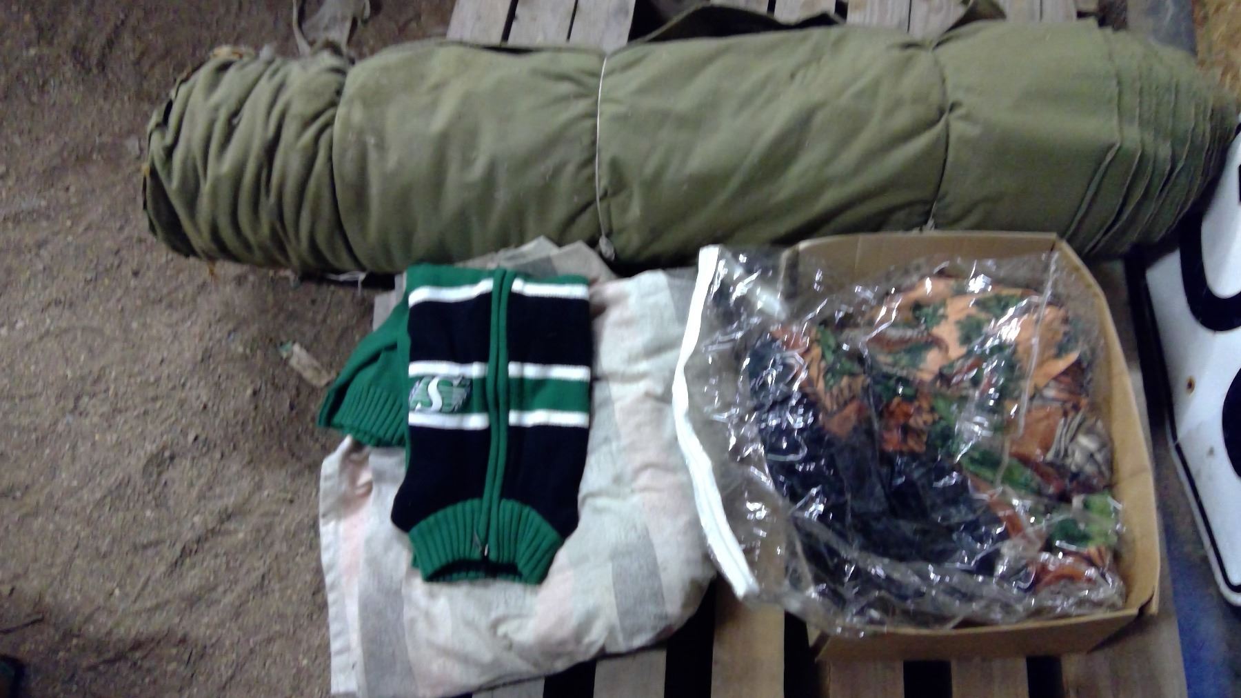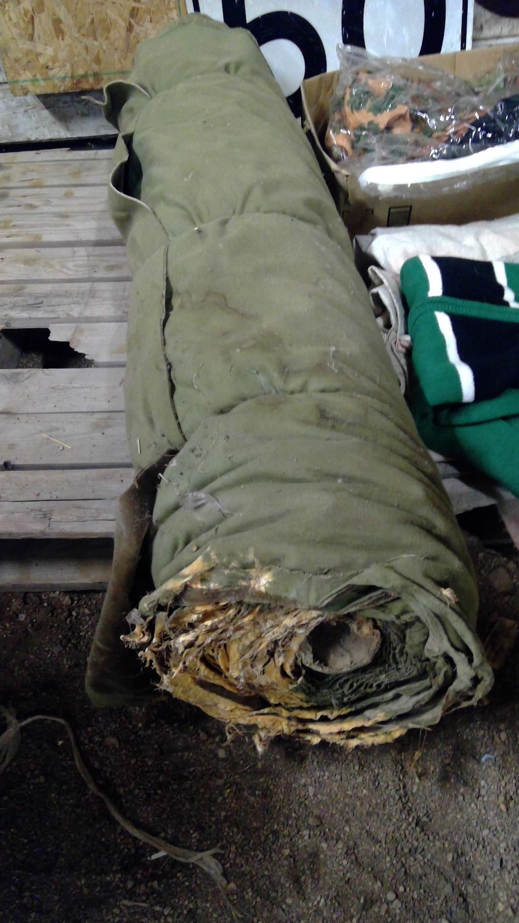 BLANKETS, ROUGHRIDER SWEATER AND LARGE ROLL OF INSULATED CANVAS