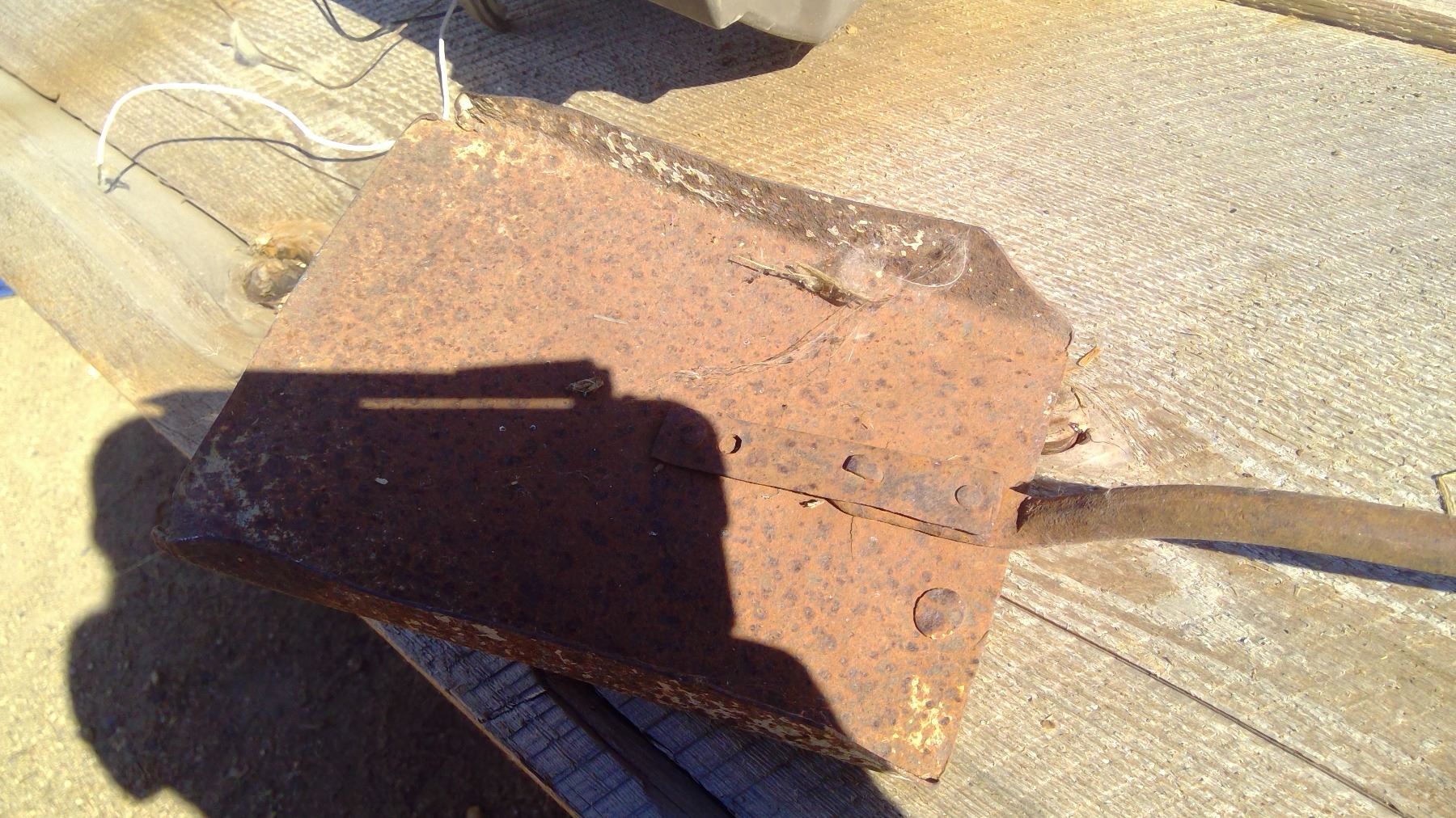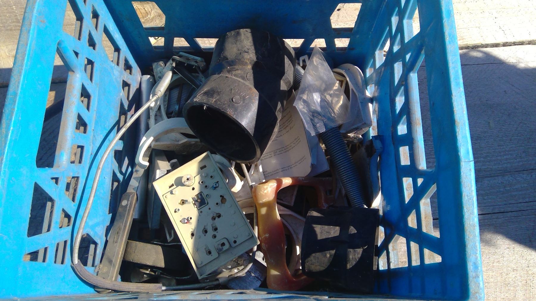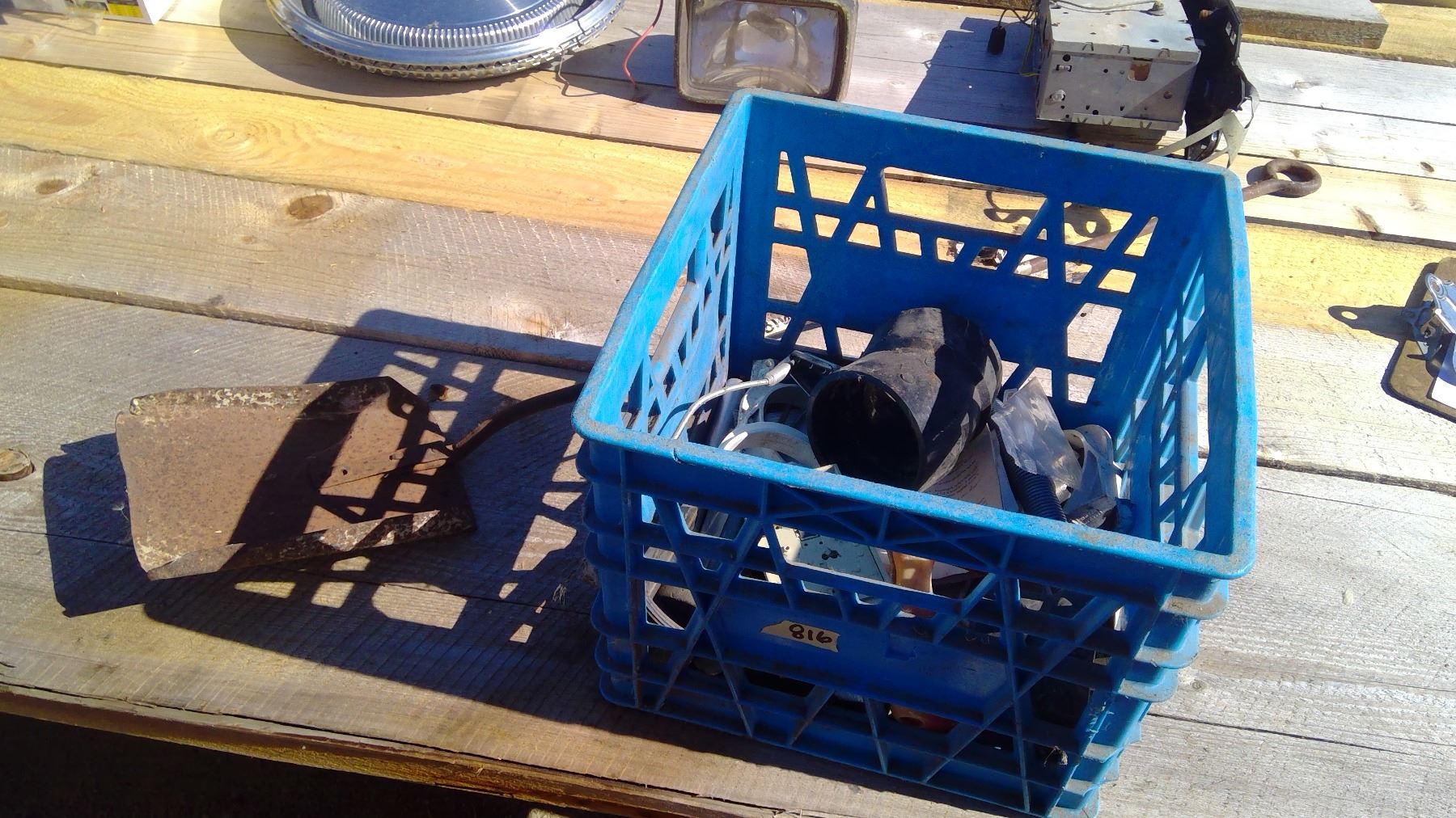 BLUE CRATE ASSORTED HOUSE PARTS AND OLD METAL SHOVEL