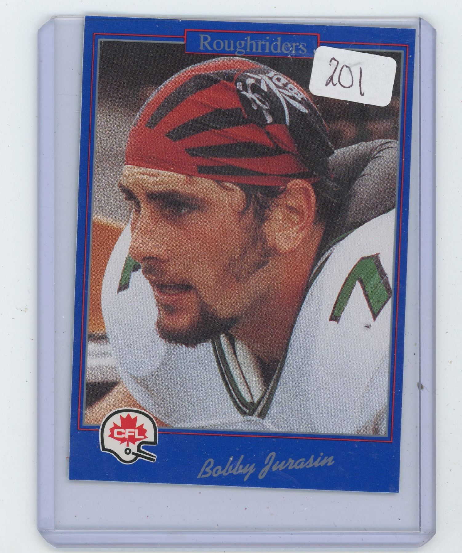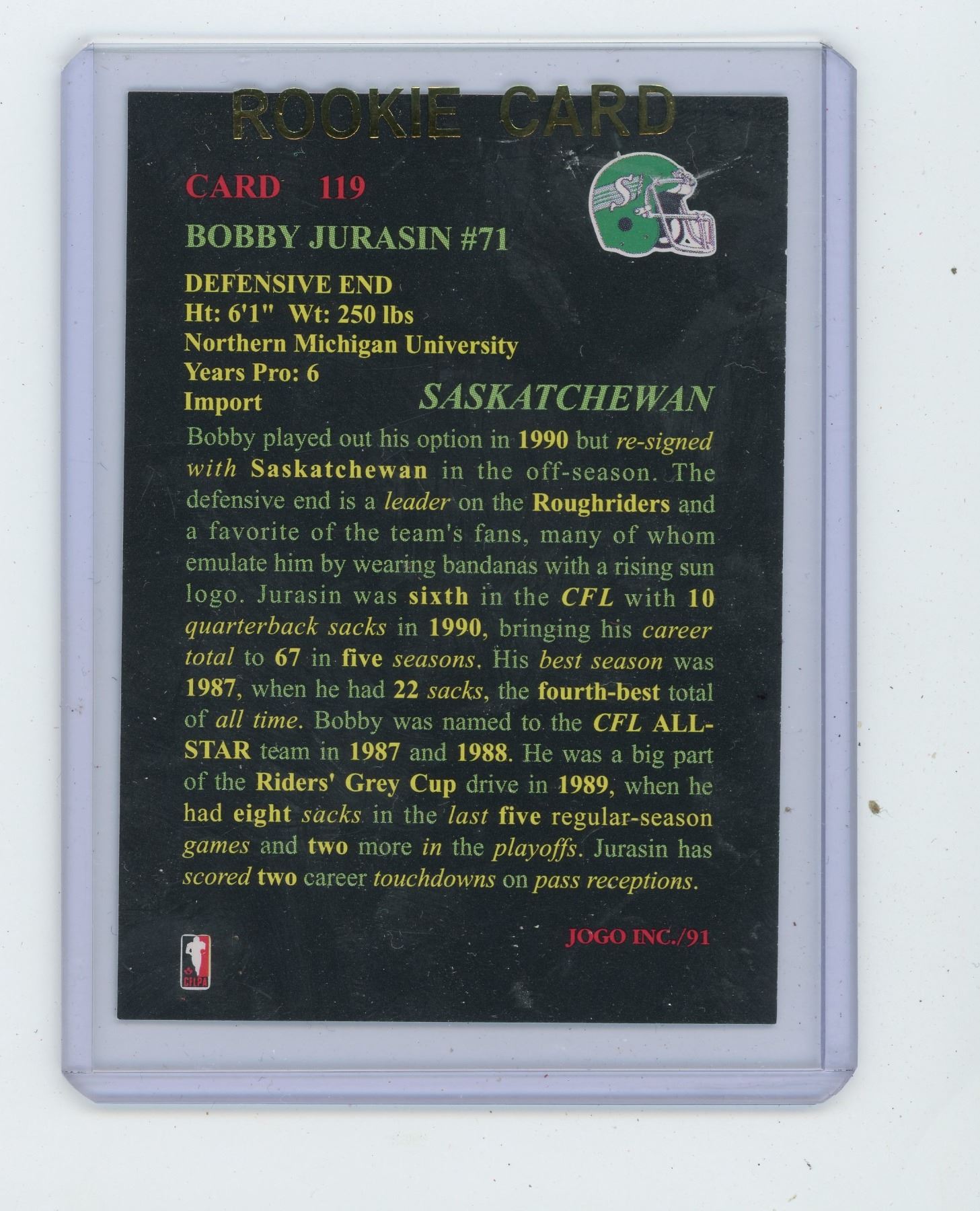 BOBBY JURASIN, SASKATCHEWAN ROUGHRIDERS DE, CFL FOOTBALL CARD. 1991 JOGO. GEM UNC.