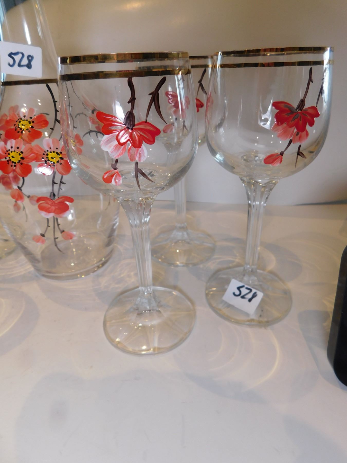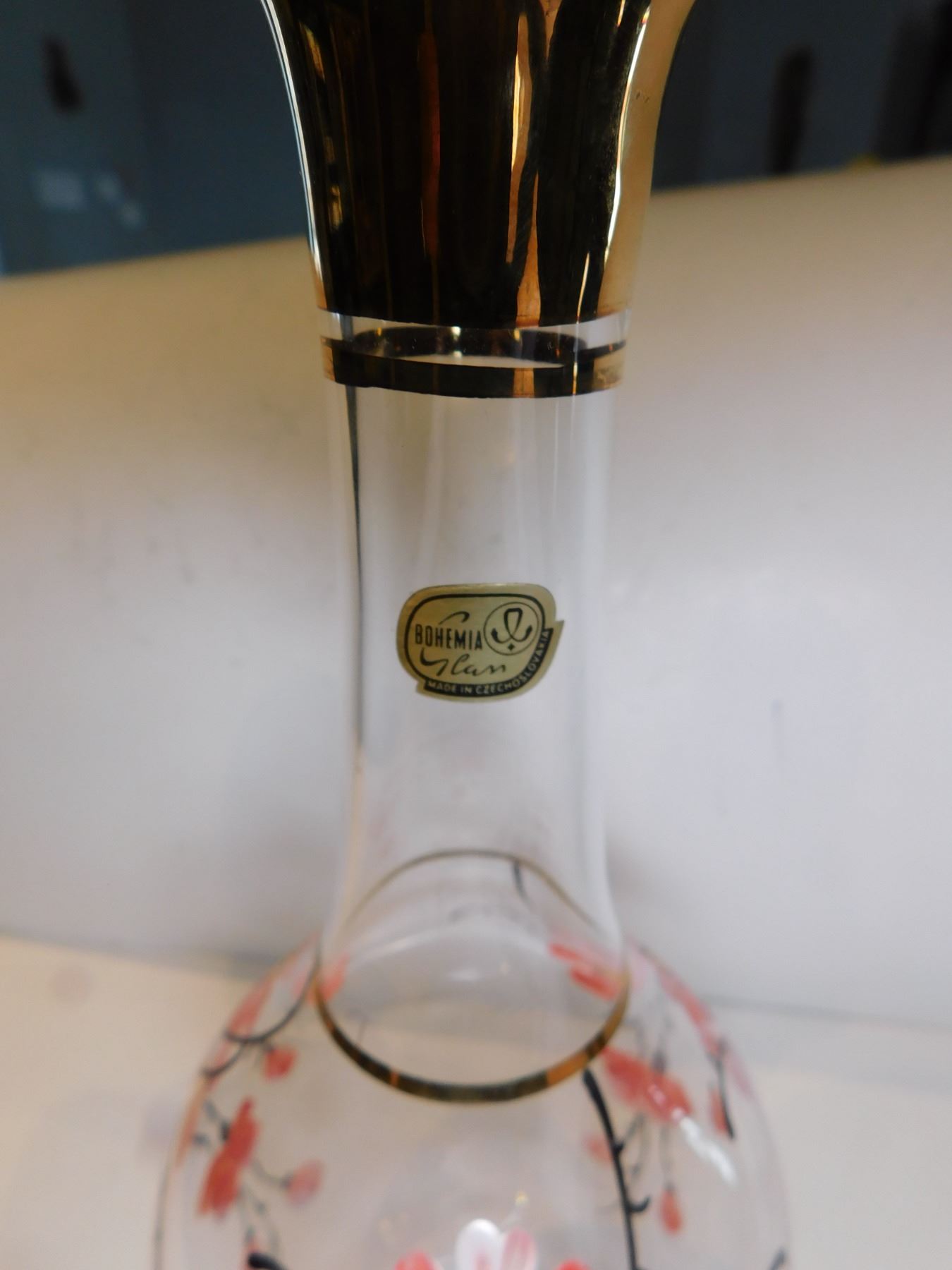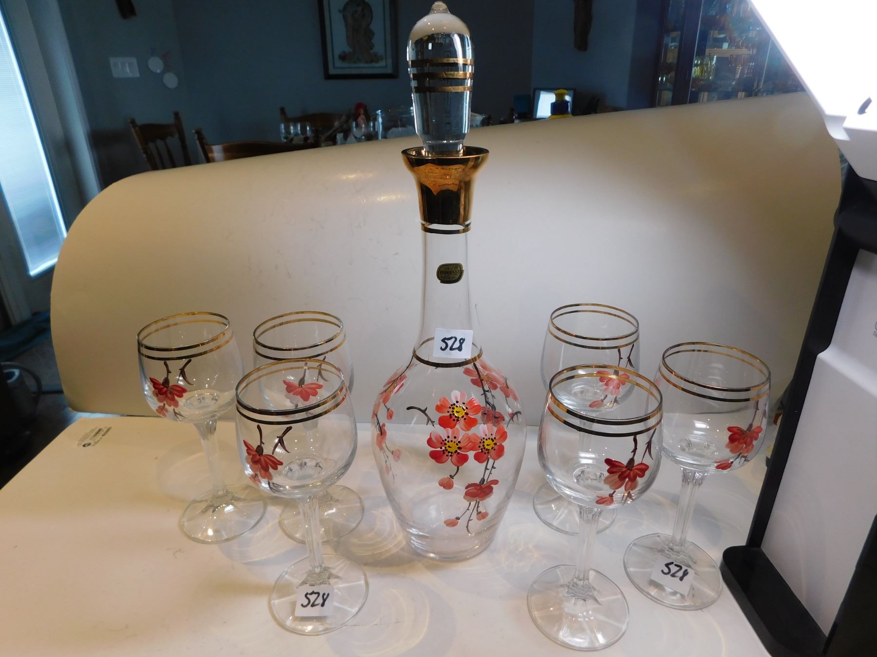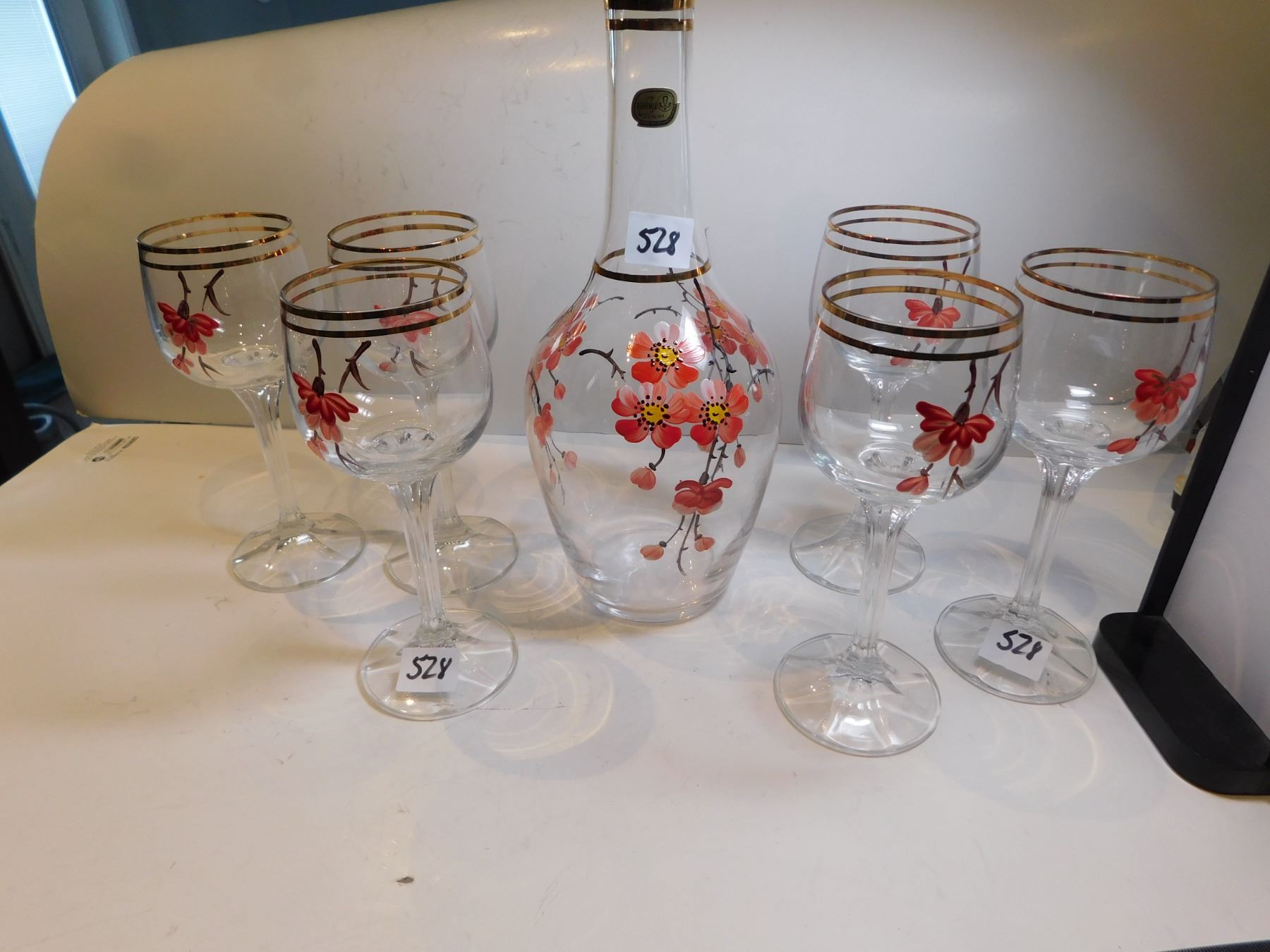 BOHEMIAN PAINTED GLASS CARAFE WITH LID AND SIX MATCHING GLASSES