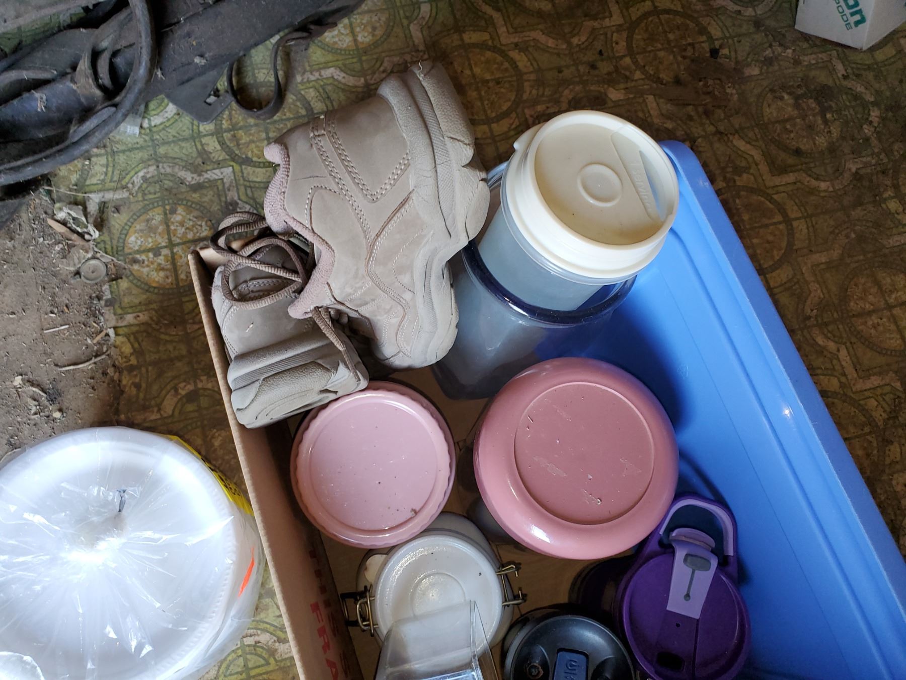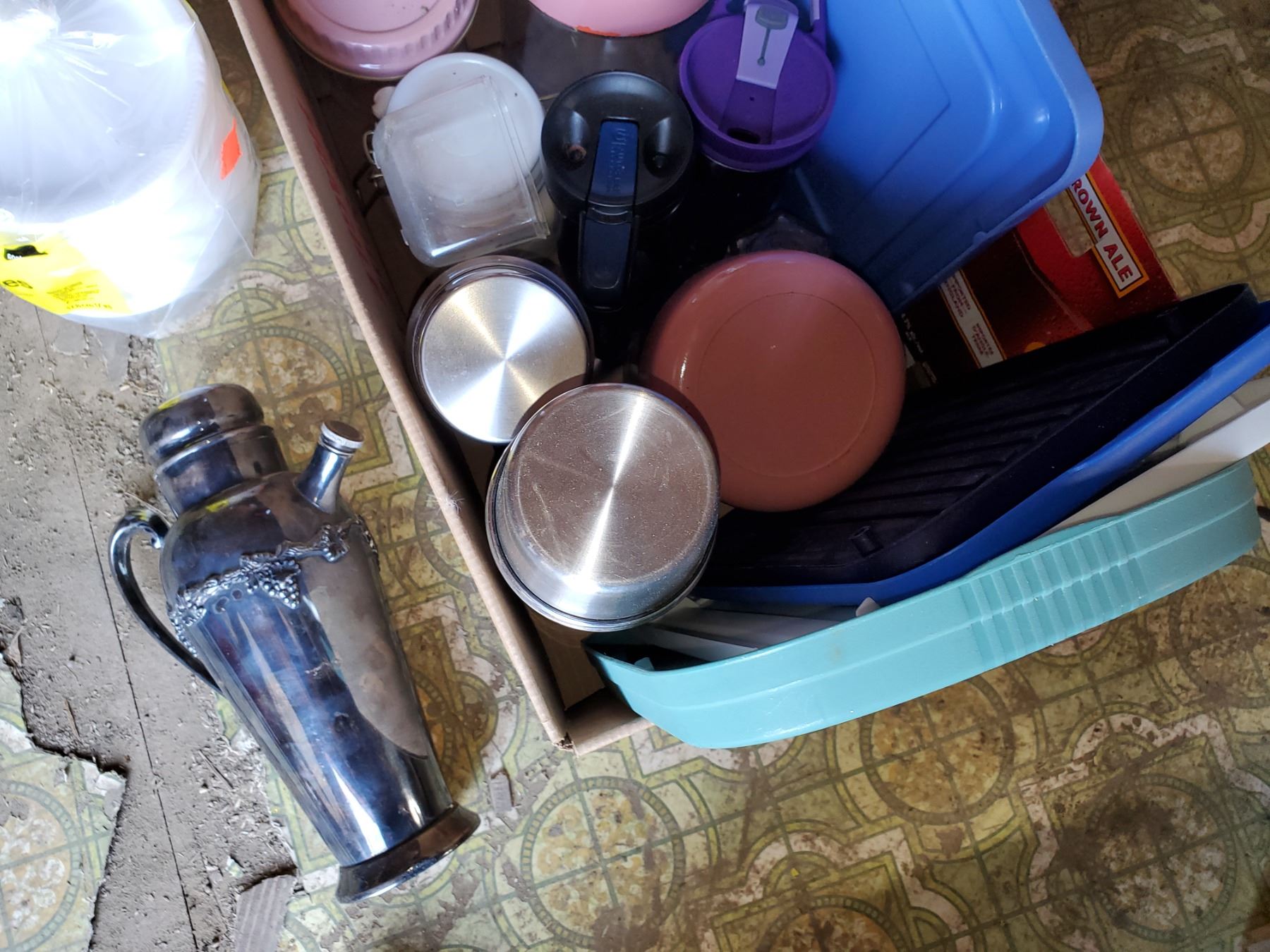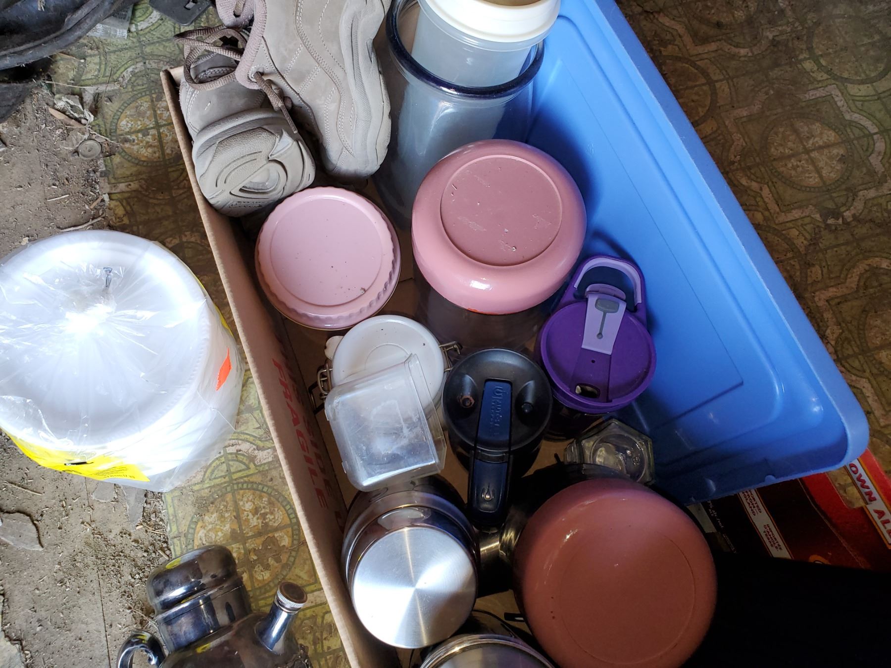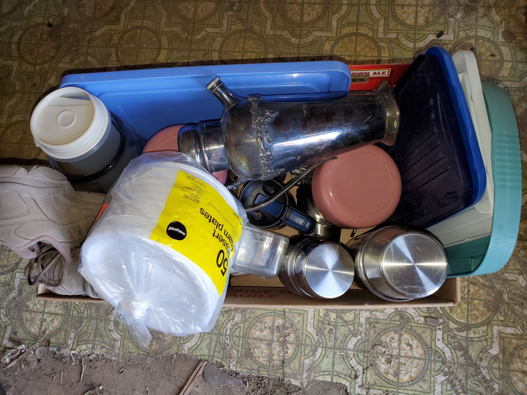 BOX FULL OF THERMOS', HOUSEHOLD CANISTERS, ETC