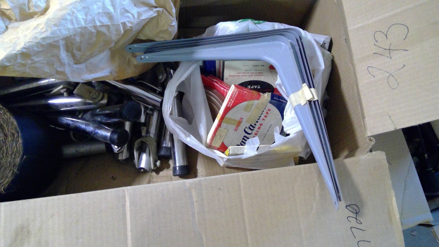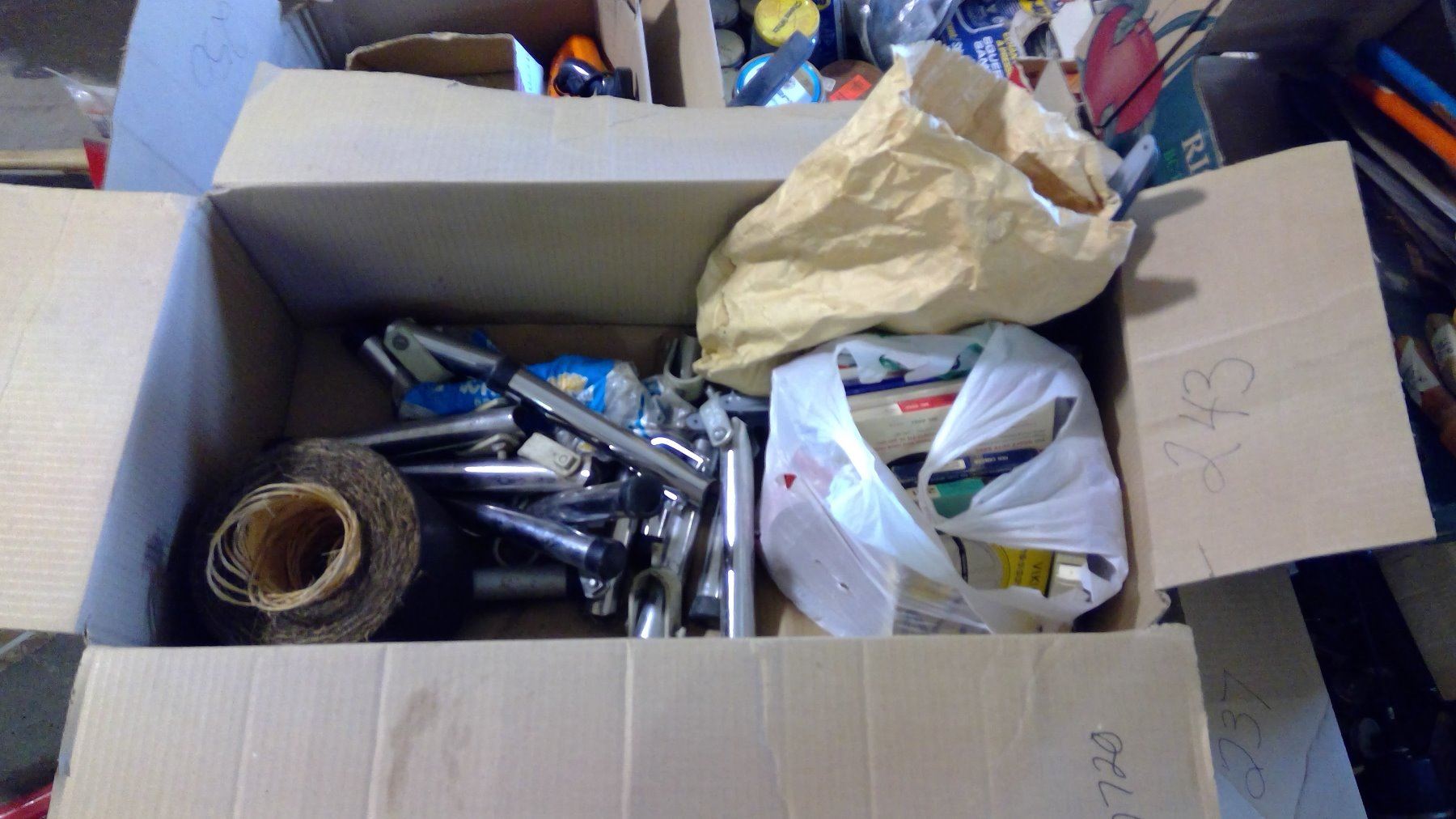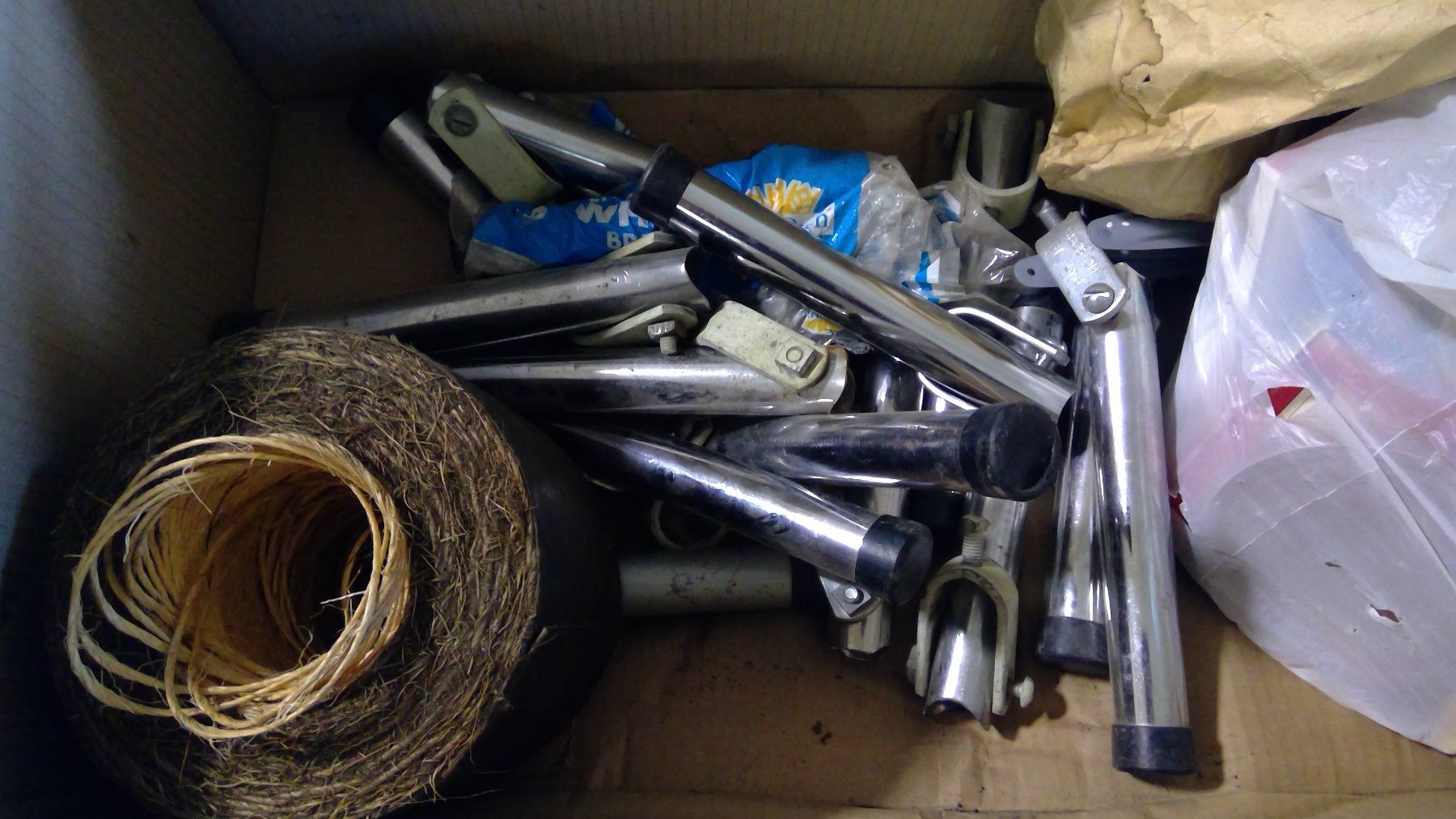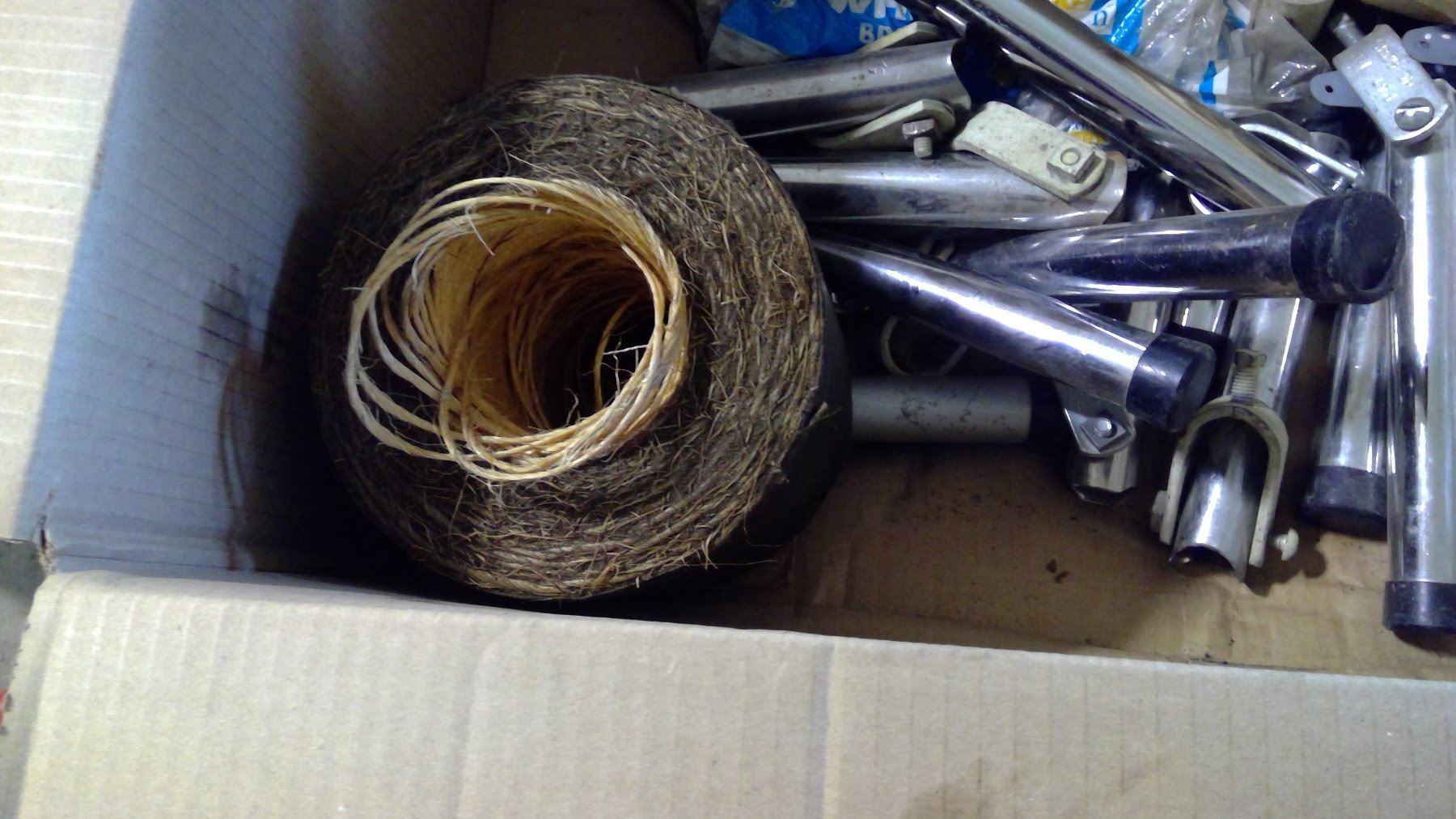 BOX OF ASSORTED ITEMS - BRACKETS, TWINE, ETC.