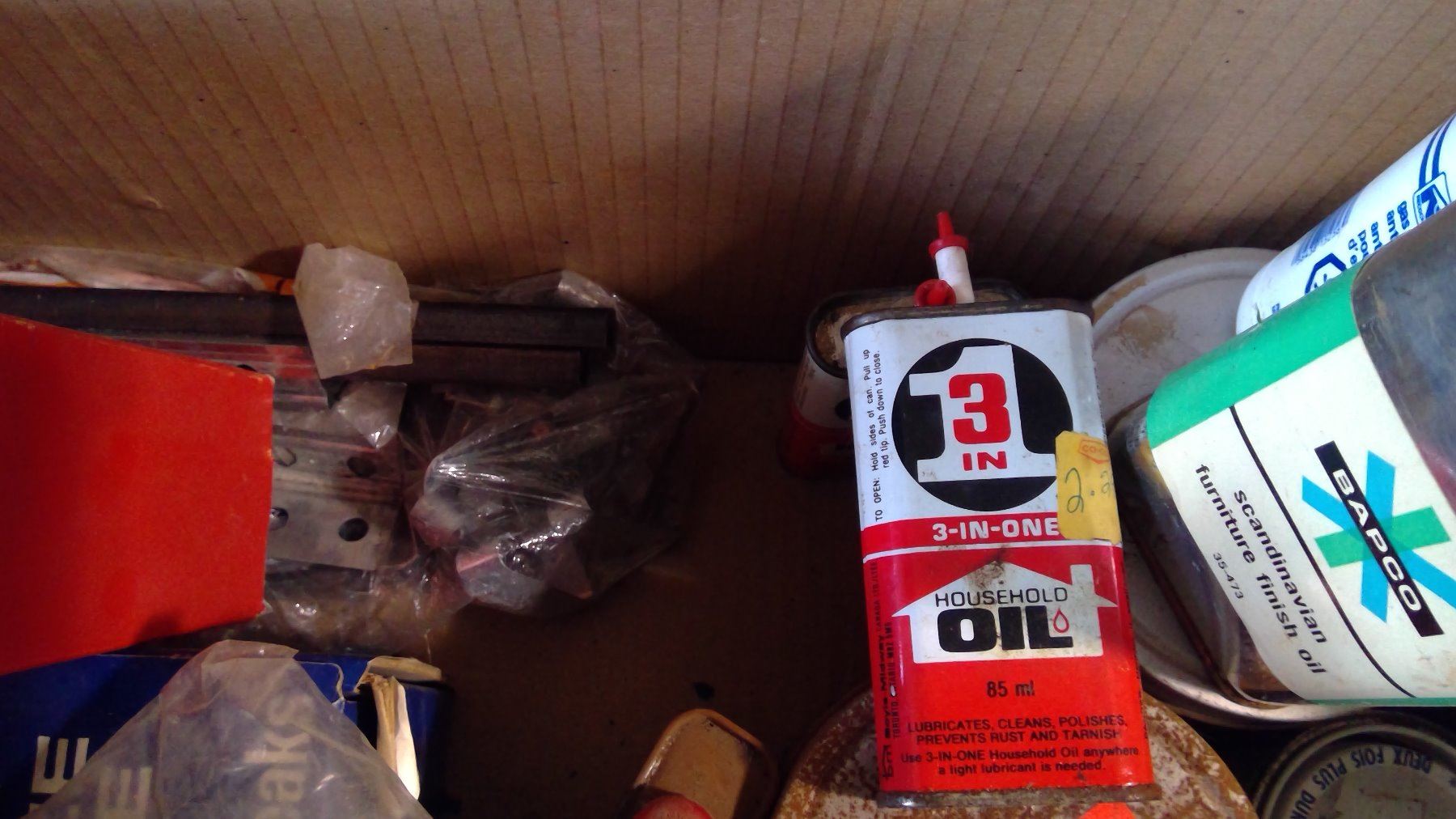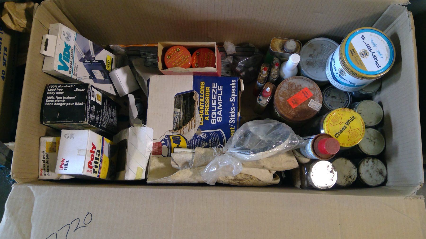 BOX OF ASSORTED ITEMS - EXPOXY ENAMEL, CIGARETTE TINS, WD40, ETC.