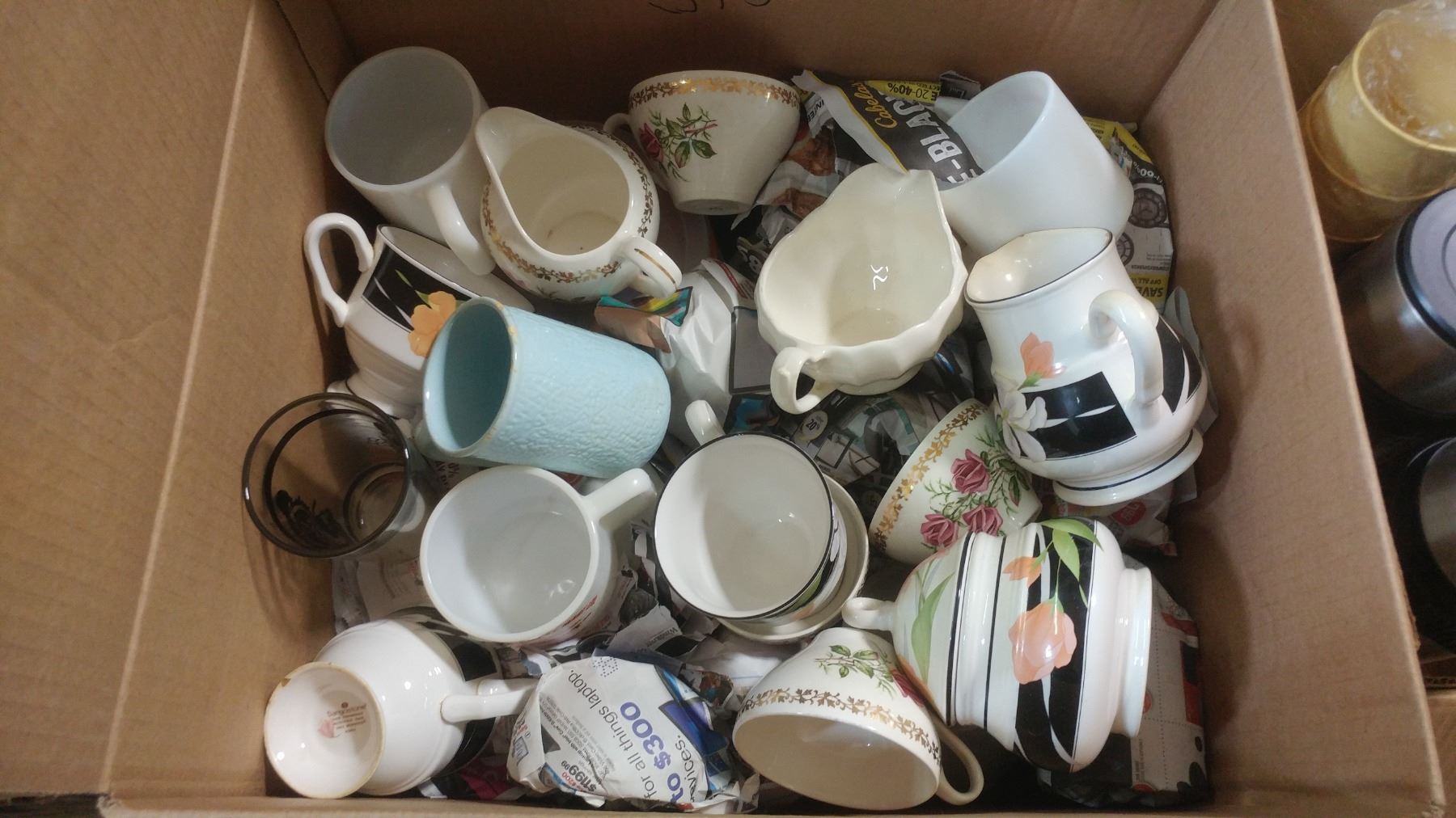 BOX OF ASSORTED ITEMS - MUGS, CUPS, DISHES, ETC.