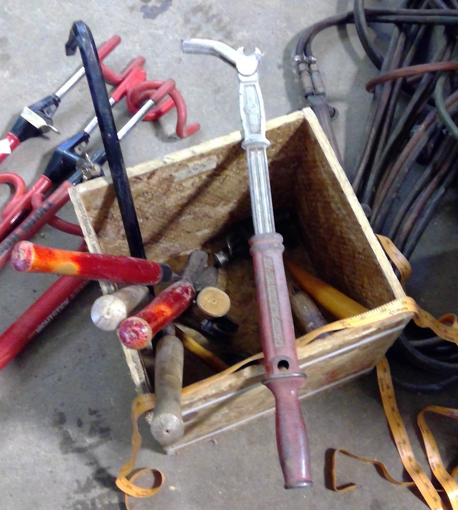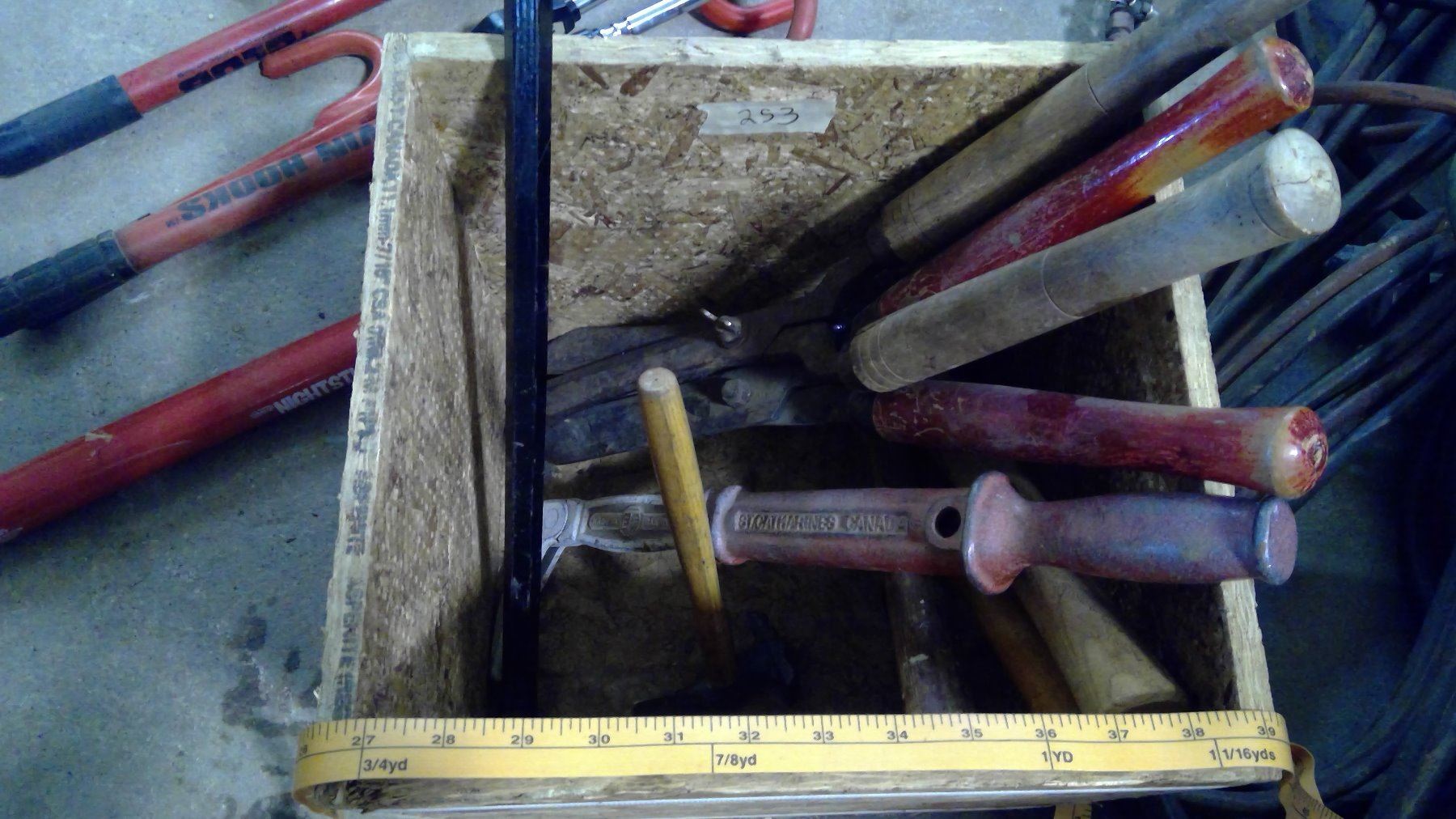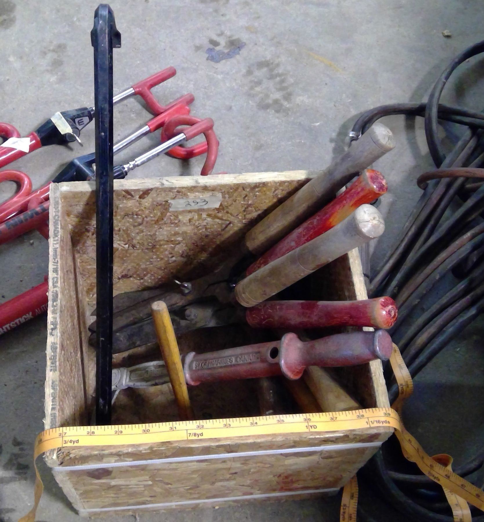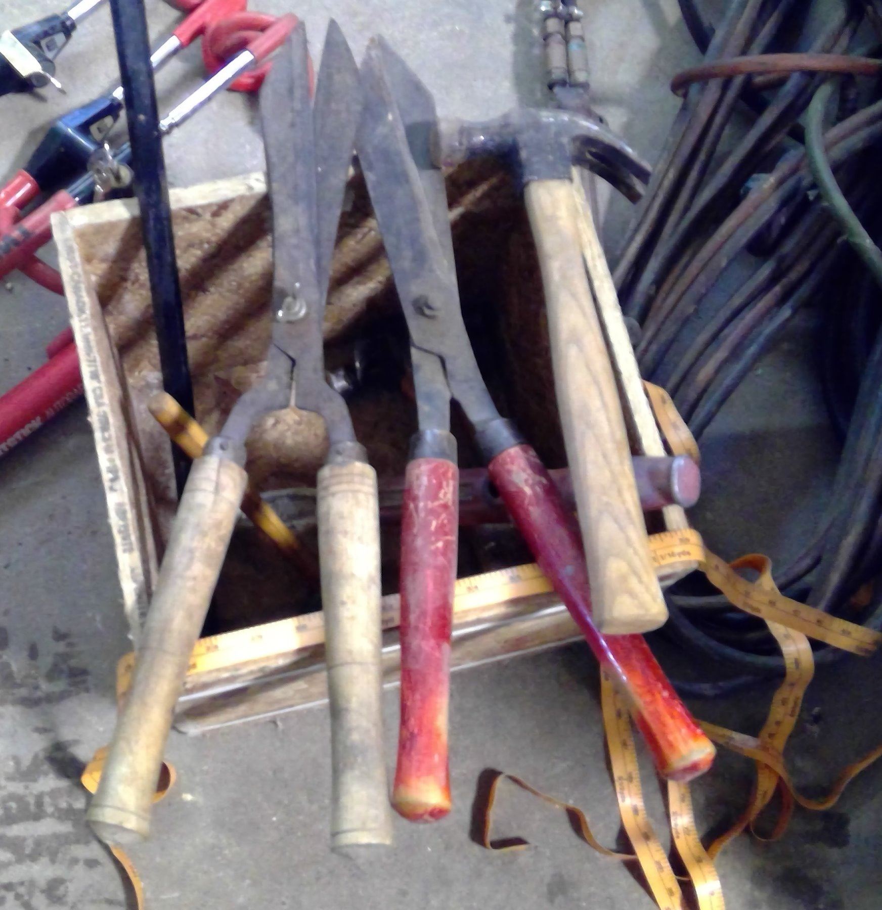 BOX OF ASSORTED TOOLS - CLIPPERS, HAMMERS, ETC.