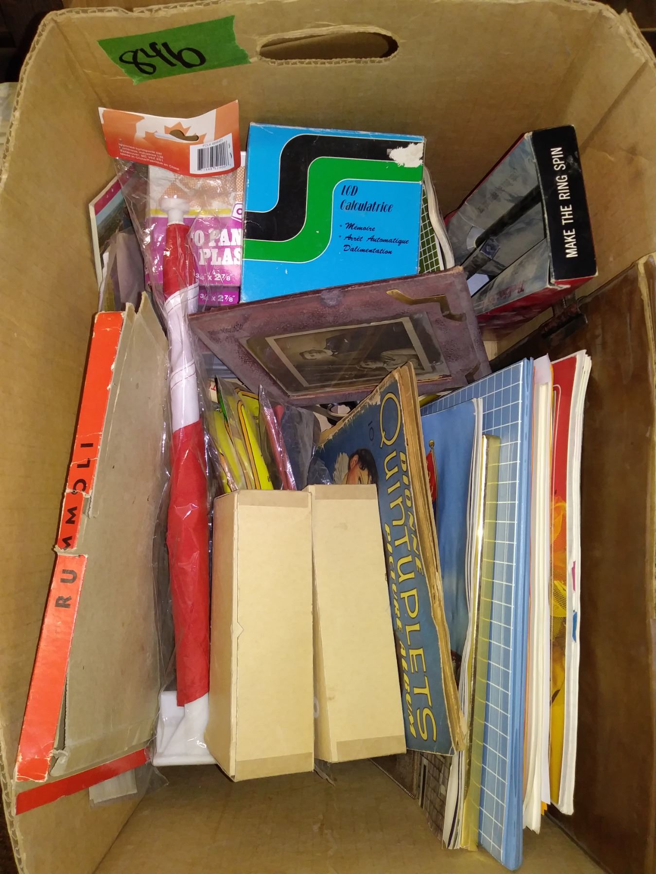 BOX OF COLLECTIBLES ( NOTEPADS, BOOKS, GAMES, FIRST AID, ETC)