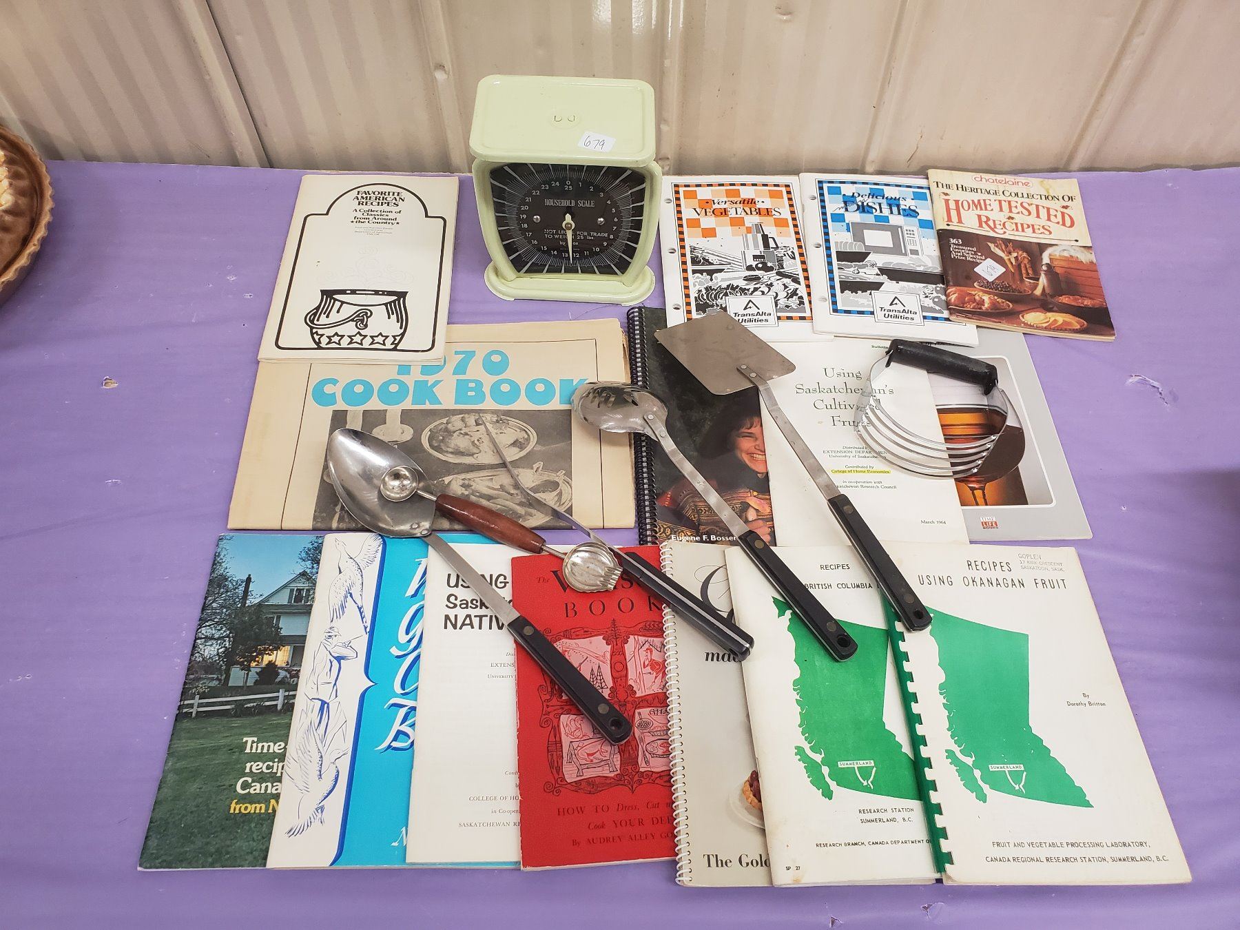 BOX OF COOK BOOKS, SCALE, KITCHEN UTENSILS