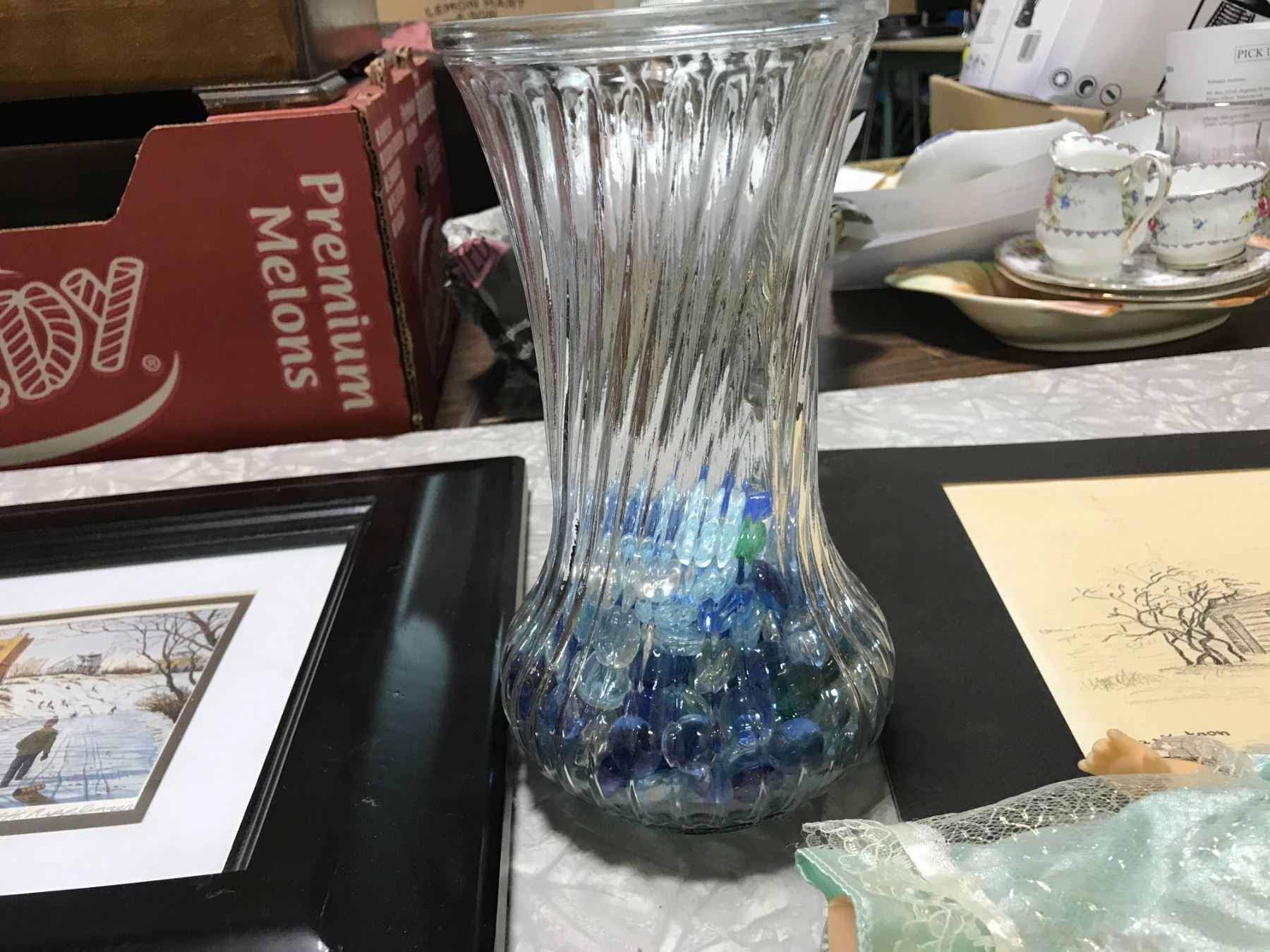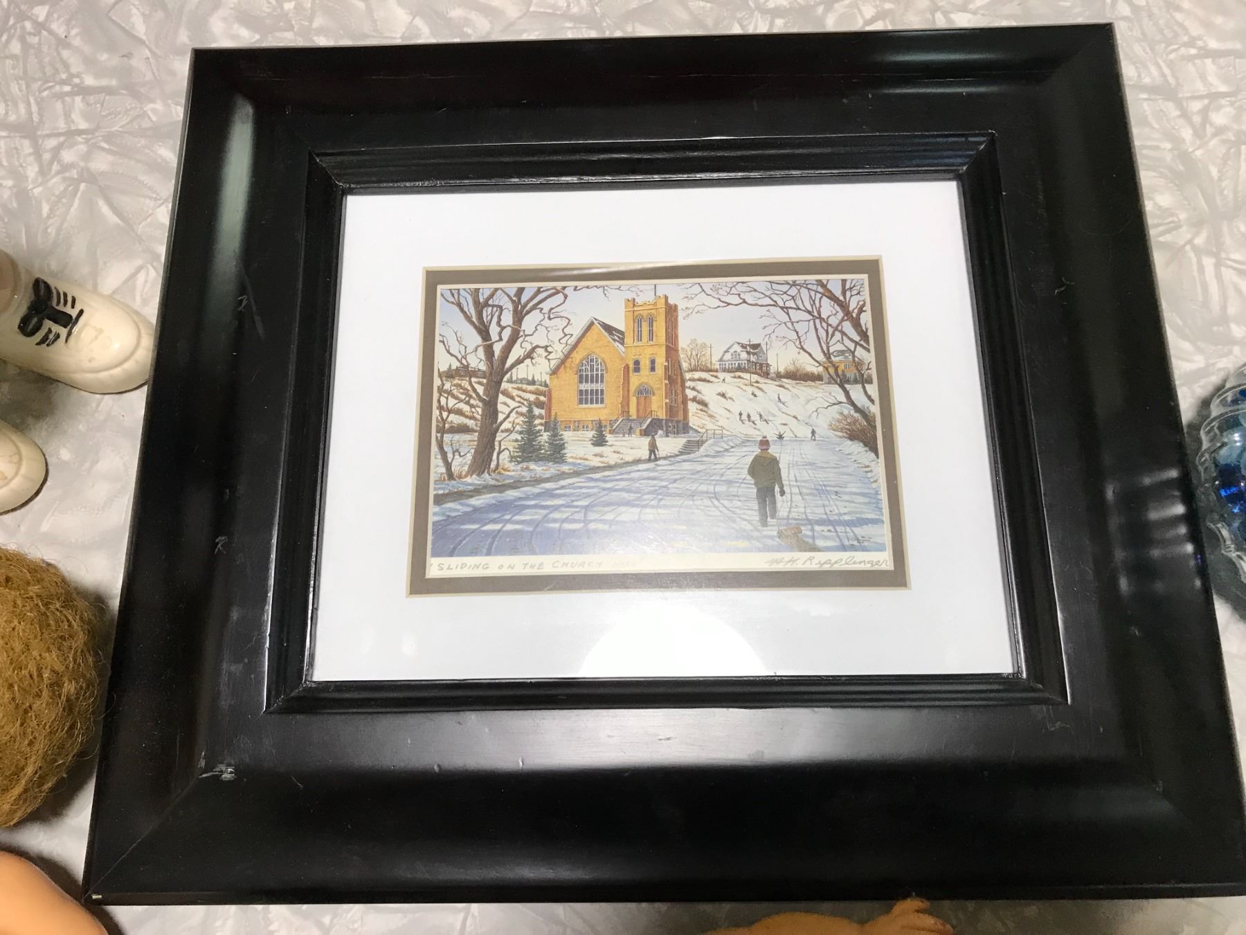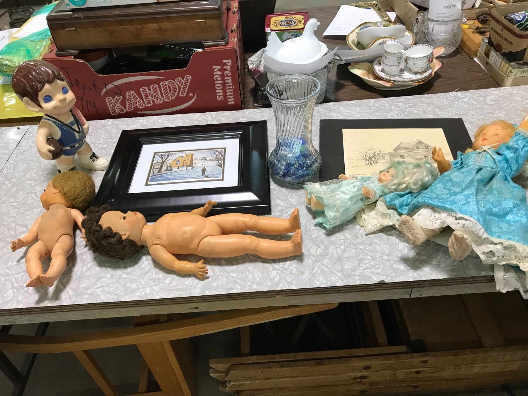BOX OF DOLLS + 2 PICTURES 1 WITH FRAME + 2 VASES