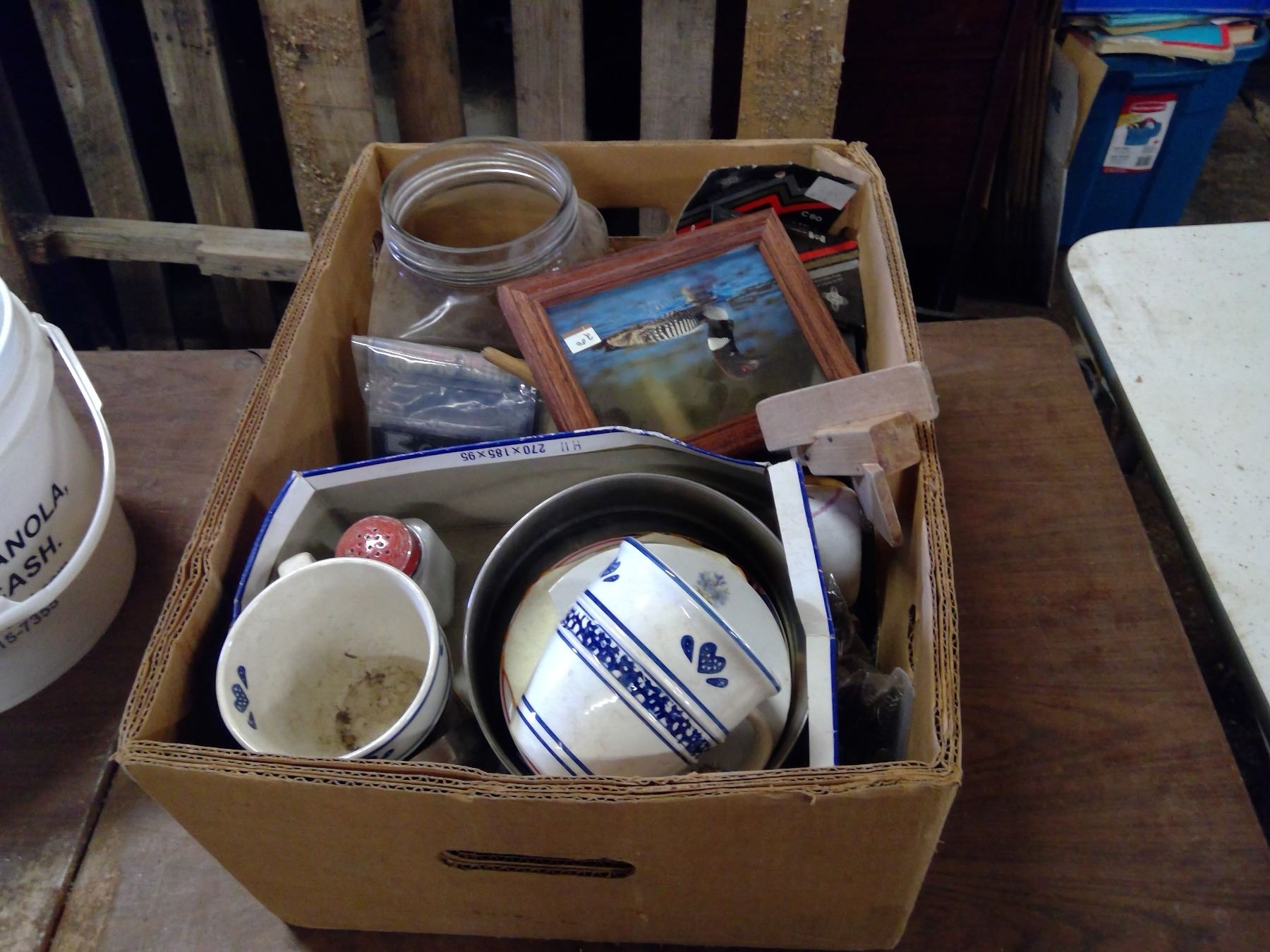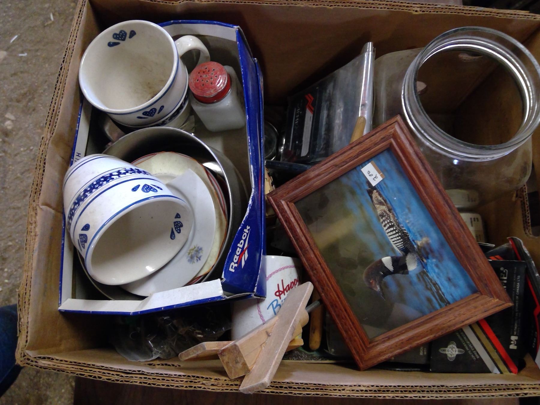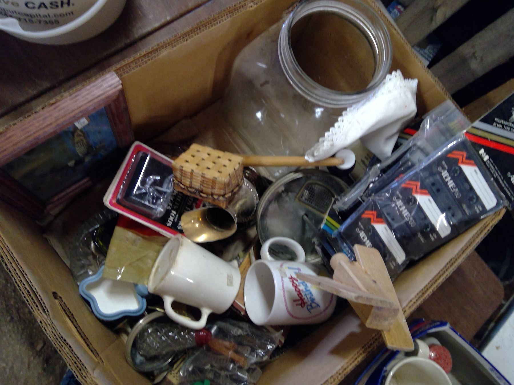 BOX OF MISC. KITCHENWARE AND ASSORTED HOUSEHOLD ITEMS