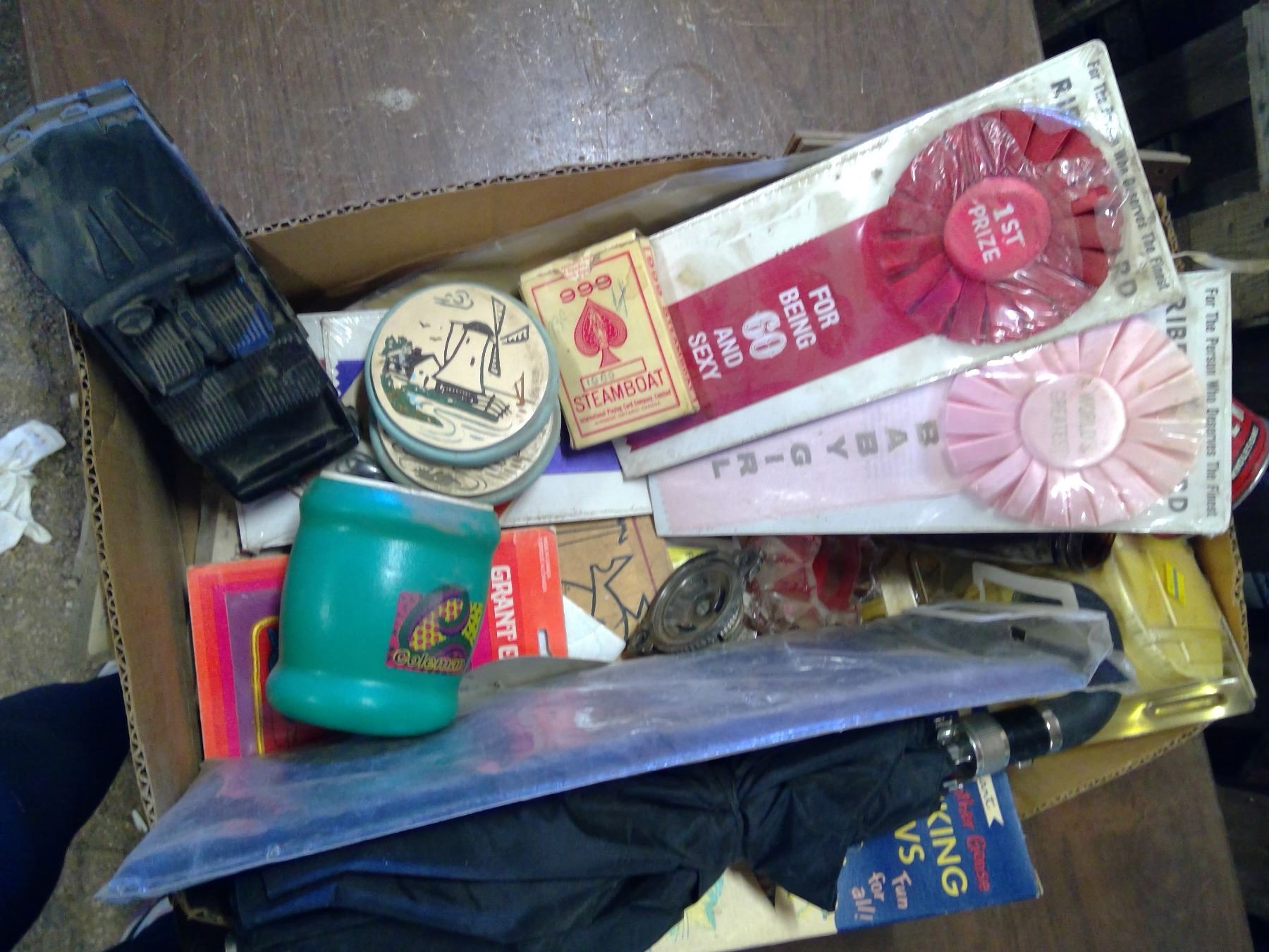 BOX OF MISC, UMBRELLA, COLEMAN BEER COZY, PRIZE RIBBONS, ECT.