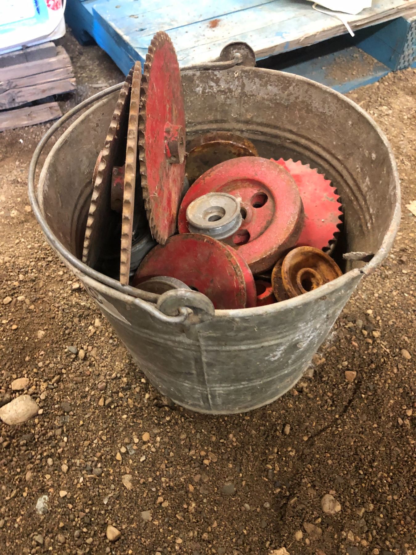 BOX OF OLD GEARS AND PULLIES IN A OLD VINTAGE PAIL