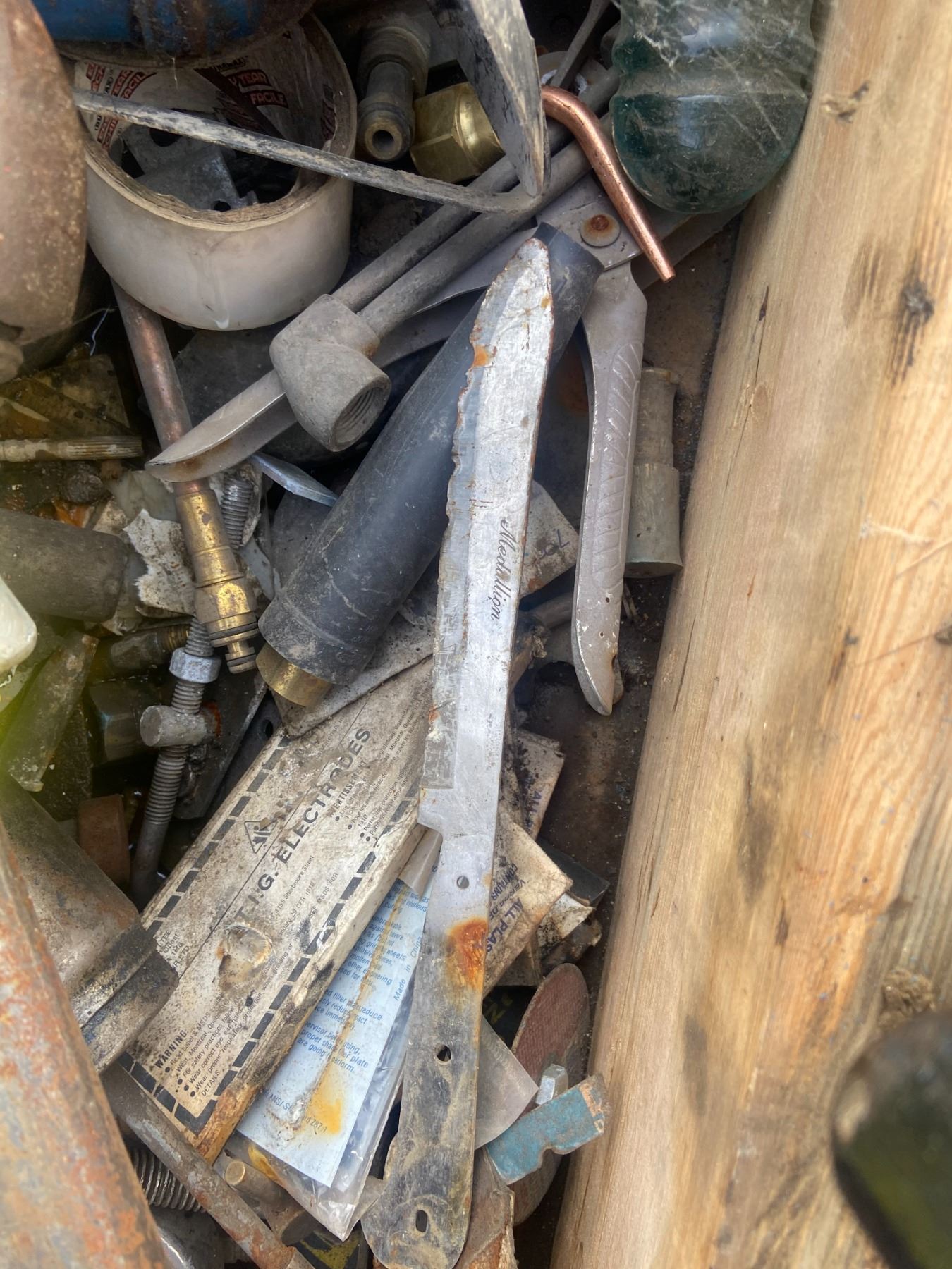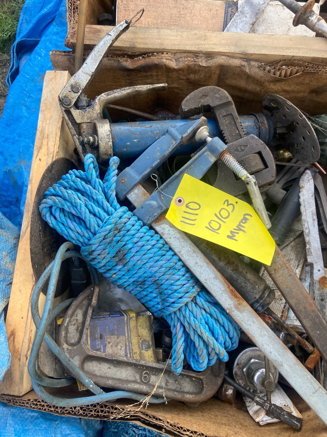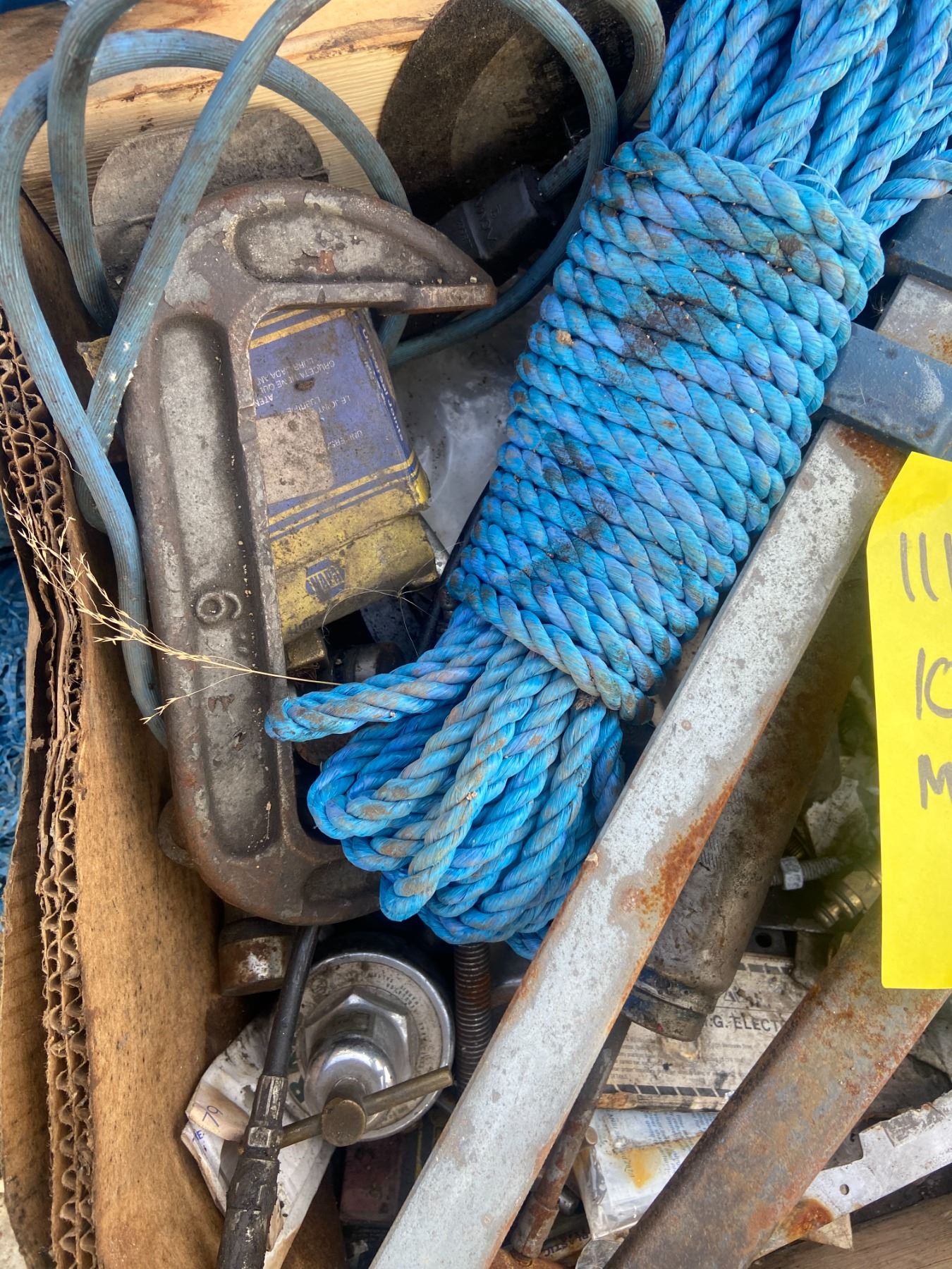 BOX OF ROPE, C CLAMPS, STEEL CUTTING DISC, OIL CANISTER