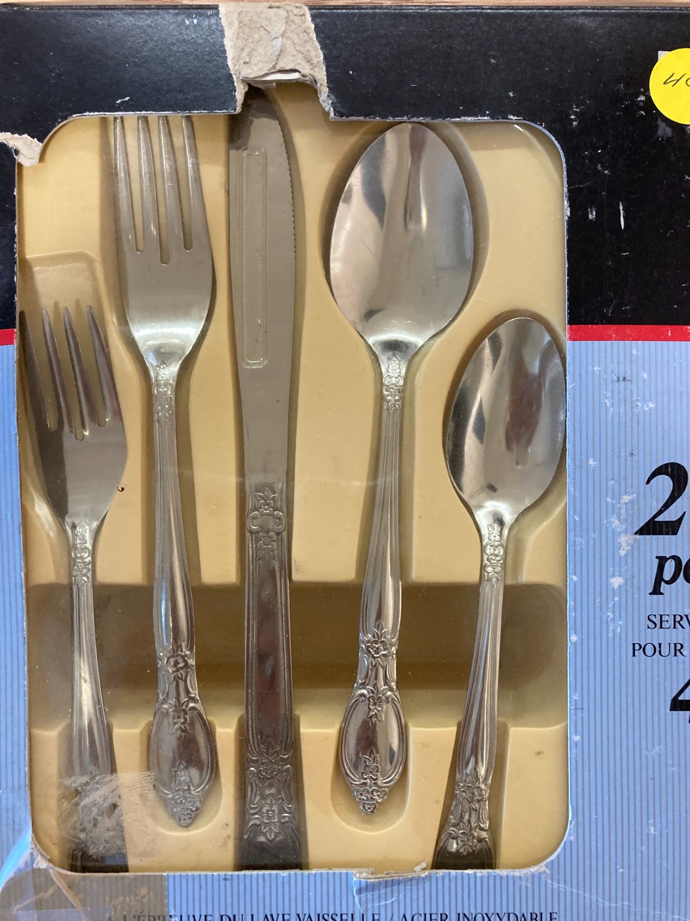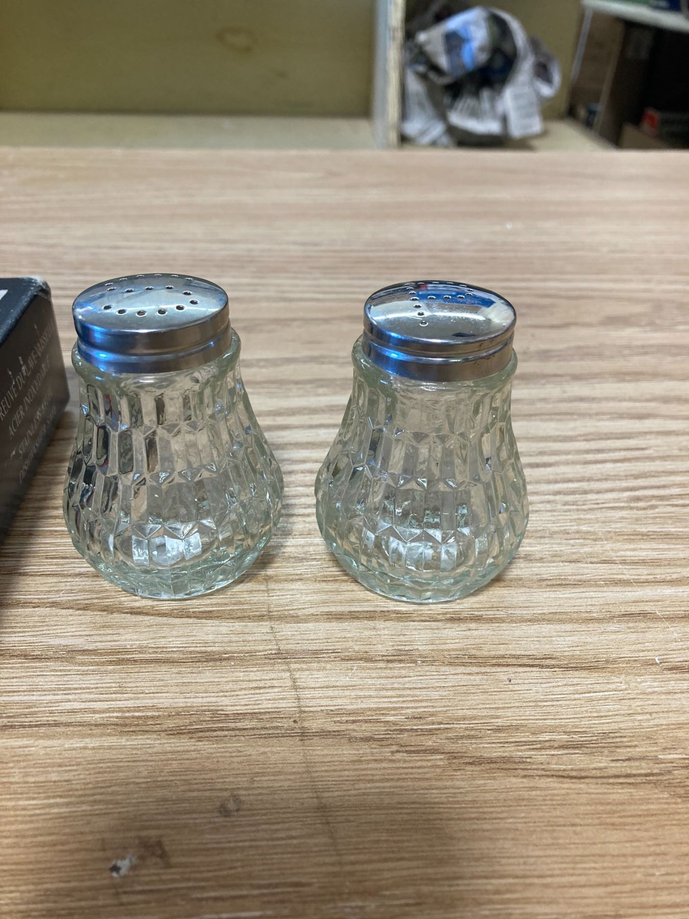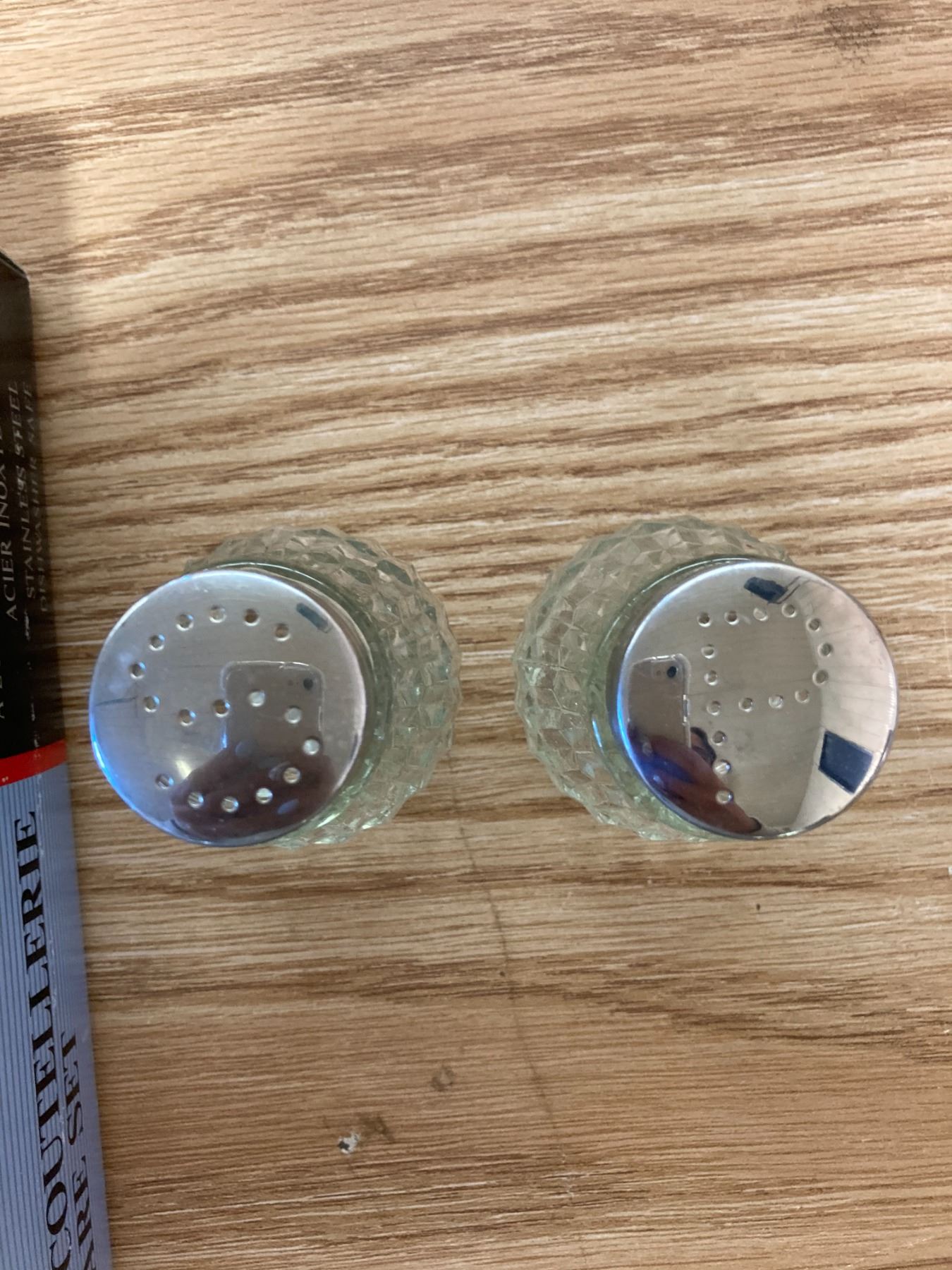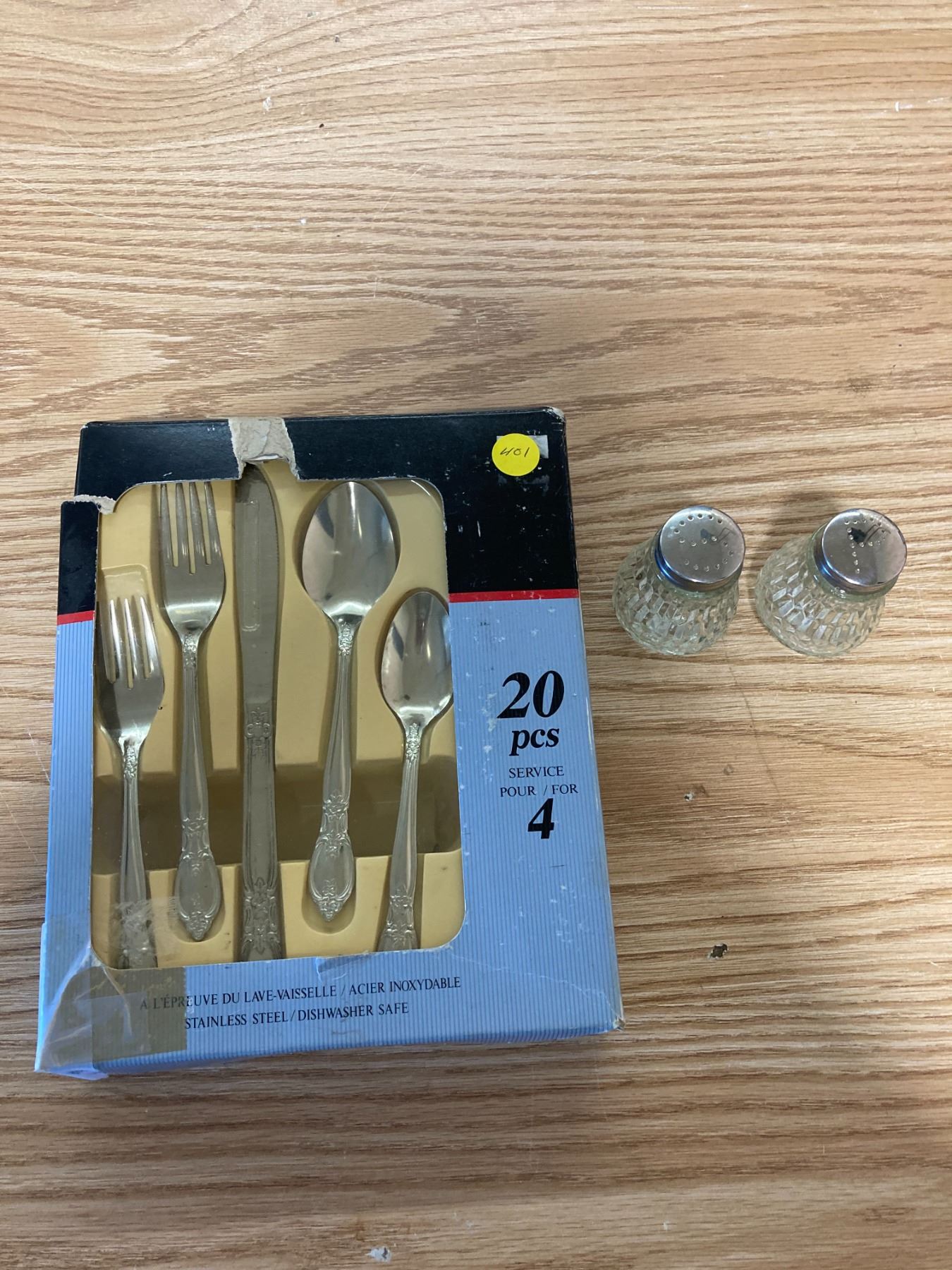 BOX OF SILVER WARE + SALT AND PEPPER SHAKER