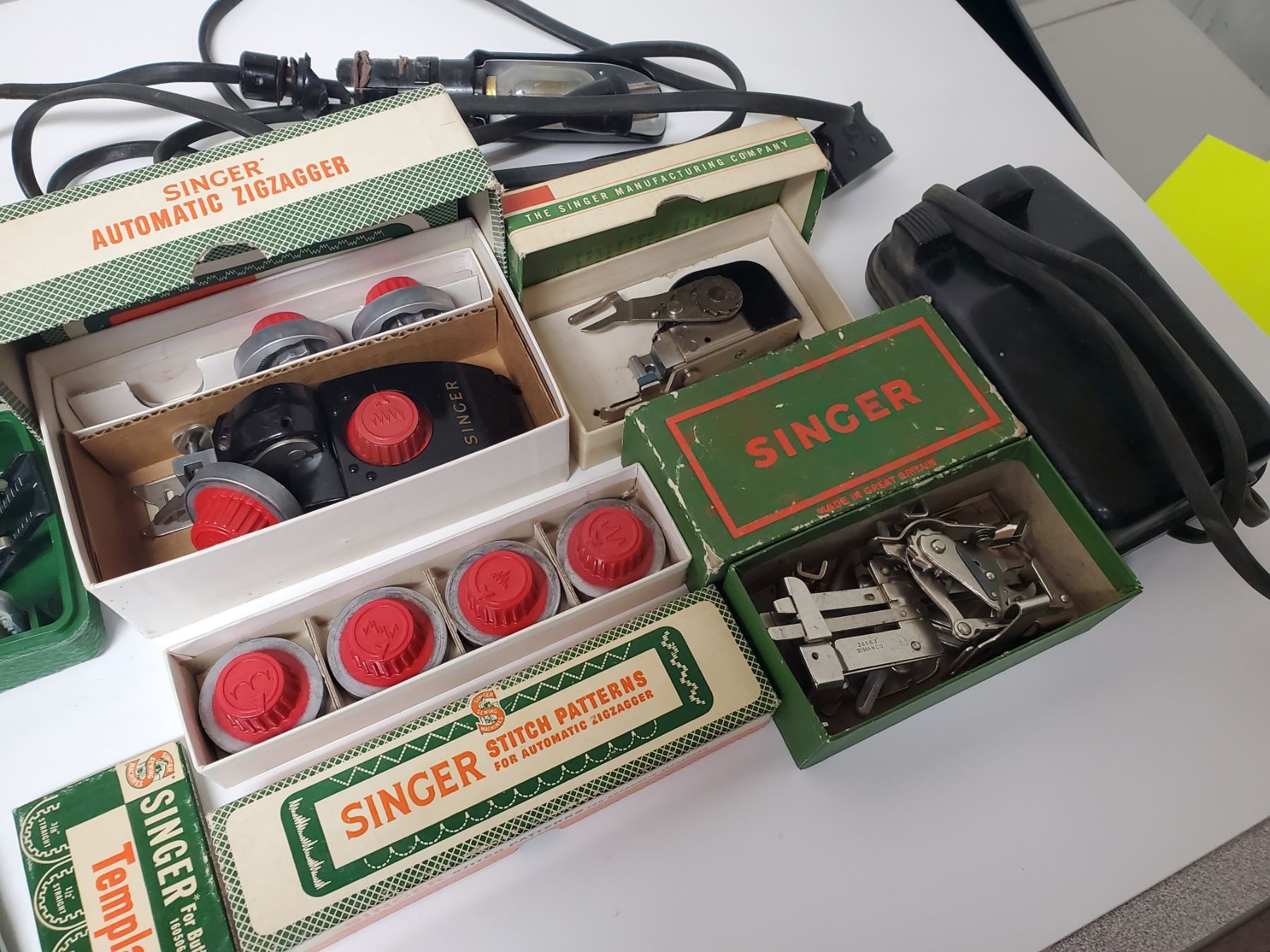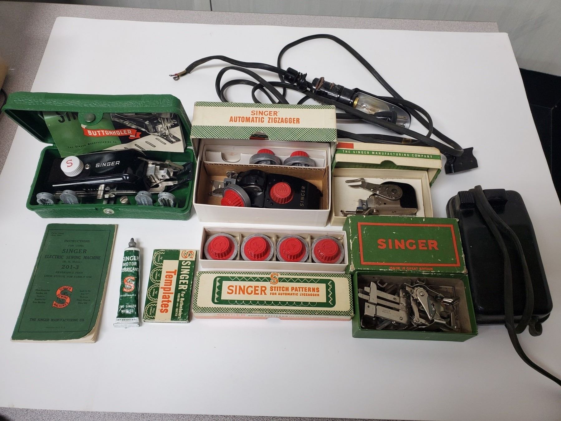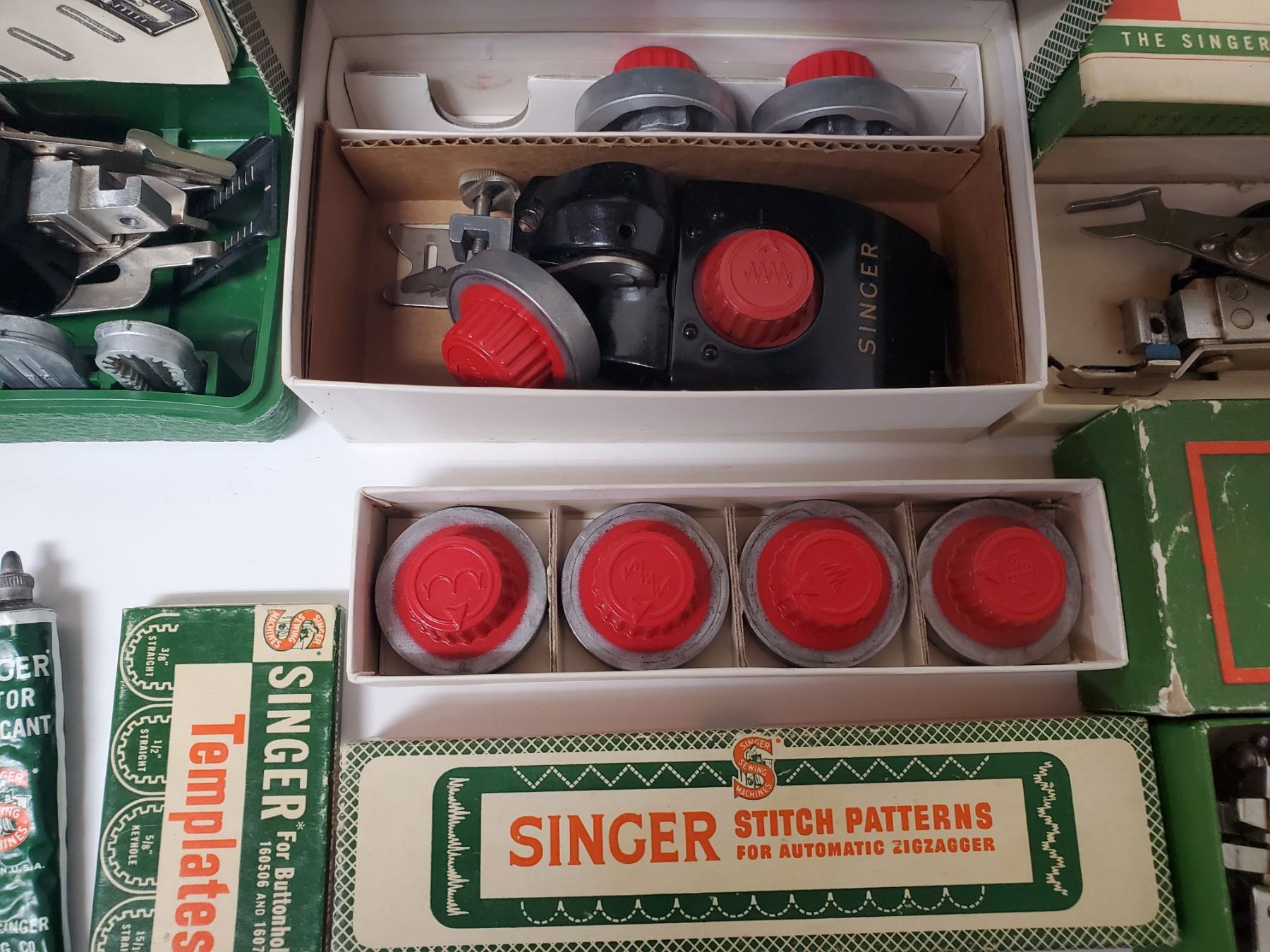BOX OF SINGER SEWING MACHINE ACCESSORIES