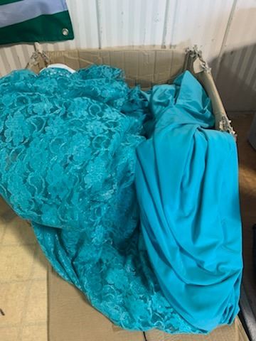 BOX OF TURQUOISE MATERIAL/ LACE AND STRETCH FABRIC/ ENOUGH TO MAKE 3 INFINITY LONG DRESSES with misc wedding stuff