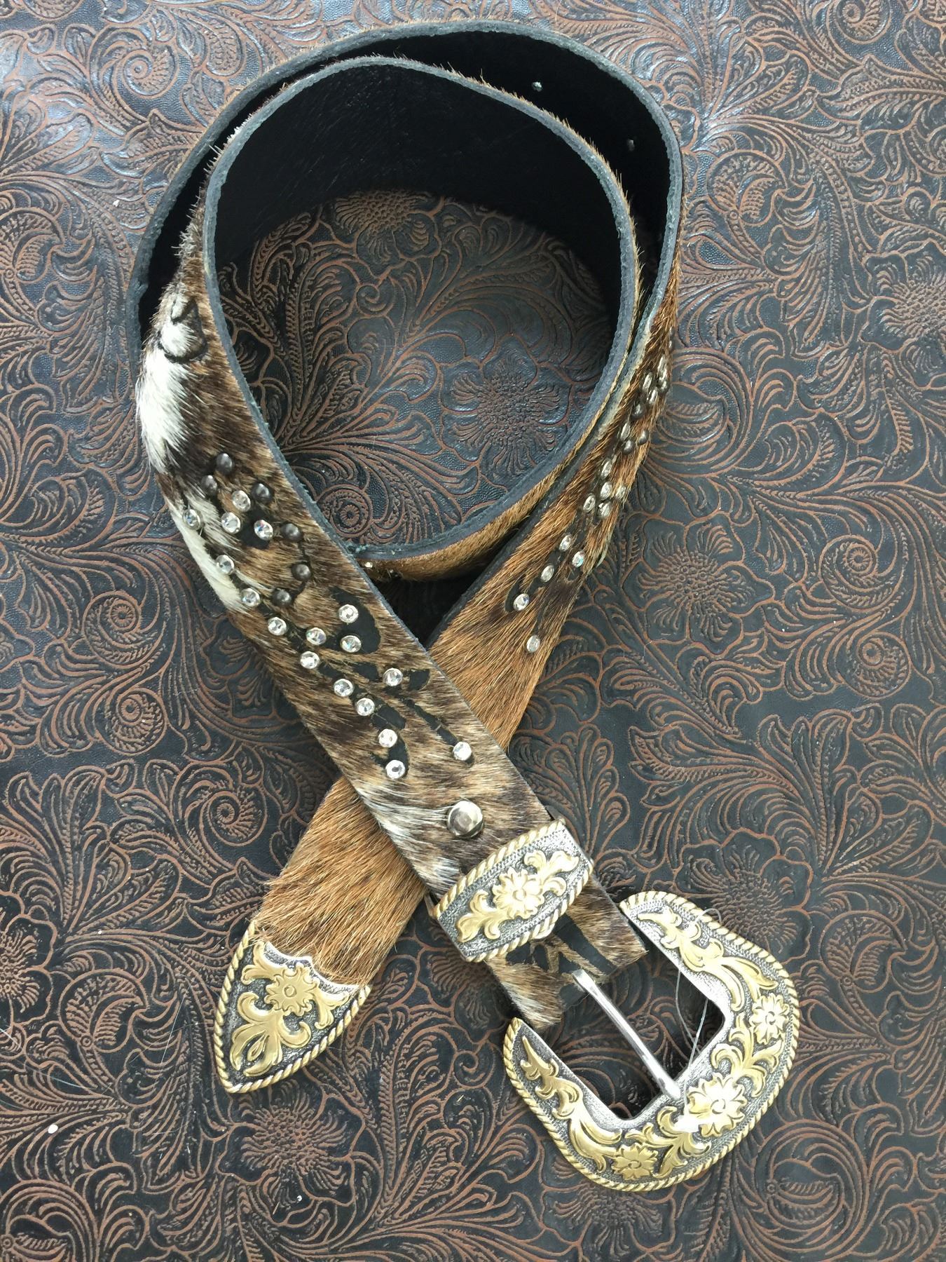 BROWN LEATHER HAIR ON HIDE BELT/WESTRN BUCKLE/46" END TO END/ONE OF A KIND